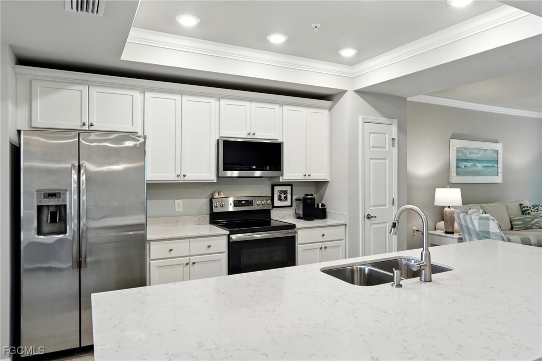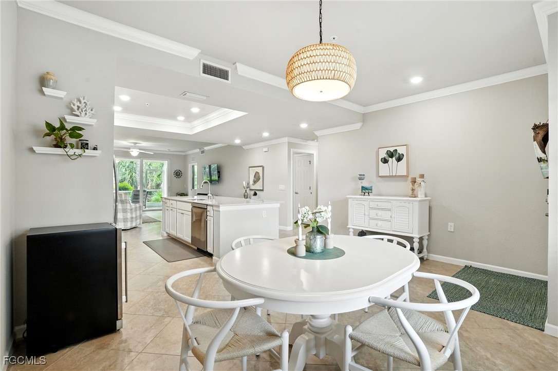 Inside, the unit has been thoughtfully modernized: white/grey granite countertops, a large kitchen island, new soft-close wood cabinets (2024), LG WiFi-enabled microwave (2025) & quiet dishwasher (2024). The bathrooms gleam with white quartz, new cabinetry, brushed-nickel fixtures & double vanity in the primary bath. 2024 also brought fresh interior paint; oversized tile flooring laid on the diagonal (updated grout); and both bathrooms have bidet toilets (2023). Tray ceilings, crown molding & ceiling fans with remotes add elegance throughout. Impact sliding glass doors provide peace of mind and excellent light.