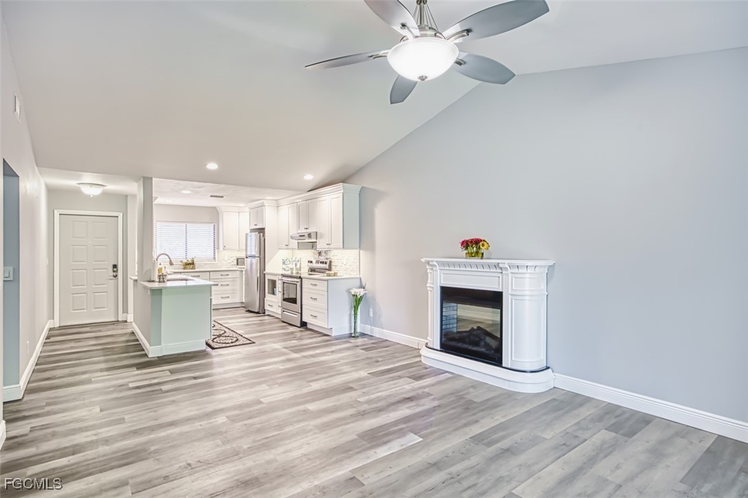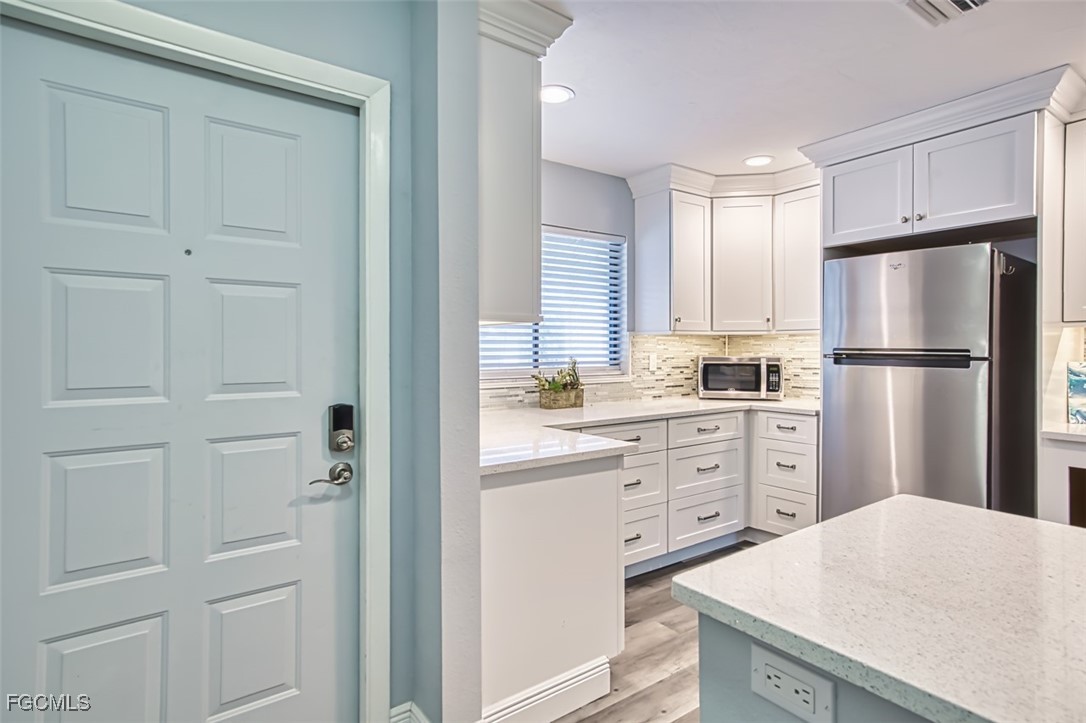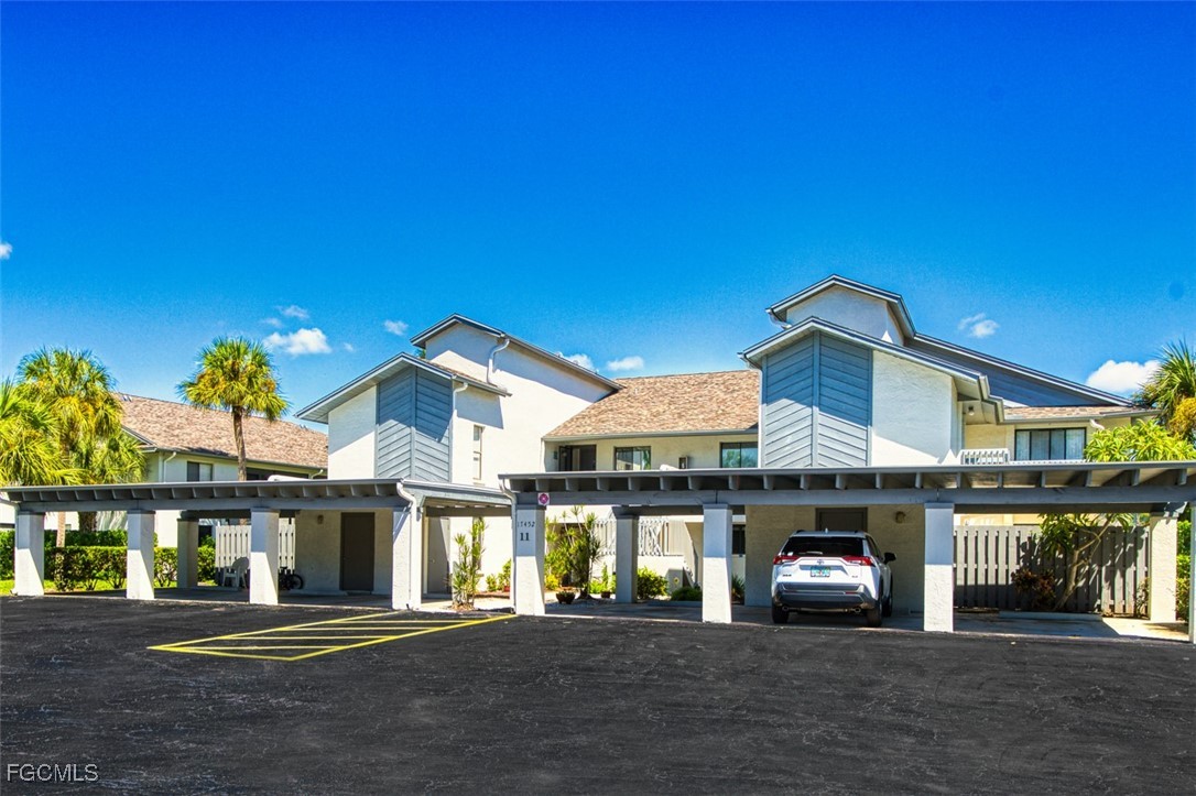 This LUXURIOUS PENTHOUSE condo awaits you! Beautifully UPDATED END-UNIT, flooded with natural light and treetop views, is sure to impress any buyer. NO SPECIAL ASSESSMENTS TO WORRY ABOUT! This stunning condo offers 2 bedrooms and 2 bathrooms on a SPLIT FLOOR PLAN spanning nearly 1,100sqft, laundry in residence with W/D included, and is perfect for those seeking a modern and convenient lifestyle. The SPACIOUS living area features 30' DOUBLE-INSLATED CEILINGS, a cozy FIREPLACE, and neutral LVT & tile flooring throughout--NO CARPET! The EXPANDED & OPENED KITCHEN is a chef's dream with QUARTZITE counters, an island, STAINLESS STEEL appliances, and ample storage in WHITE SHAKER CABINETS. NEW A/C & NEW ELECTRICAL PANEL offer comfort and peace of mind. Enjoy the convenience of an EXTRA STORAGE ROOM and CARPORT, providing plenty of room for all your belongings. Take advantage of this PET-FRIENDLY community's amenities: pool, spa, tennis, pickleball, shuffleboard, and even a vehicle wash station! Newport Glen is ideally located near ample shopping, dining, and entertainment options, making it easy to enjoy all that the area has to offer. Plus, with a short drive to RSW International Airport and SWFL's white-sand BEACHES, you'll have easy access to travel and leisure activities. Don't miss out on this incredible opportunity to own this rated "BEST VALUE BUY" in Newport Glen. Whether you're looking for a permanent residence, vacation getaway, or investment opportunity-- this condo has everything you need for a comfortable and stylish living experience!