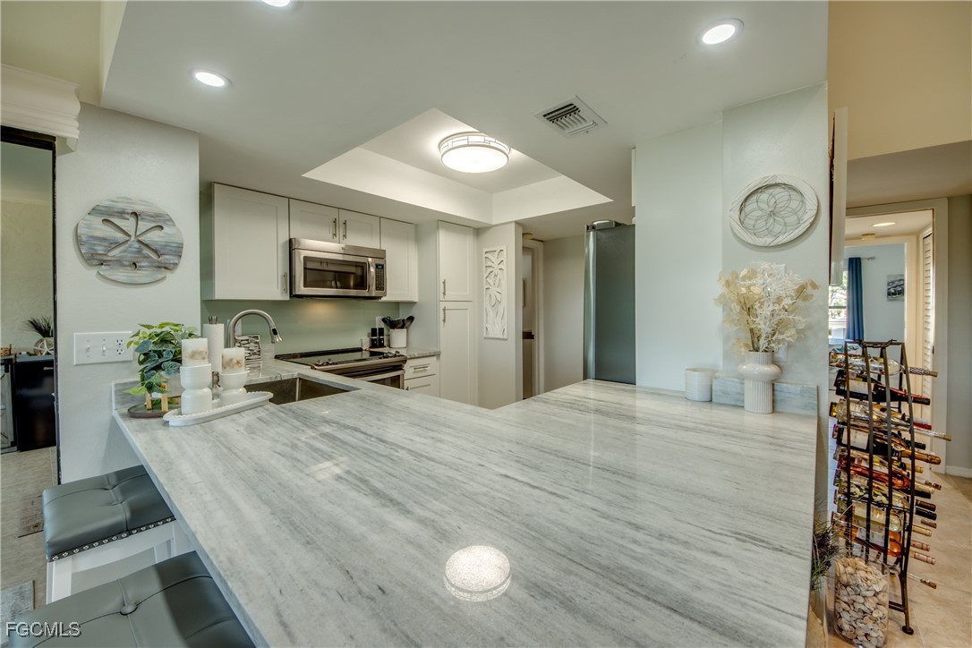 Modern kitchen with white cabinetry, ample storage, and pull-out drawers