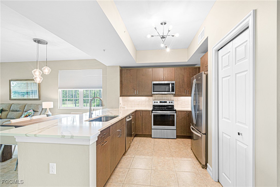 TURNKEY 3 Bedroom Vizcaya Model Condo & PRICED TO SELL NOW! This "End-Unit" Condo is located at the end of the Palazzo cul-de-sac on a Premium Privacy Lot. PRIVATE & PEACEFUL plus IMPACT WINDOWS & DOORS! This Beautiful Home has recently been Professionally Painted plus New Modern Cabinets added throughout the Home w/Soft-close Drawers! Amazing One-level Quartz Countertop added in the Kitchen & even both Bathrooms. The Stainless-steel Whirlpool Appliances are less than 3 years old. IMPORTANT: A.C. is 2023 & the Hot Water Heater is 2020. Review of the Updates: (1.) LIVING ROOM: Totally Open Concept plus Accordion Privacy Blinds & Updated Modern Lighting! (2.) KITCHEN: Tray Ceiling w/Modern Lighting plus dimmer switch, Large Walk-in Pantry, Beautiful One-level Quartz Countertop & NEW MODERN CABINETS w/Soft-close Drawers. (3.) MASTER BEDROOM: Impact Resistant Tinted Sliding Doors to the Lanai, Tray ceiling & Beautiful Privacy Curtains (4.) MASTER BATHROOM: Quartz Countertop & New Modern Cabinets w/Soft-close Drawers & a Large Walk-in Shower (5.) LANAI: Trifecta View: LAKE, GOLF & PRESERVE, IMPACT WINDOWS & DOORS/Tinted & 3 Panel Sliding Doors. Bonus: Even All the Beautiful Lanai Furniture Remains! (6.) NOTE: Even the Laundry Room has been updated with the New Modern Cabinets! (7.) The Large Storage Room is a Plus! IMPORTANT: Palazzo Residents & their Family & Friends get to Enjoy their very own Private Pool--ONLY FOR PALAZZO! YOUR FUTURE HOME IS LOCATED IN PELICAN PRESERVE ONE OF THE TOP 55+ COMMUNITIES IN THE U.S. LOCATED NEAR SWFL INTL. AIRPORT, SHOPPING & THE BEACHES!