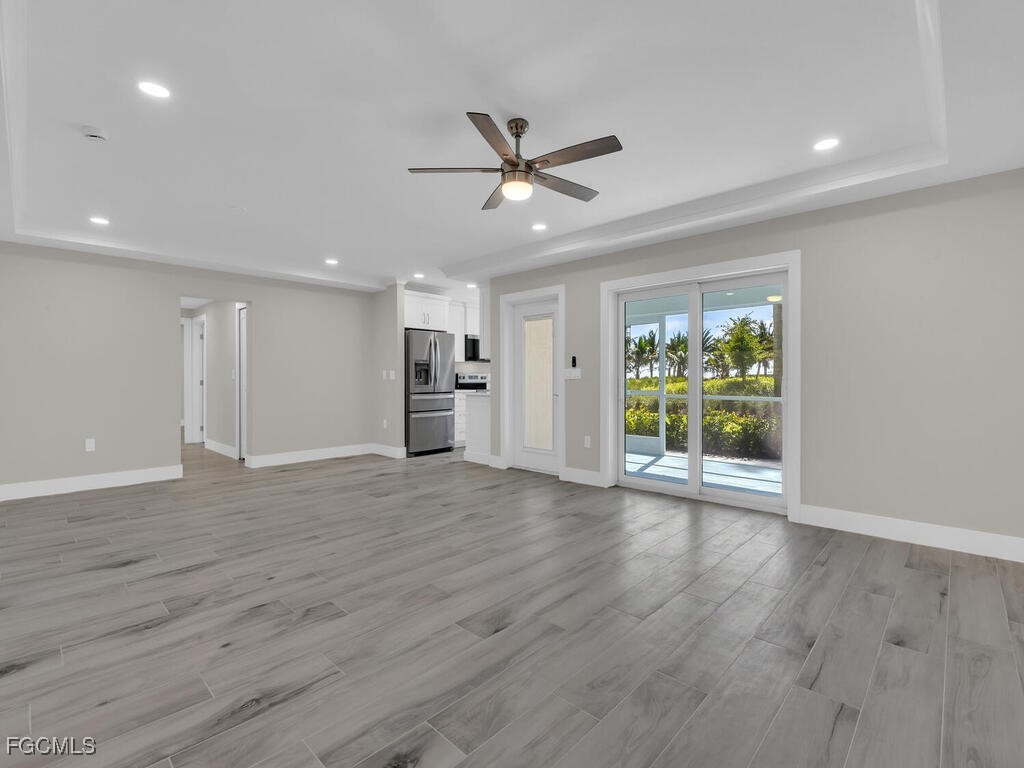 This fully updated 2-bedroom, 1-bath residence features elegant wood-look tile flooring throughout, creating a seamless and modern coastal feel. The open-concept living and dining area is spacious and inviting, enhanced by tray ceilings and an abundance of natural light. The kitchen is a highlight, boasting white wood cabinetry, quartz countertops, and brand-new stainless steel appliances—ideal for both everyday living and entertaining.