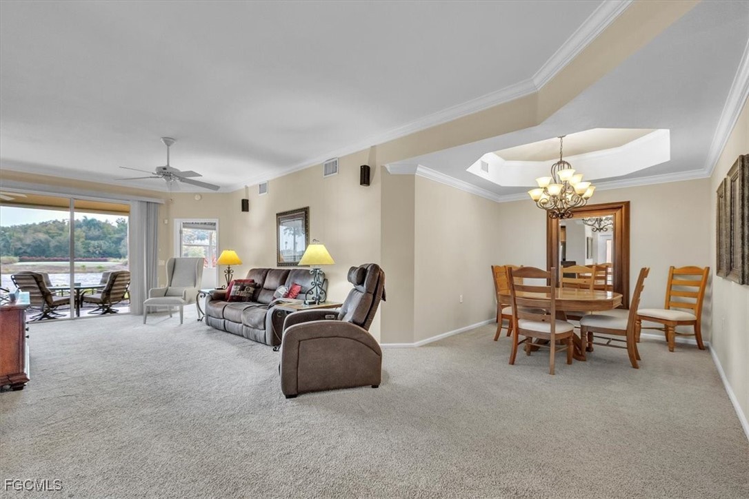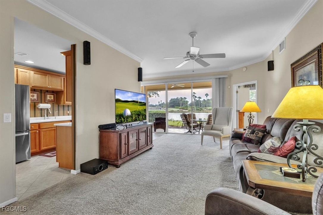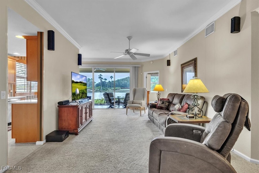 Great Opportunity to Own a First Floor Unit in the Gated Verandah Community in the Idlewild neighborhood. This exceptional coach home offers 1421 sq. ft. of living space and comes fully furnished. It boasts crown molding, a water softener for the entire condo, and has been freshly painted recently. With 2 bedrooms, a den, and 2 baths, this unit offers ample living space for residents. The panoramic super screened-in lanai features tile flooring and provides stunning views of hole #4 on the Jack Nicklaus designed golf course and a lake in the background. The two-car garage with epoxy floors adds convenience and luxury to the property. Upon entering the home, residents are greeted by a spacious family room and adjacent dining room with carpet and tile flooring. The kitchen is well-equipped with newer appliances, granite countertops, and plenty of cabinet space, including a nice pantry. The primary bedroom features a sleep number mattress, a large bathroom with dual sinks, a walk-in shower, and a large tub. The expansive den offers privacy with two French doors and is perfect for relaxation with leather recliners and wood flooring. The second bedroom and second bath provide ample space for guests or family members. Additional features of the home include a newer washer and dryer and AC unit. Residents can enjoy evening sunsets from the eastern exposure and spacious lanai while entertaining friends and family.