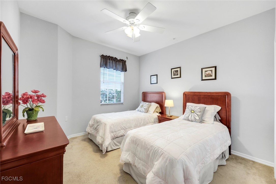 Turnkey and bright 2-bedroom, 2-bath condo with loft in the gated community of Calusa Palms, just about 15 minutes from Fort Myers Beach and close to shopping, dining and healthcare. This beautifully maintained home has been used only three months a year since new, feels barely lived in and is sold fully furnished (excluding personal items), allowing for immediate move-in. The open and airy layout is enhanced by cathedral ceilings, and the loft space works perfectly as a home office or guest area with pull-out sofa and desk. The comfortable furnishings include a newer adjustable king-size bed with headboard, leather sofa and loveseat, pub chair and an entertainment center with TV. The owner-friendly primary suite offers a lockable owner’s closet inside the walk-in, a relaxing garden soaker tub, and a new comfort-height toilet. The kitchen is fully stocked and ready for entertaining, and the private lanai features a wicker lounge chair and a durable Woodard fiberglass patio set. Peace of mind comes from recent replacements of the HVAC, water heater, dishwasher, garbage disposal and garage door opener; the building roof is approximately four years old. Permanent retractable hurricane shutters on all windows, a sprinkler system and 10-year smoke detectors provide added security. The interior presents fresh paint, new carpeting and ceiling fans in all major rooms, and the residence includes a lockable garage. Located far enough inland to avoid coastal storm impact, the property sustained no hurricane damage other than minor landscape cleanup. If you are looking for a meticulously cared-for, turnkey condo in a prime south Fort Myers location near world-class beaches and daily conveniences — this is it.