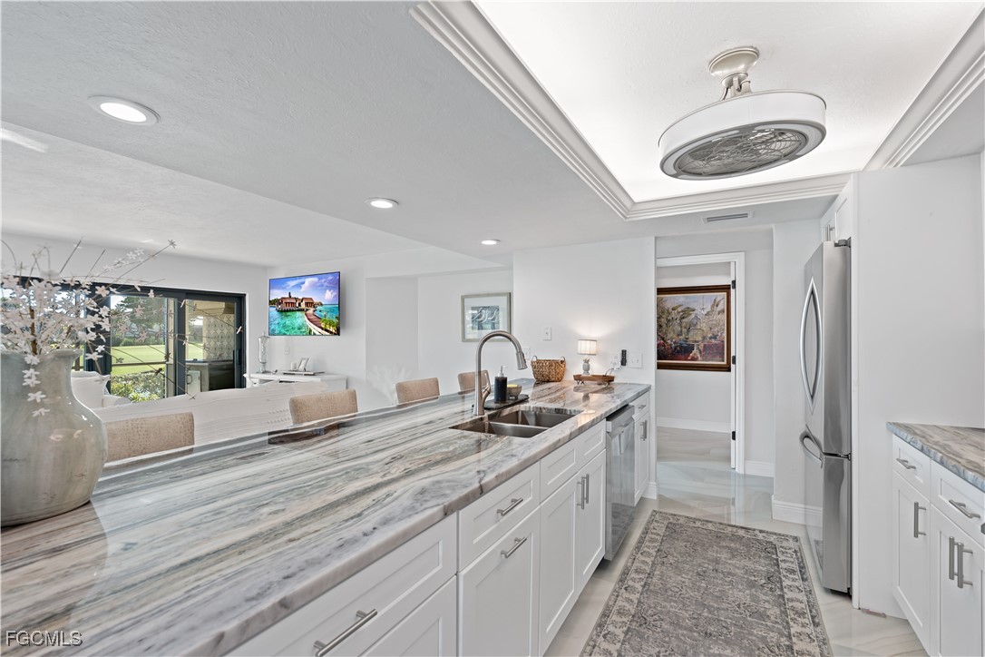Step inside to an open-concept floor plan featuring a bright, spacious living area with breathtaking views of the golf course and surrounding natural beauty. The brand-new kitchen offers sleek cabinetry, granite countertops, stainless steel appliances, and a large breakfast bar — perfect for entertaining or everyday living.