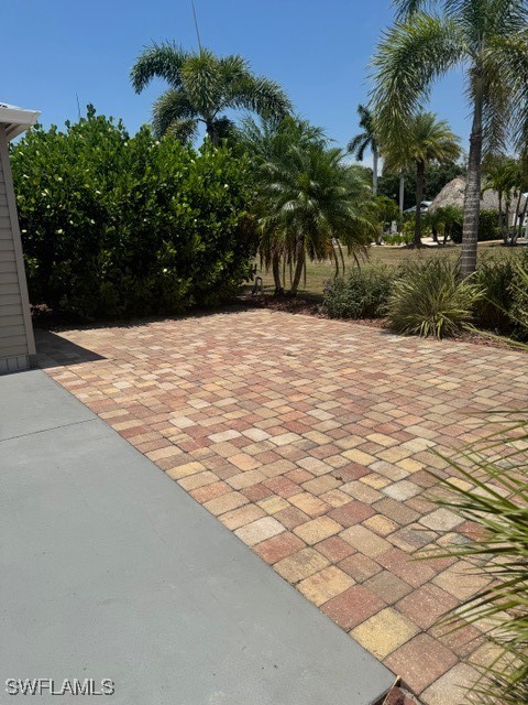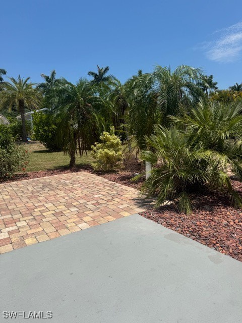 It's a painted concrete lot with an additional 5’ concrete on the side for added space, landscaped with rock, palm trees, various bushes, flowers, and an irrigation system. Has rear concrete curbing. Rear patio area measuring 15x30’ with pavers and privacy bushes on all three sides. Have two concrete ornamental statues on concrete pads. Landscape lighting setup with buried cable and landscape lights. Have a service that provides upkeep of vegetation pruning, fertilizer, and weed control.