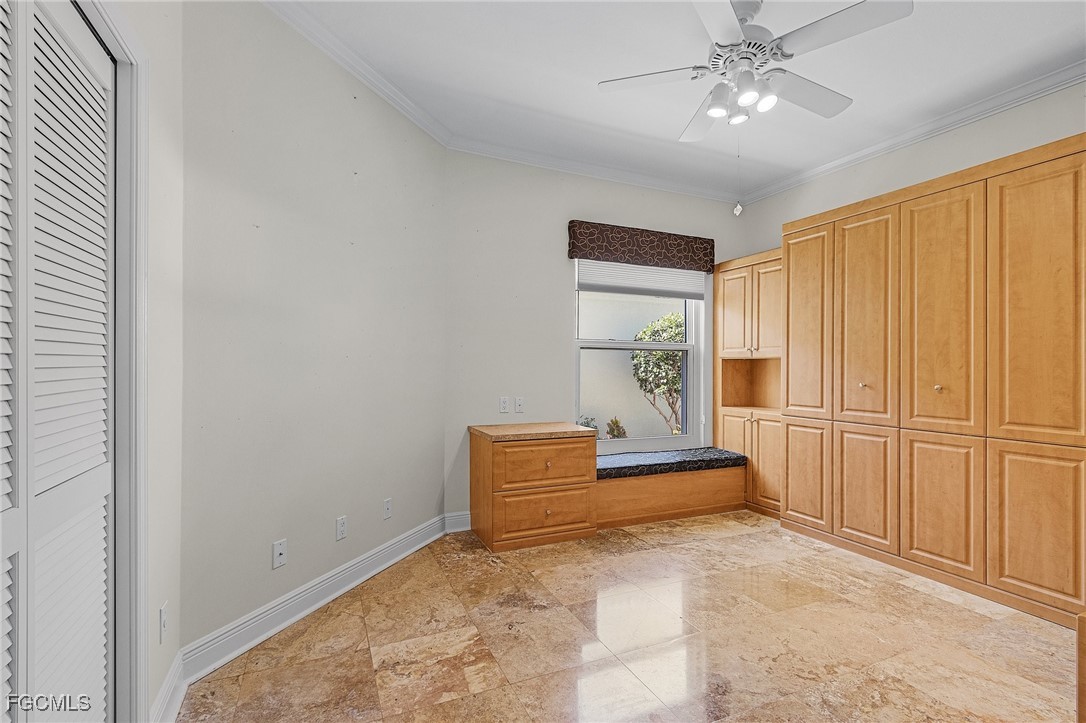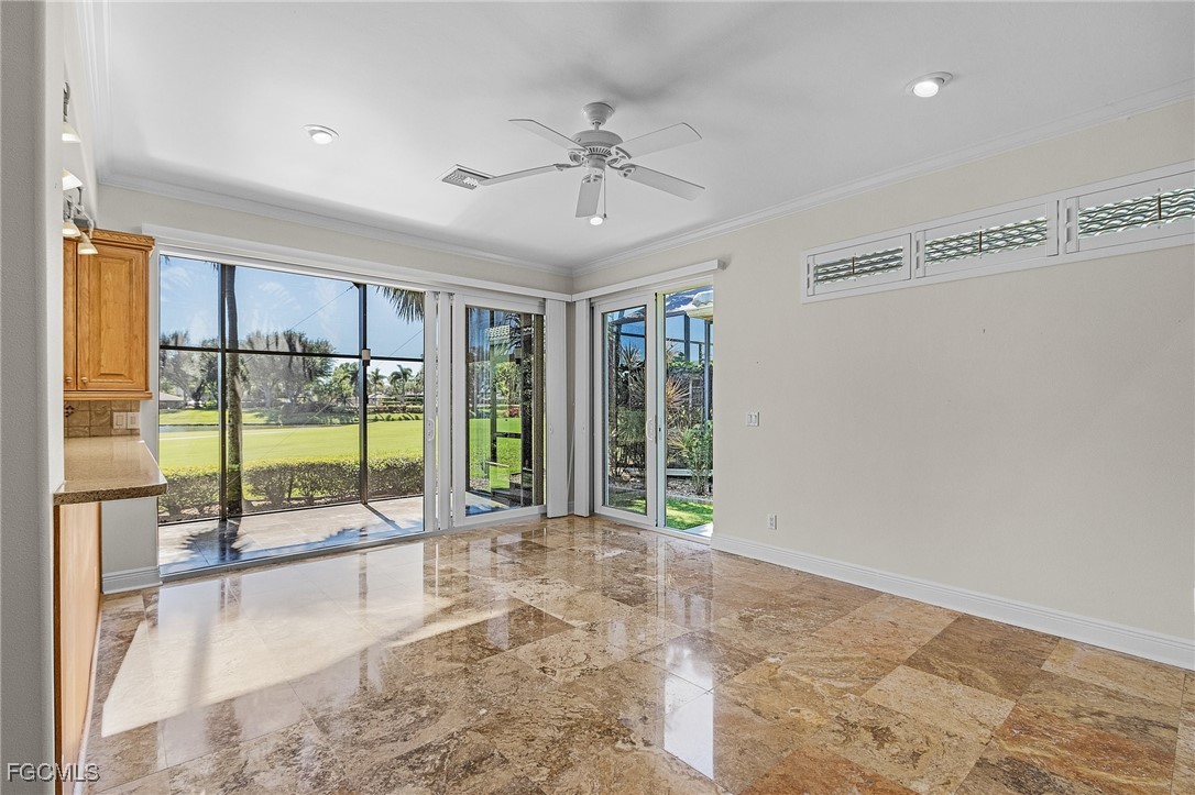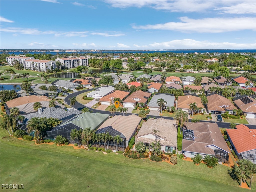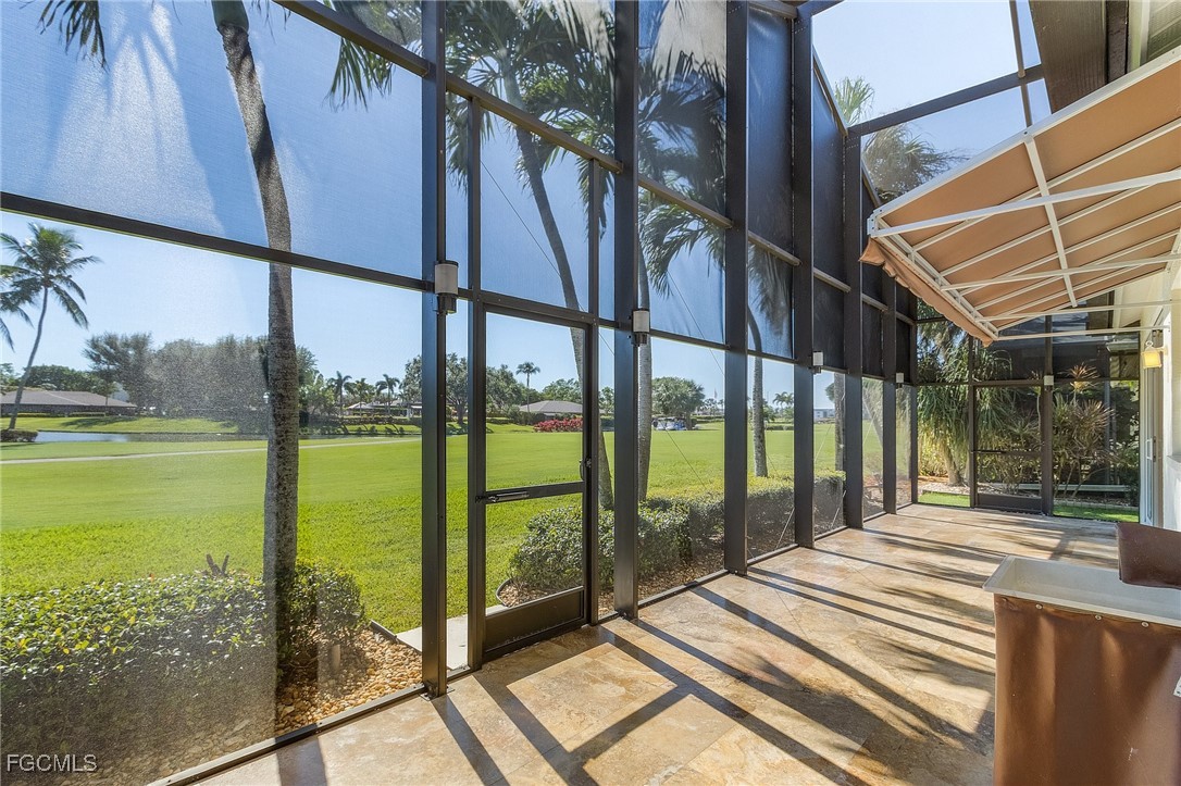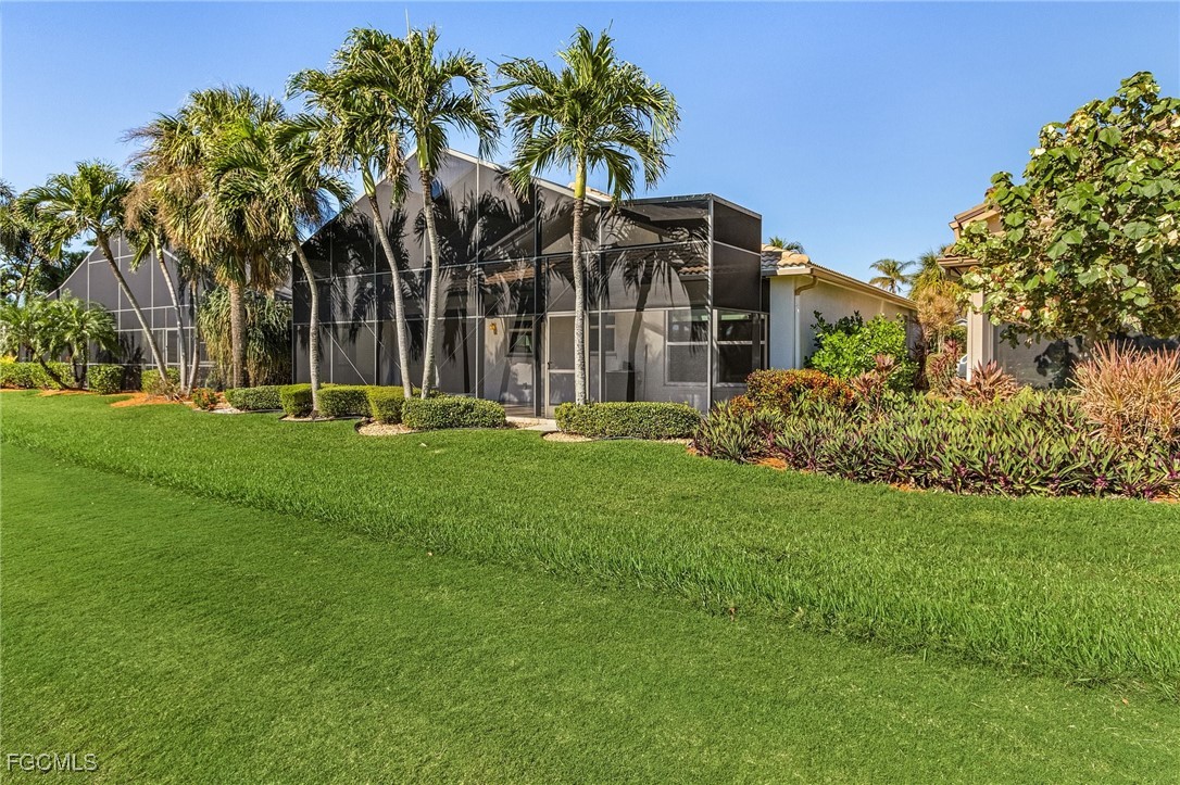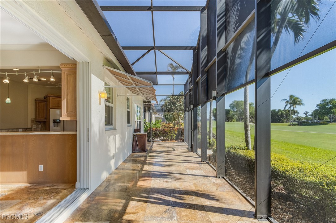 Boating, Tennis and Pickleball lovers - this is the gated community for you! Must see the BEST PRICED single-family home with the lowest HOA fee in THE LANDINGS! This is a beautifully maintained and immaculate home in highly desired Mariners Cove Village in The Landings Yacht Golf & Tennis Club. Situated on a golf course lot, you'll also love the terrific view across the fairway to the lake with a gorgeous fountain, even more beautiful after dark. This home has STUNNING polished travertine flooring in the main living areas and lanai. The updated kitchen has beautiful solid surface counters, lighter wood cabinets and plenty of storage. Two raised bar areas offer casual seating for dining and entertaining. A third bedroom doubles as an office with a murphy bed. All IMPACT doors and windows throughout, including the beautiful leaded glass front door. Upscale window treatments throughout. An attached oversized two-car garage with workspace and lots of storage complete this home. Immaculate and move-in ready. Never had any flood problems. Located in The Landings Yacht Golf & Tennis Club, a premier gated community in southwest Fort Myers with a full-service gulf access marina, 18-hole golf course, Har-Tru tennis courts, pickleball, bocce, 2 dining venues, gorgeous grounds and lots of activity, close to some of the best beaches in the world. You deserve to live the dream!