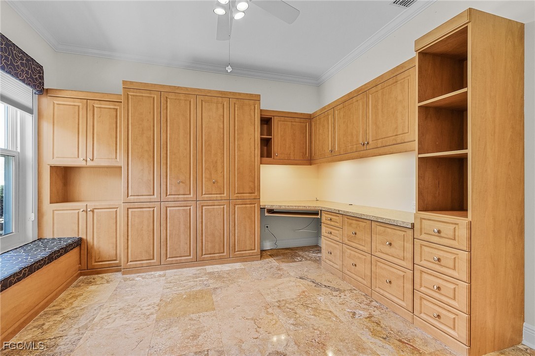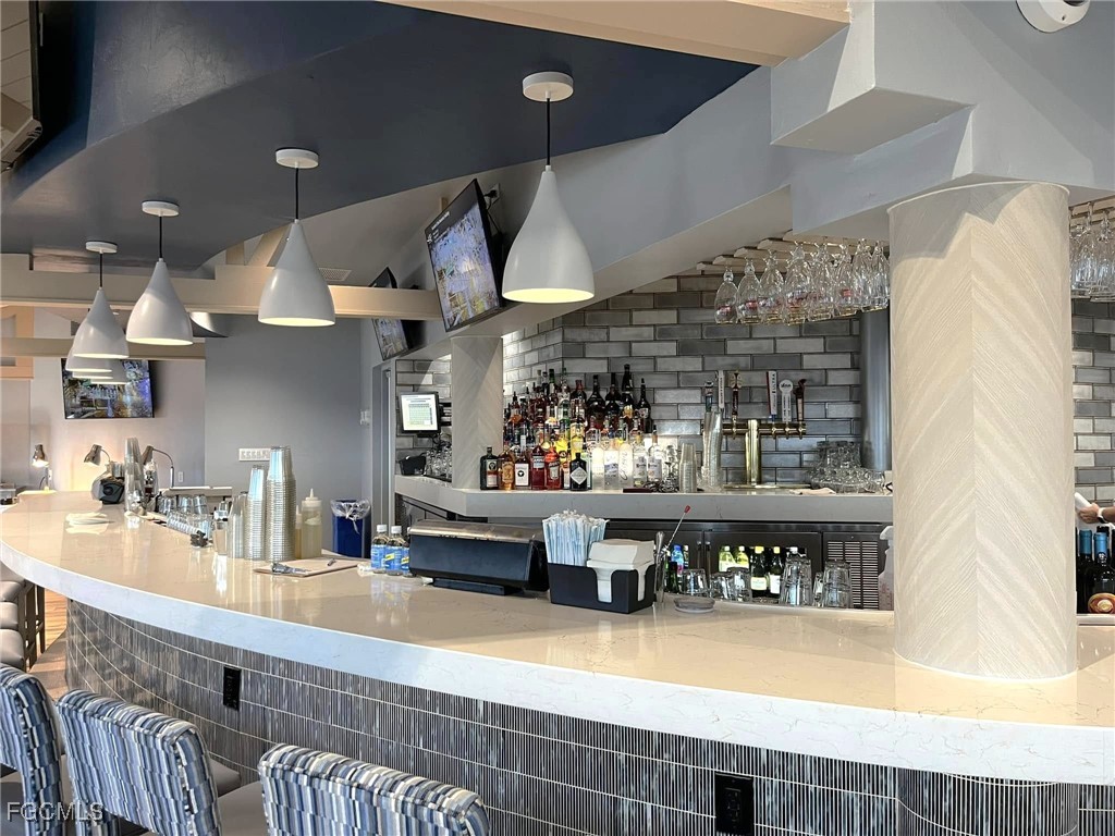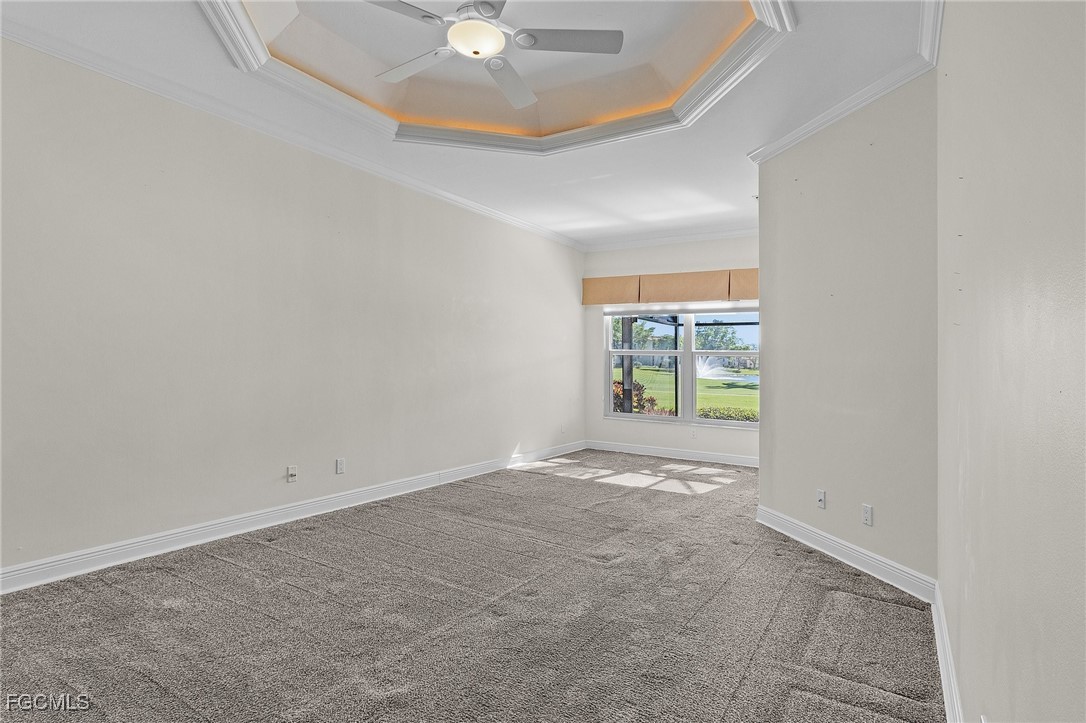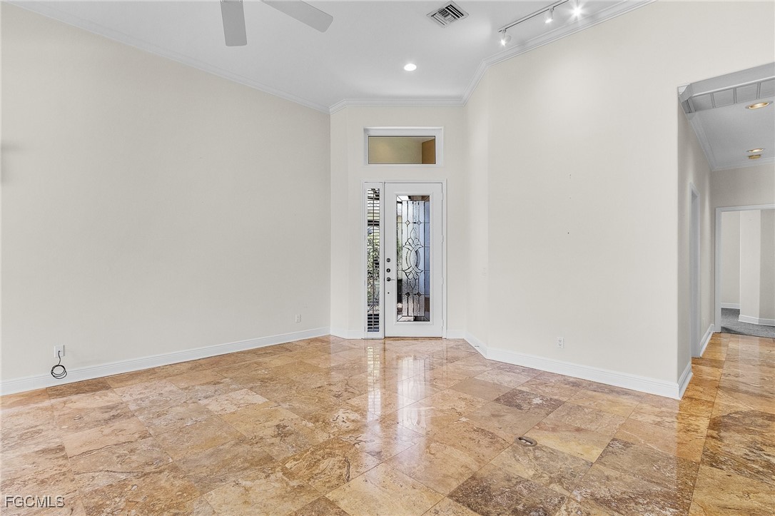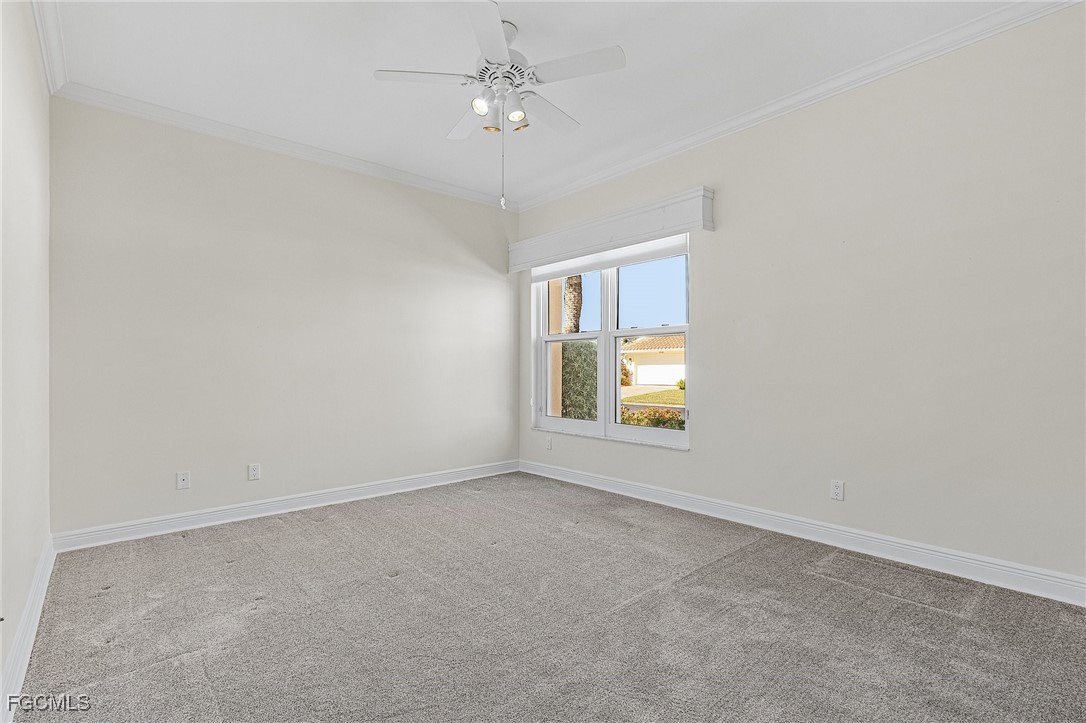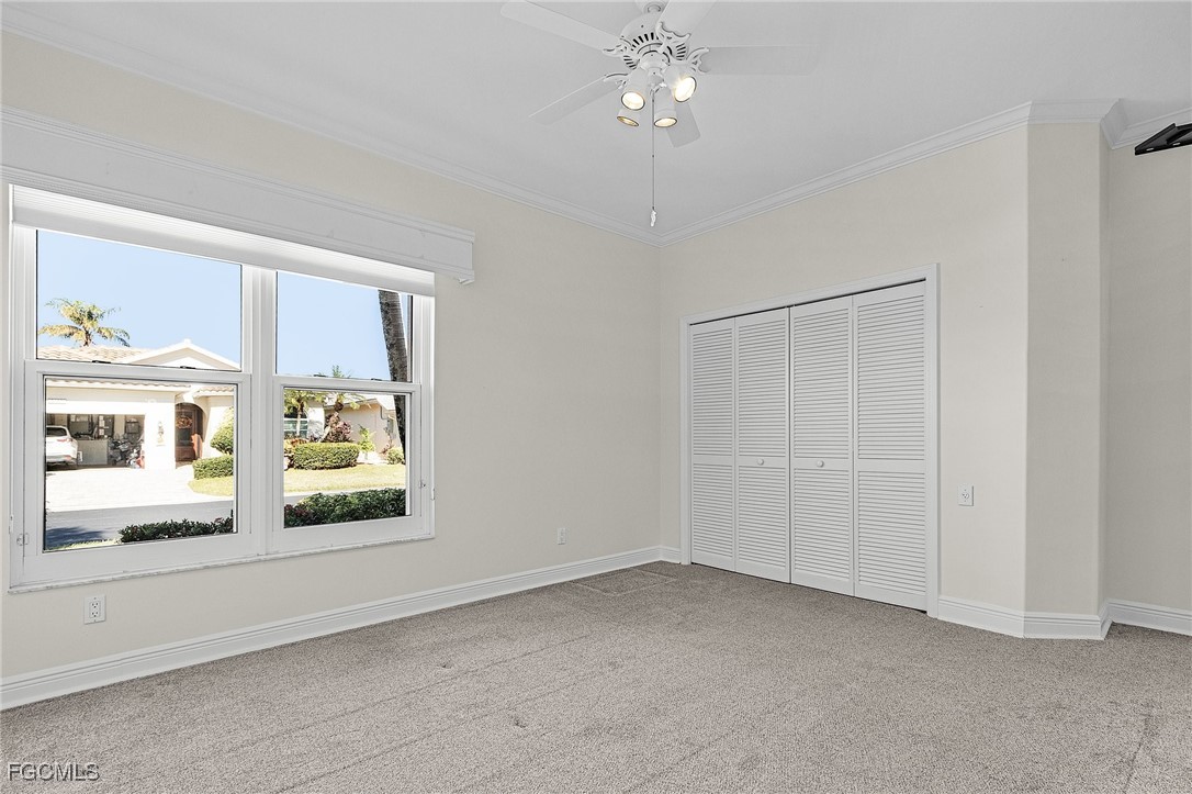 Boating, Tennis and Pickleball lovers - this is the gated community for you! Must see the BEST PRICED single-family home with the lowest HOA fee in THE LANDINGS! This is a beautifully maintained and immaculate home in highly desired Mariners Cove Village in The Landings Yacht Golf & Tennis Club. Situated on a golf course lot, you'll also love the terrific view across the fairway to the lake with a gorgeous fountain, even more beautiful after dark. This home has STUNNING polished travertine flooring in the main living areas and lanai. The updated kitchen has beautiful solid surface counters, lighter wood cabinets and plenty of storage. Two raised bar areas offer casual seating for dining and entertaining. A third bedroom doubles as an office with a murphy bed. All IMPACT doors and windows throughout, including the beautiful leaded glass front door. Upscale window treatments throughout. An attached oversized two-car garage with workspace and lots of storage complete this home. Immaculate and move-in ready. Never had any flood problems. Located in The Landings Yacht Golf & Tennis Club, a premier gated community in southwest Fort Myers with a full-service gulf access marina, 18-hole golf course, Har-Tru tennis courts, pickleball, bocce, 2 dining venues, gorgeous grounds and lots of activity, close to some of the best beaches in the world. You deserve to live the dream!
