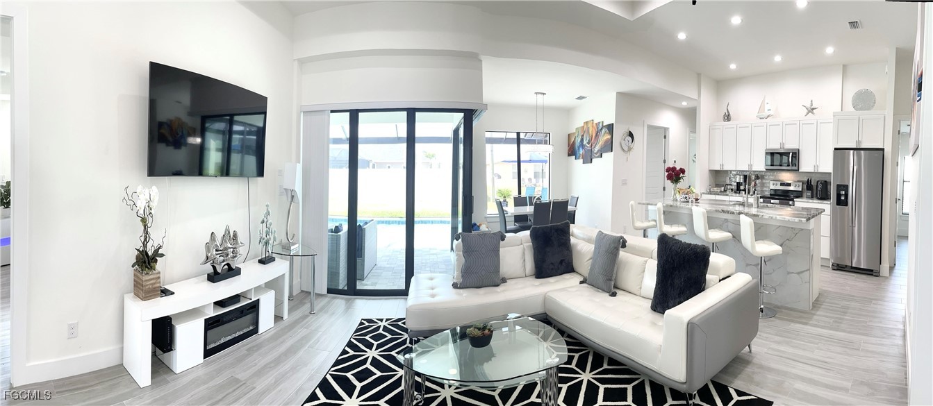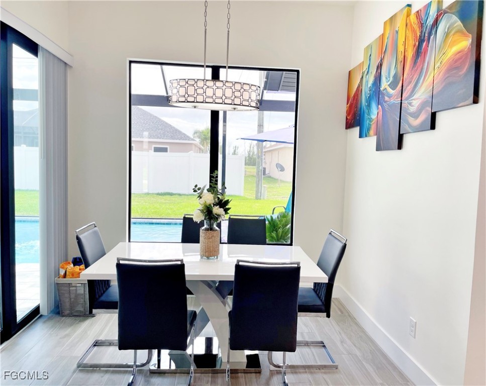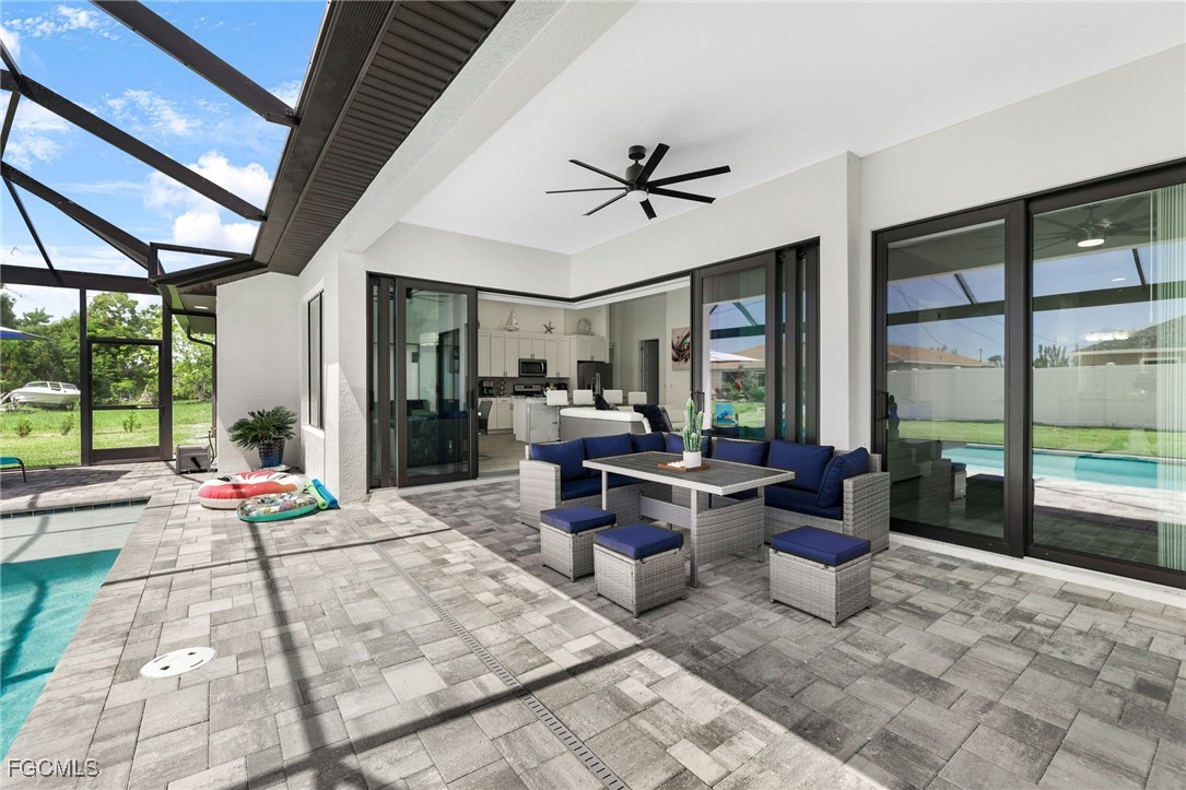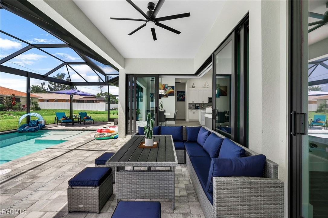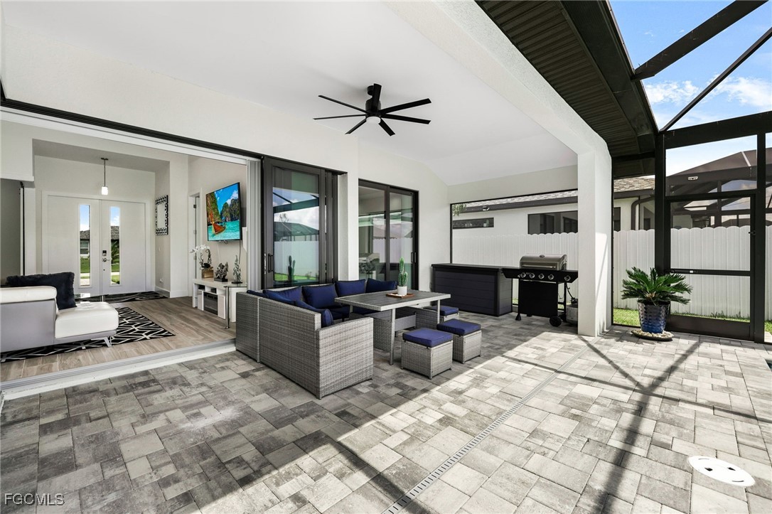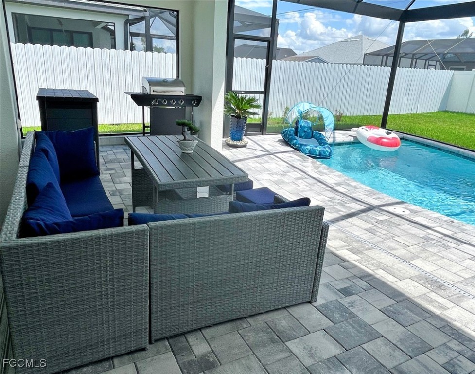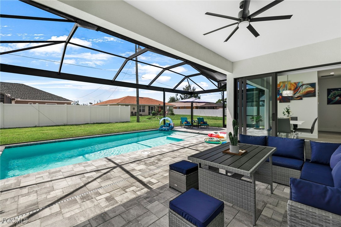 Step into luxury with this breathtaking 4-bedroom plus den, 2-bathroom haven, complete with a spacious 3-car garage and a dazzling private pool. As you enter through elegant double doors, a grand, light-filled foyer welcomes you, showcasing premium large-plank tile flooring that flows seamlessly throughout. The gourmet kitchen is a chef’s dream, featuring sleek upgraded wood cabinetry, shimmering granite countertops, top-tier stainless steel appliances, and a chic eat-in breakfast bar. Unwind in the opulent master suite, where a large soaking tub and dual sinks elevate the spa-inspired bathroom. Three sets of impact-resistant sliding glass doors flood the home with natural light and provide effortless access to the expansive paver lanai, where a sparkling crystal-blue pool awaits, enhanced by a new pool heater and a state-of-the-art upgraded pool enclosure. A convenient pool bath ensures seamless entertaining for your next barbecue or gathering. Surrounded by a brand-new fence for ultimate privacy, this home is move-in ready or a prime Airbnb short-term rental investment, with negotiable high-end furnishings to suit your vision. Nestled in a rapidly growing Cape Coral neighborhood with central water and sewer, this paradise is just moments from top-rated schools, fine dining, and scenic waterways. Don’t miss your chance to own this unrivaled gem—perfect for luxurious living or a high-yield vacation rental! NEW FENCE, NEW Pool Heater, Furniture is negotiable!!