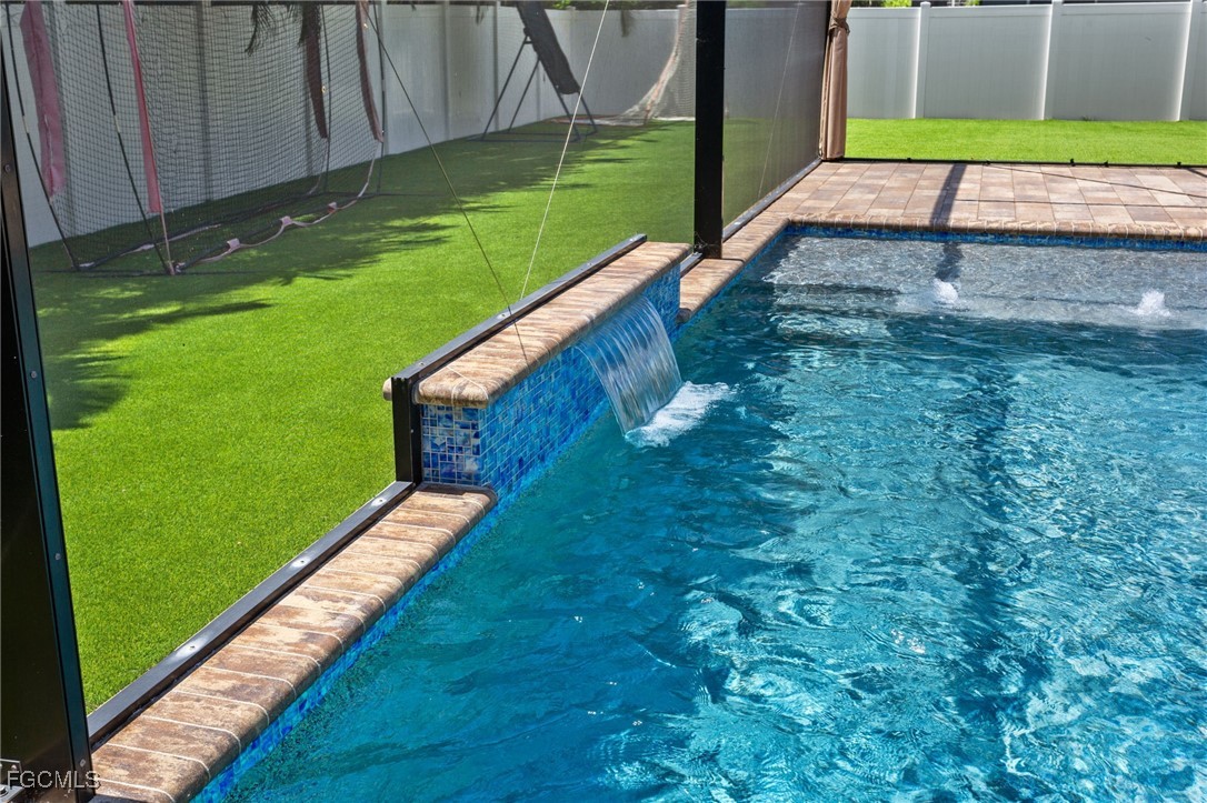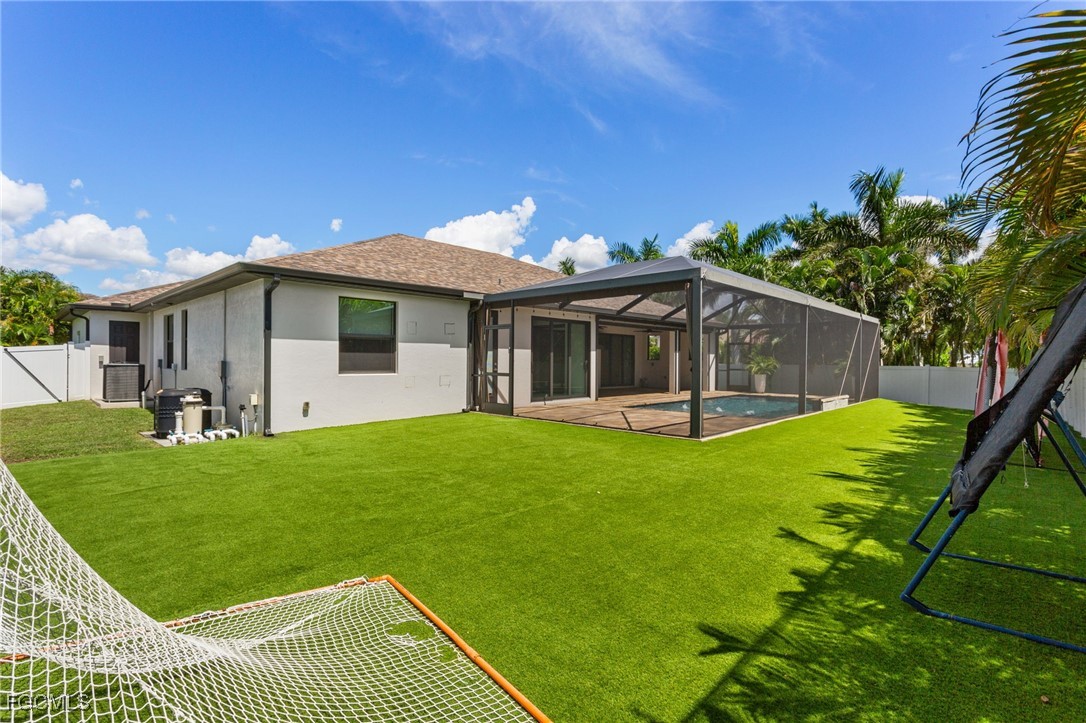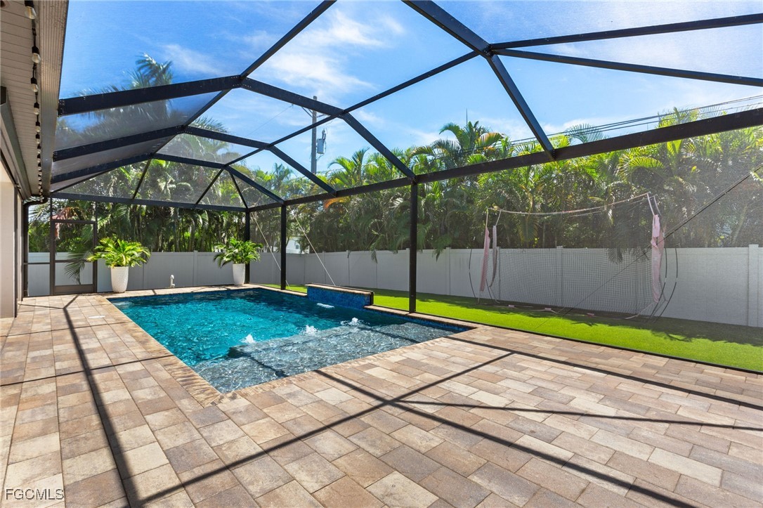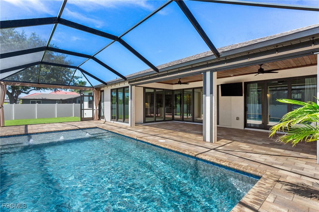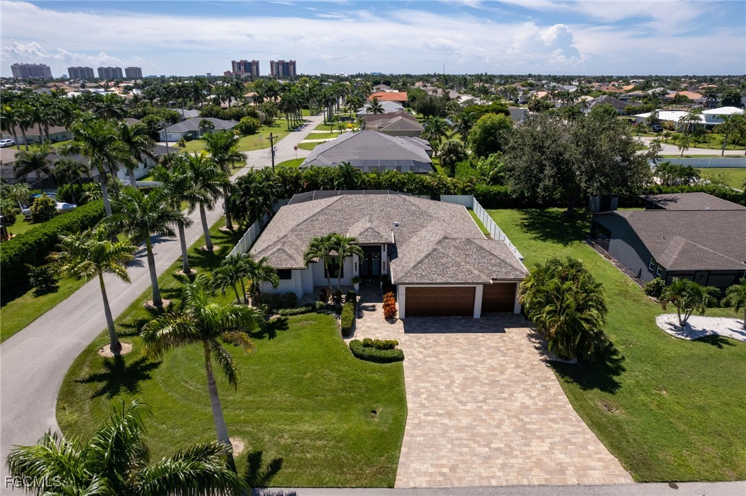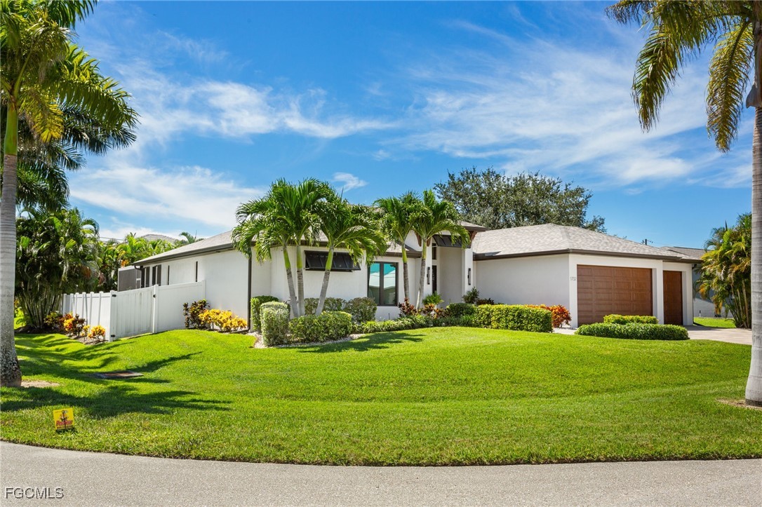 Located in the sought-after Southwest Cape Coral area, this stunning 3-bedroom + den, 3-bath home sits on an oversized corner lot with desirable Southern exposure. Designed for both comfort and style, this home features an open floor plan with soaring ceilings, elegant tray ceilings, and crown molding throughout—perfect for entertaining or relaxed living. Step outside to your private backyard oasis with a heated pool, sun shelf, tranquil water features, and a luxurious PebbleTec finish—ideal for enjoying Florida’s year-round sunshine. The heart of the home is the chef-inspired kitchen, boasting quartz countertops, a large waterfall island, custom cabinetry, and premium stainless steel appliances. Impact windows and doors throughout and automatic hurricane shutters for the lania. Barkyard is partially turfed, perfect for outdoor activities. No expenses spared in this meticulous home. Conveniently located just minutes from Cape Harbour, top-rated restaurants, shopping, schools, and beautiful parks, this home offers the perfect blend of convenience and tranquility. Whether you’re seeking a year-round residence or a luxurious winter retreat, this property is an exceptional opportunity in one of Cape Coral’s most desirable neighborhoods.