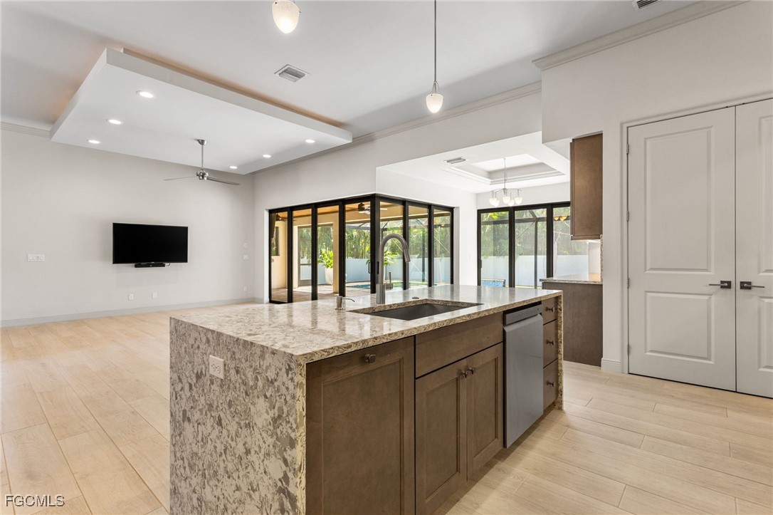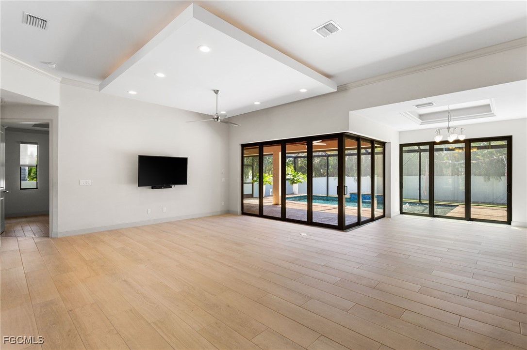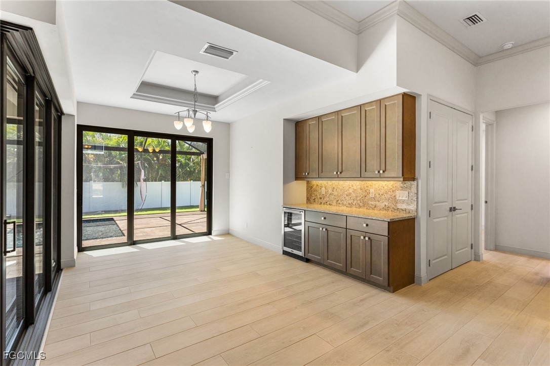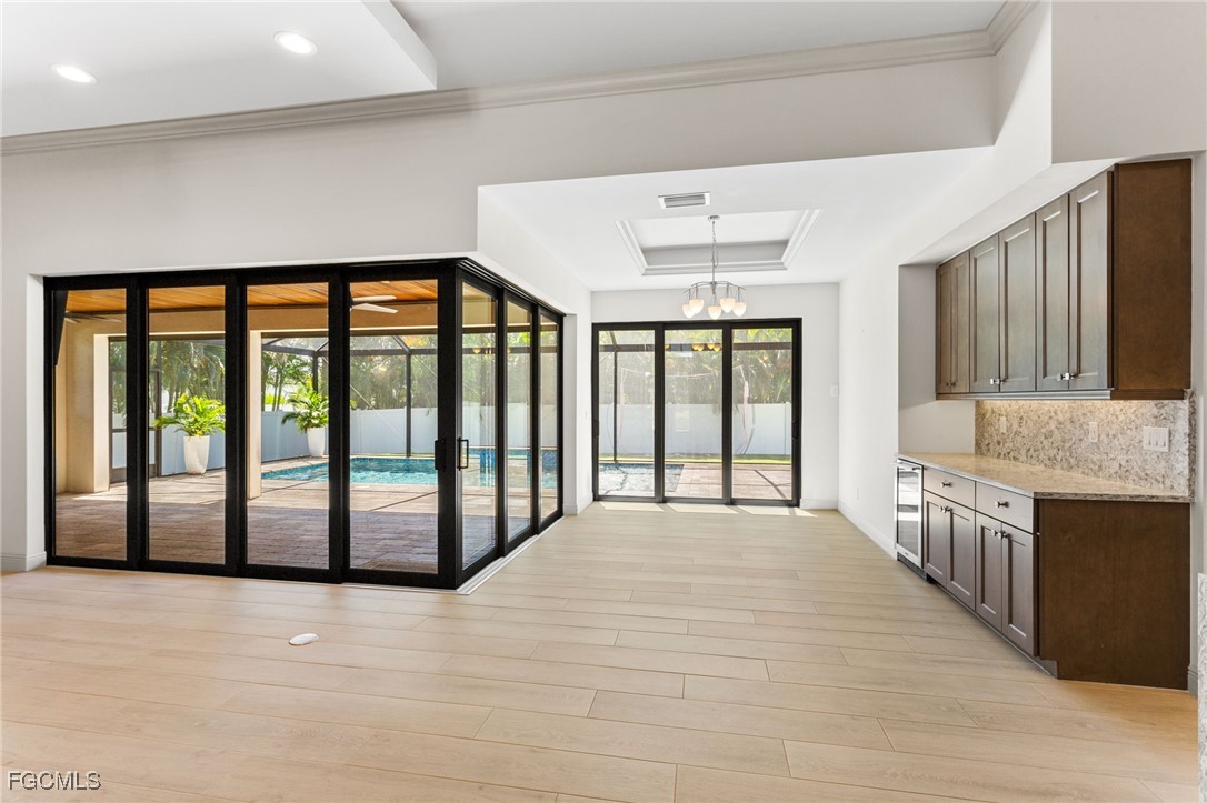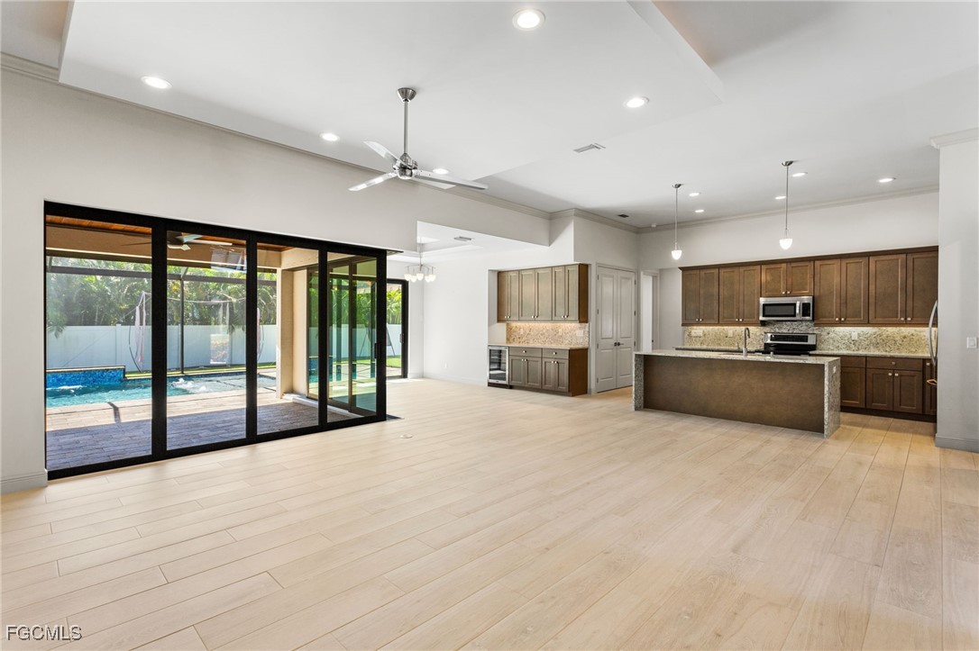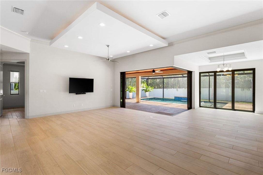 Located in the sought-after Southwest Cape Coral area, this stunning 3-bedroom + den, 3-bath home sits on an oversized corner lot with desirable Southern exposure. Designed for both comfort and style, this home features an open floor plan with soaring ceilings, elegant tray ceilings, and crown molding throughout—perfect for entertaining or relaxed living. Step outside to your private backyard oasis with a heated pool, sun shelf, tranquil water features, and a luxurious PebbleTec finish—ideal for enjoying Florida’s year-round sunshine. The heart of the home is the chef-inspired kitchen, boasting quartz countertops, a large waterfall island, custom cabinetry, and premium stainless steel appliances. Impact windows and doors throughout and automatic hurricane shutters for the lania. Barkyard is partially turfed, perfect for outdoor activities. No expenses spared in this meticulous home. Conveniently located just minutes from Cape Harbour, top-rated restaurants, shopping, schools, and beautiful parks, this home offers the perfect blend of convenience and tranquility. Whether you’re seeking a year-round residence or a luxurious winter retreat, this property is an exceptional opportunity in one of Cape Coral’s most desirable neighborhoods.