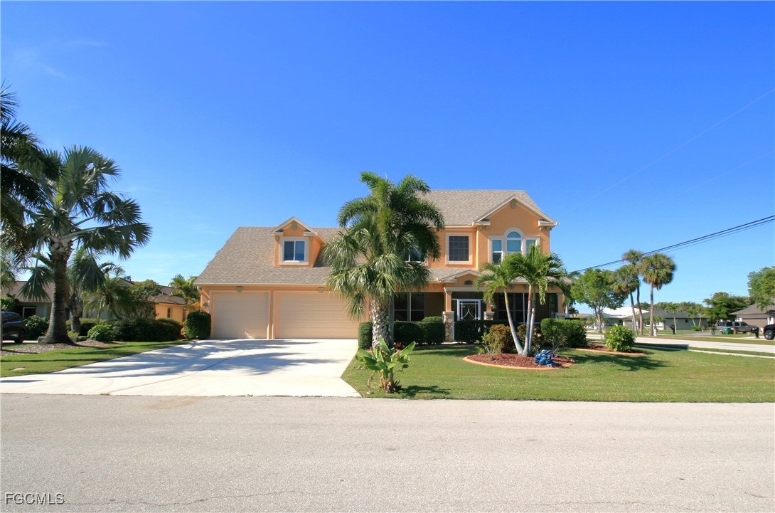 SE CAPE POOL HOME. I'm BEAUTIFUL inside. Remodeled Kitchen with creamy/white cabinets, level 4 granite and stainless appliances. Home boasts 3274 sq ft of living area and has a 4-CAR garage/workshop area. The downstairs is all tiled and has a family room/big kitchen area witha walk in pantry, breakfast nook, stools at the island, formal dining room/flex space, separate office, and a remodeled laundry room. Upstairs has four bedrooms and one is HUGE (27 x 18). The current owner uses it as a great room/tv, game room, and an additional guest bedroom. Home sits on a corner lot, is LUSHLY landscaped, and the back yard is FENCED. The LARGE pool and lanai have a pool cage. There is a front screened and covered front porch. Home has NEVER BEEN FLOODED. Roof was replaced in 2020, as well as the A/C. Most windows are impact. Brand new carpet on the stairs, hallway and primary bedroom. Home is in the heart of Cape Coral in the highly desirable Country Club area. House is across the street from what is to be our biggest city paark. Close to shopping, dining, and more. zIf you need space for vehicles, and family, this is it!