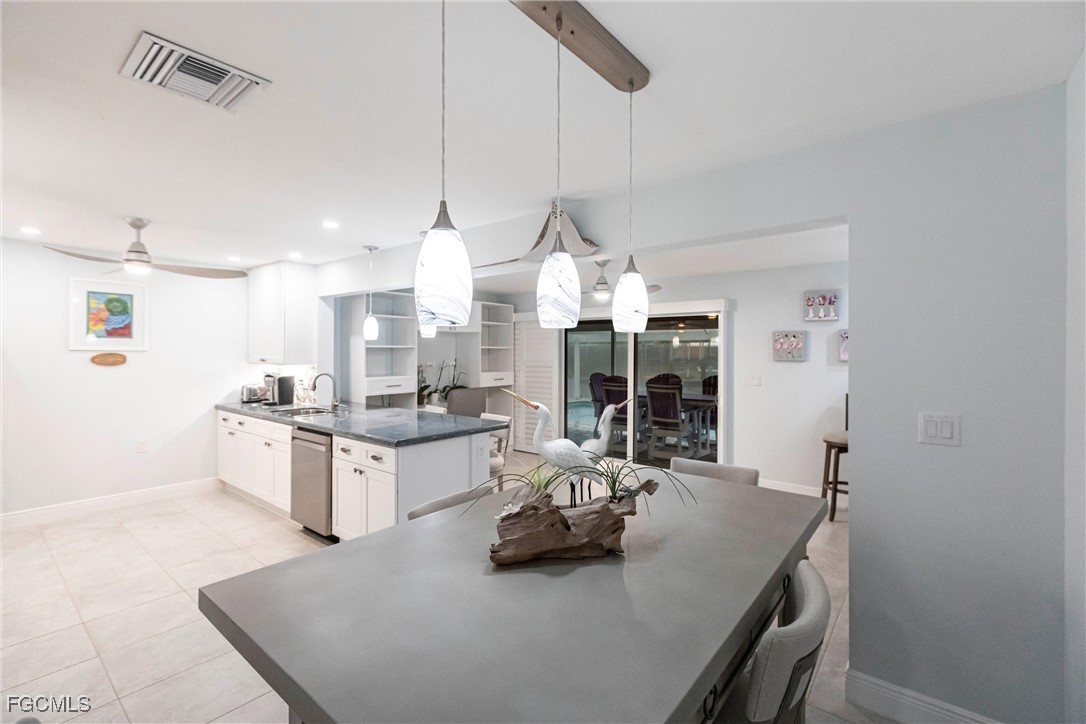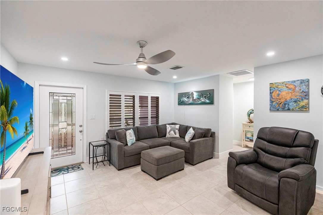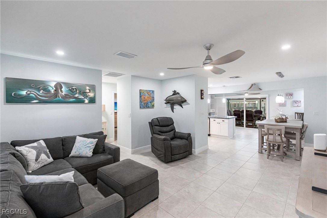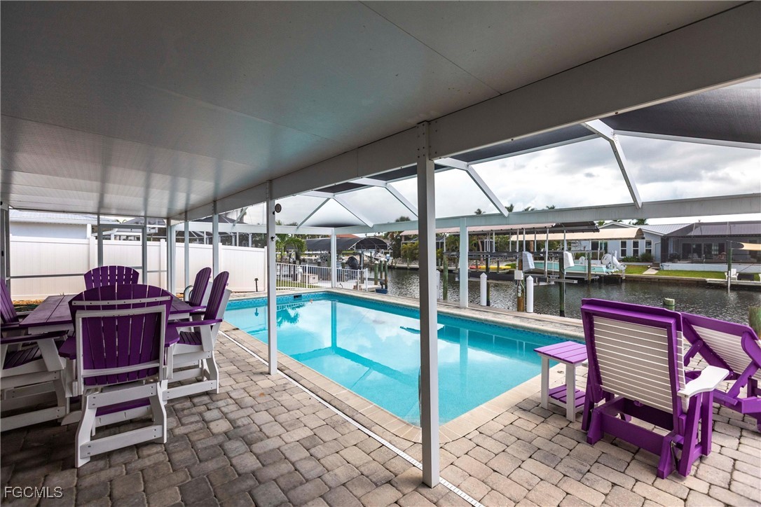 Welcome to the relaxing, stress free, waterfront island life. This 2 bedroom, 2 bath home is light and bright with open living area that leads to a large, heated pool and screened lanai overlooking your covered boat lift and dock. The interior is freshly painted thru-out. New kitchen cabinetry, new a/c system and duct work, new roof, soffits & gutters, and a whole house air filtration system all installed in 2024. Take a look at the complete features list attached. The newly completed low maintenance landscape, and drainage just adds to the beauty of this property. A huge asset included in the purchase of this home are Flood Prevention System Panels. This home also carries transferrable flood insurance.