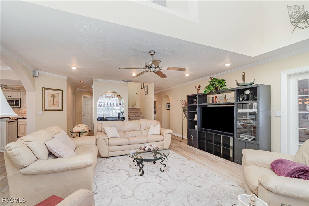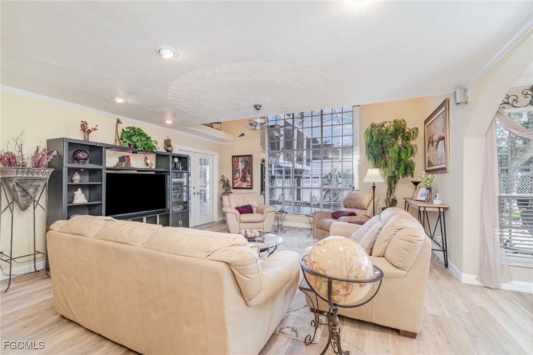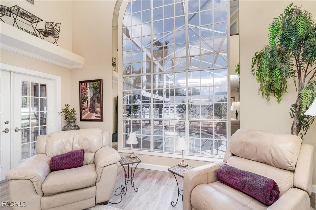 The gourmet kitchen is truly the heart of the home, a masterpiece of form and function with newer appliances and a culinary secret weapon: a convection microwave! Open sightlines pull you seamlessly into the spacious living room, where a magnificent, floor-to-ceiling window frames a stunning view of your private, enclosed pool area—the perfect backdrop for relaxing or entertaining.