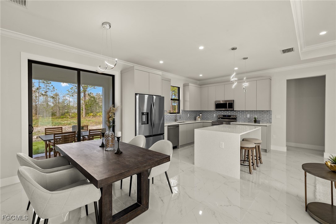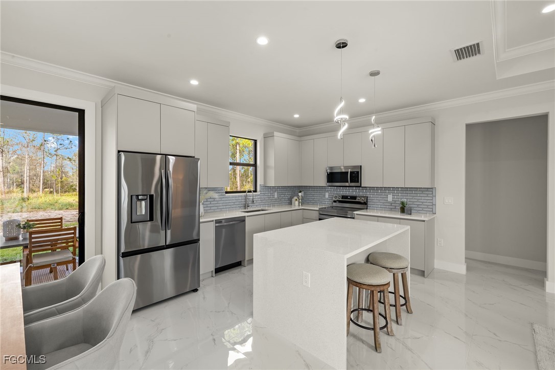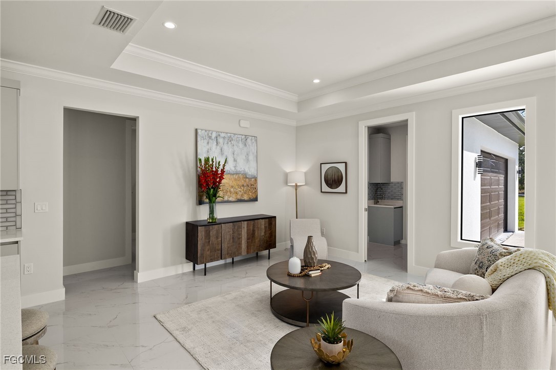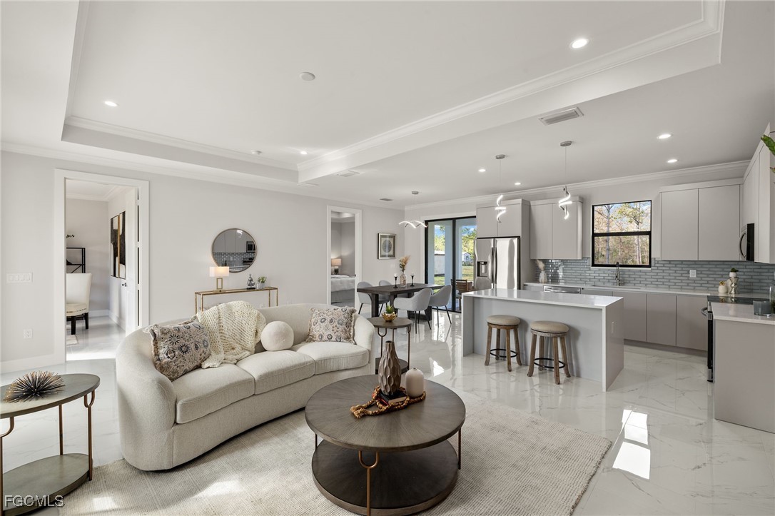 Lovely 3 BEDROOM PLUS DEN, new construction . Just minutes from supermarkets, pizza parlor, nail salon, and more. This high quality, beautiful new-build showcases an open floor plan with great attention to details. A bright and airy main living space; light filled den; tile throughout; custom wood cabinets kitchen with quartz countertop, a waterfall island, and beautiful light colored backsplash; soaring high tray ceilings in the living room and master bedroom; 8-ft doors; impact windows and doors; automated sprinkler system; and asphalted driveway. Golden Gate Estates is the perfect combination of peaceful, rural setting, just a short driving distance from all the amazing amenities Naples has to offer. PICTURES ARE FROM THE SAME MODEL BUT NOT ACTUAL HOUSE.There will be some variations.