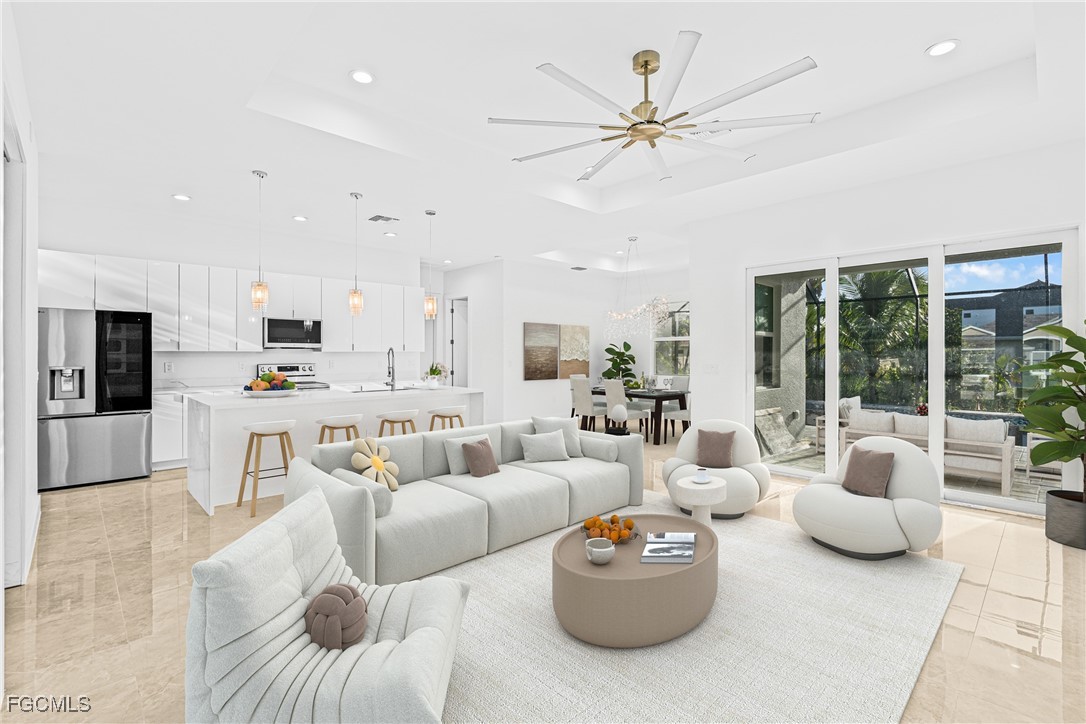 At the heart of the home, the chef-inspired kitchen features a large waterfall-edge island, modern white cabinetry, stainless steel appliances, and stylish pendant lighting—perfect for entertaining guests or enjoying family meals. The spacious great room opens seamlessly to the lanai, creating an effortless indoor-outdoor living experience.
