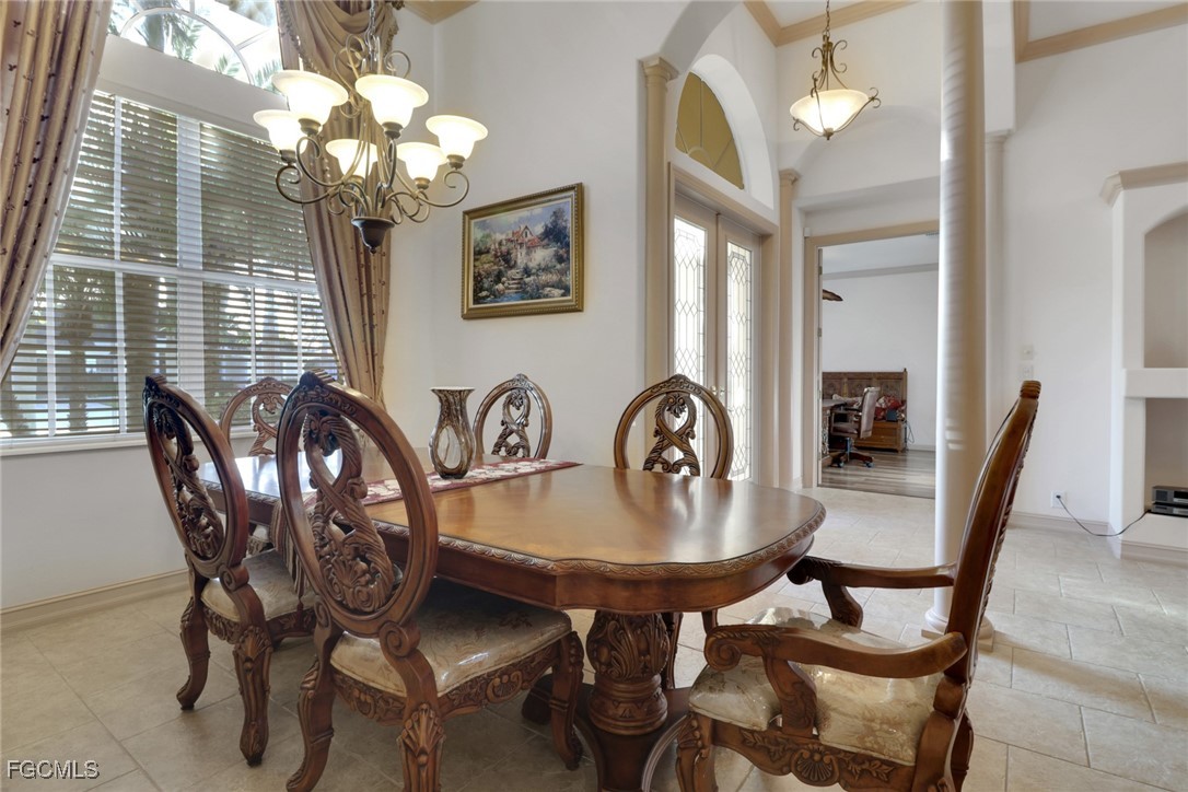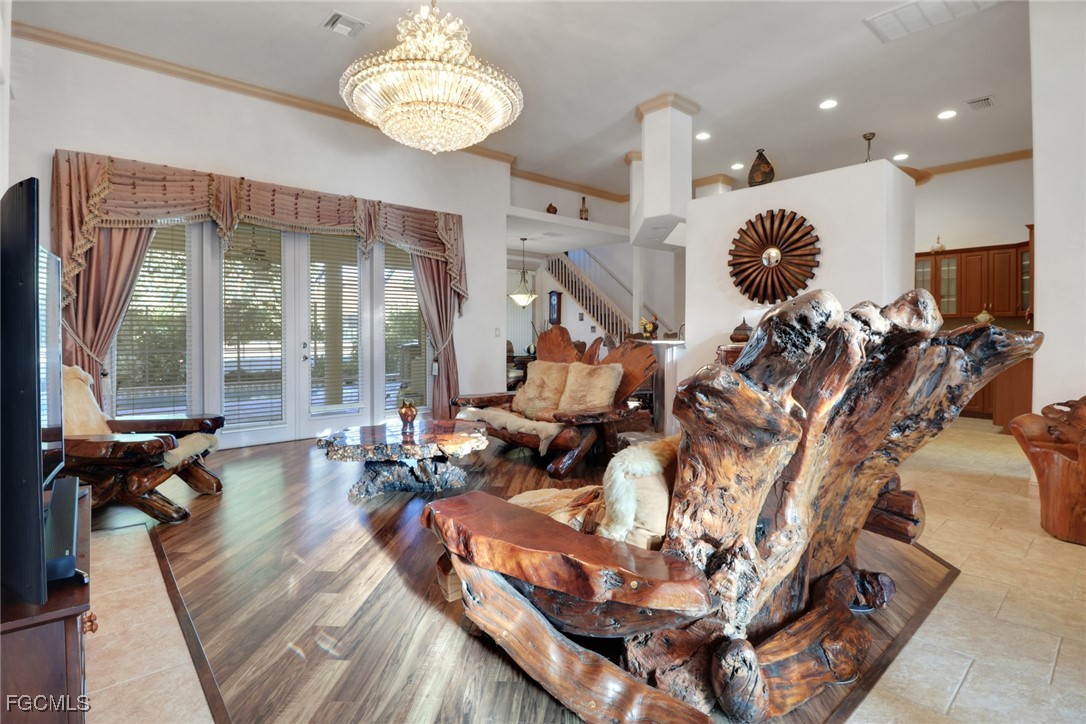 This 2,943 sf 2 story concrete block stucco home is in a beautiful highly maintained neighborhood, in a highly desired area, no HOA. Great for family, vacation home or investment property. Near top-rated schools, entertainment, dining, shopping and Sands Park. Beautiful curb appeal, tropical Christmas Palm trees and Canary Date Palms line the street. Mature lush landscaping, manicured bushes. 3 car garage with paver driveway. Stunning glass double entry doors. Offers luxury and comfort for the ultimate Florida lifestyle. Backyard has avocado, mango, papaya trees and a Maranga tree. 3 bedrooms downstairs each with their OWN full bath and walk in closet. 4th bedroom/bonus room upstairs also with its OWN full bath, walk in closet and a balcony to view the beautiful Florida sunsets. Office/den with French doors downstairs which can work as a 5th bedroom. 4 inside full baths and convenient 1/2 pool bath in pool/lanai area. Dining room has 14 foot ceilings with mood lighting in the stunning tray ceiling. 12 foot ceilings in the living room with large built in shelving. High end crystal chandelier dazzles giving a sense of grandeur and opulence. Inlay engineered title and hard wood in the living room. Soaring tray ceilings and crown molding throughout the home. The large primary bedroom is a private retreat in itself with tray ceilings, two closets, one with built in shelving/organizers, doors to the lanai, luxurious bath with dual sinks, spa jacuzzi tub, dual shower heads. Well-appointed kitchen with plenty of cabinetry, counter space, breakfast bar, generous walk in pantry. Central island working space, recess lighting, self cleaning convection oven. Separate dining area with large views of the lanai, pool and yard. Interesting architectural details throughout the home. Surround Sound System.3 doors leading to lanai/pool, 2006 built, shows like new. Beautiful well-maintained concrete pool with new heavy duty plumbing in 2023. No water intrusion ever. 16 seer 5 ton Rheem system unit Dec 2019/10 year warranty. Fan replaced 2024.House wired for security system. Beautiful tile roof. Automatic lawn irrigation system. Stunning lighting around the home for a relaxing peaceful appearance. Furnishings are negotiable on a separate bill of sale.