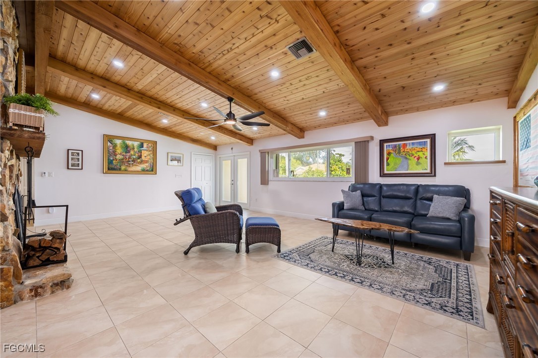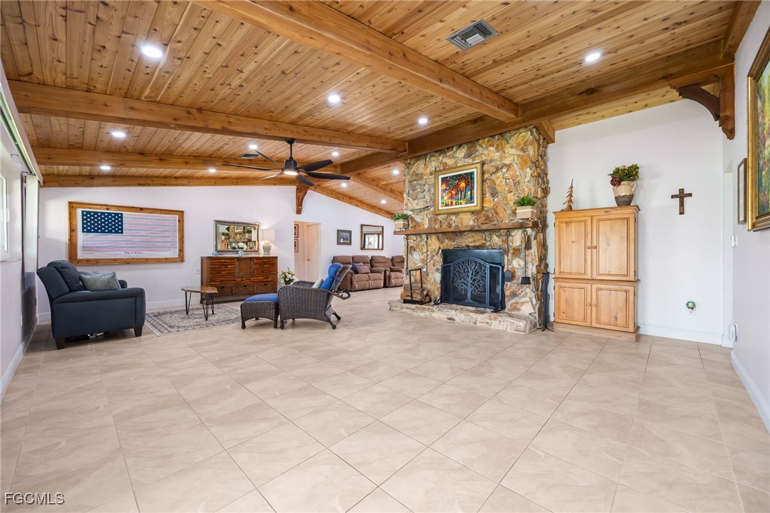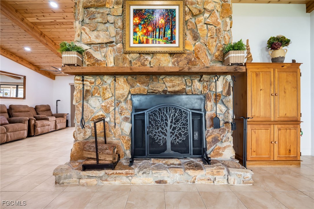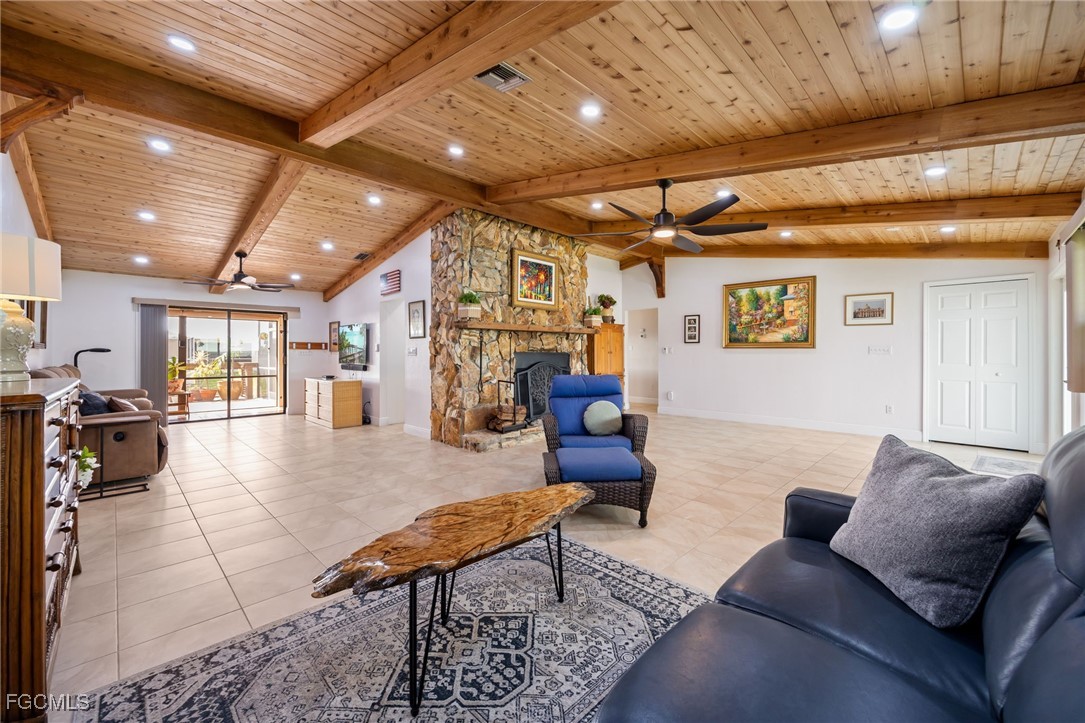 Step inside to find soaring vaulted ceilings and a spacious family room highlighted by rich wood ceilings and a stunning stone fireplace, creating a warm and inviting atmosphere. The remodeled chef’s kitchen is an entertainer’s dream with extensive cabinetry (including pull-outs and a pantry), sleek countertops, and a convenient pass-through to the covered lanai — ideal for hosting gatherings with family and friends.