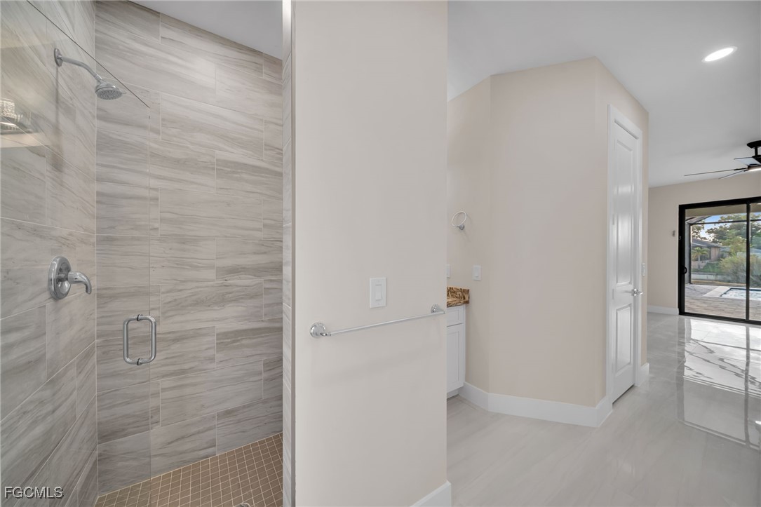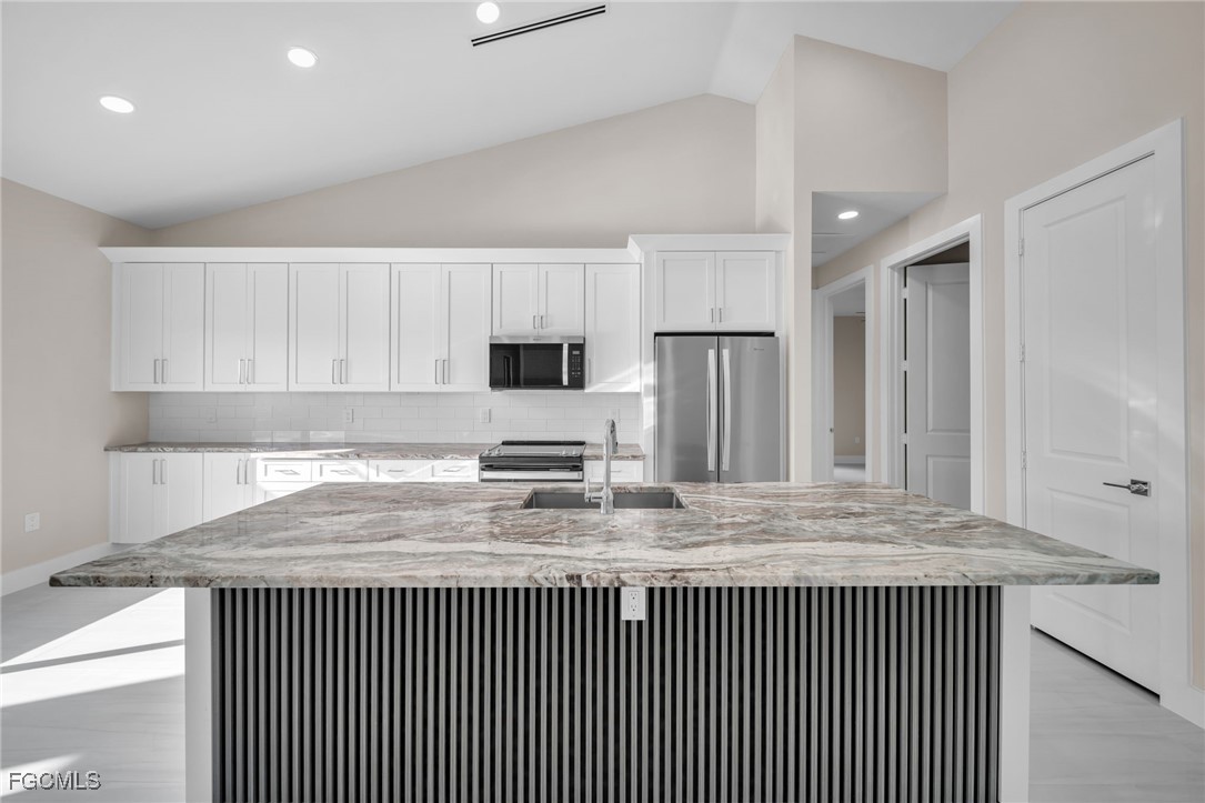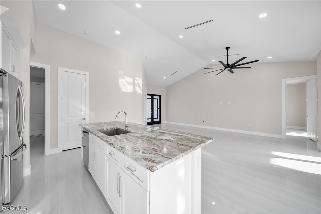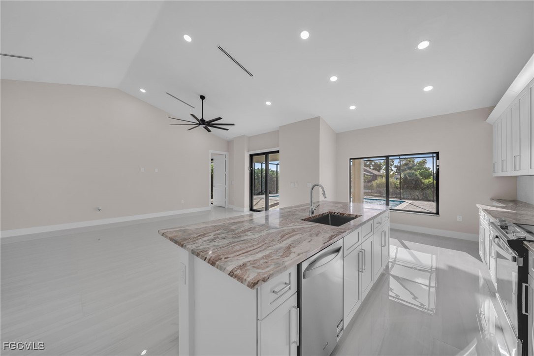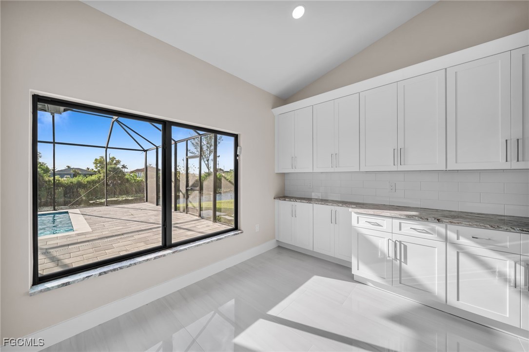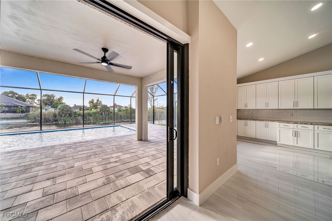 Step into your private oasis featuring a spacious 14' x 28' swimming pool with a sun shelf and a beautifully screened-in lanai—perfect for year-round entertaining. Inside, you'll be greeted by soaring vaulted ceilings, elegant 8' interior doors, and continuous 24" x 48" tile flooring that elevates the entire space. The kitchen is a chef's dream, boasting an abundance of cabinetry designed for both style and functionality.