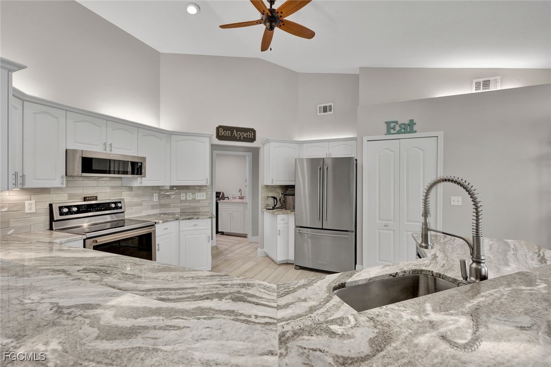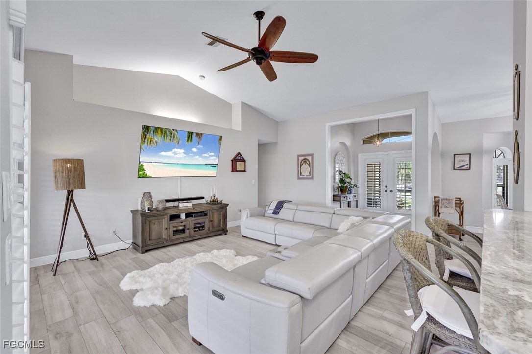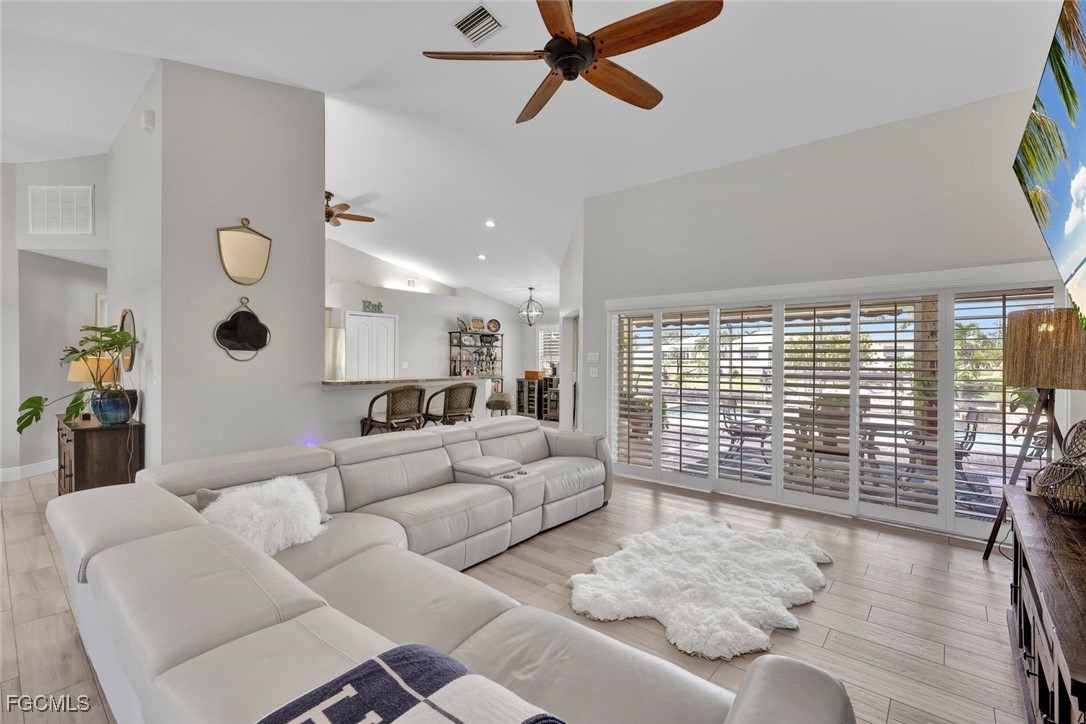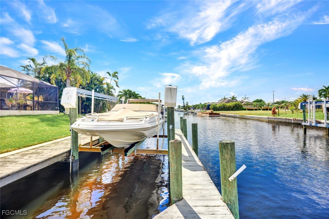 WESTERN EXPOSURE GULF-ACCESS POOL HOME w/DOCK AND LIFT! Enjoy the ultimate Southwest Florida lifestyle, from the moment you arrive! You are greeted by the lush tropical landscaping, lava rock accents, and screened double French door entry create an inviting first impression. Inside, soaring vaulted ceilings and sunlit open spaces set the tone for relaxed coastal living. The great room flows effortlessly into the dining area and kitchen, where granite countertops, tile backsplash, under-cabinet lighting, and a large farmhouse sink elevate every meal. KitchenAid stainless steel appliances, a breakfast bar, pantry, and cozy dining nook overlooking the water make it as practical as it is stunning. The owner’s suite offers private sliders to the lanai and a luxurious ensuite bath with dual sinks, a makeup vanity, a large walk-in shower, a garden tub, and a spacious walk-in closet. The split floor plan provides privacy for guests, while a nautical-themed pool bath with shiplap detail and chair rail adds a fun coastal touch. The home features updated light fixtures and fans, fresh tile flooring completed in 2021, a new roof (2022), new screens, and an A/C that’s serviced every three months with a UV purification system. The water heater and AC system are also newer ensuring peace of mind for years to come. Step through sliding glass doors to the expansive lanai, where a sparkling electric heated salt-water pool with waterfall feature and western exposure create the perfect backdrop for gorgeous Florida sunsets. The screened enclosure offers plenty of room for outdoor dining and lounging, surrounded by lush palms and a fenced yard for added privacy. A private dock with lift provides premium canal access, perfect boating adventures to open water in approximately 35 minutes. Back yard has dog run keeping those furry family members safe and sound. Designed for easy living and memorable entertaining, this home embodies the essence of Cape Coral’s waterfront charm—close to shopping, dining, and parks, yet tucked away in a quiet neighborhood where every evening ends with a golden sunset over the water. World class fishing, white sandy beaches and year round temperate weather awaits you!