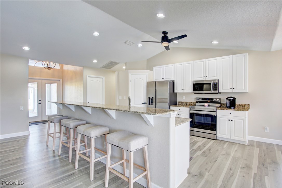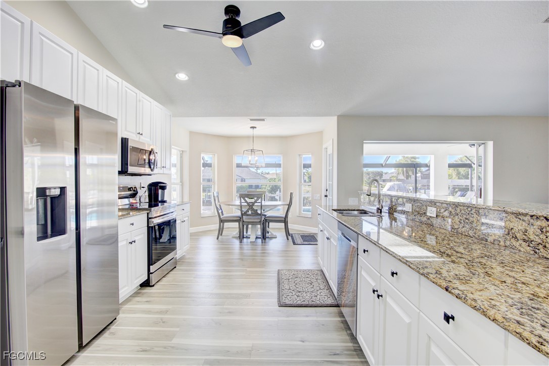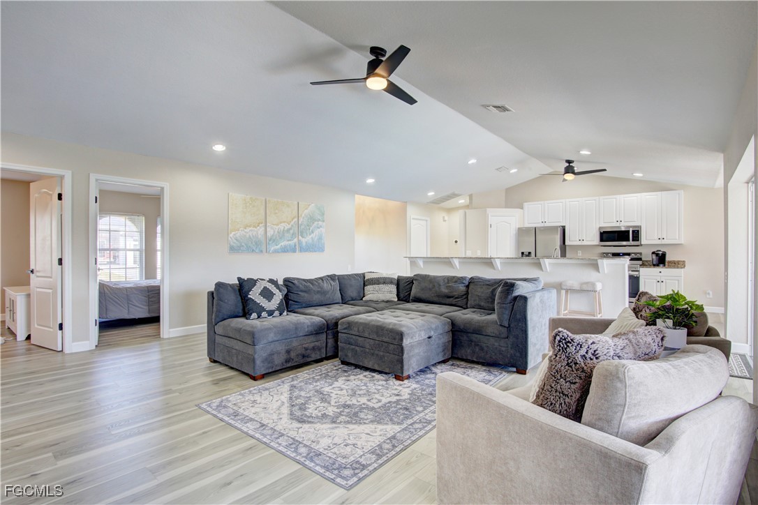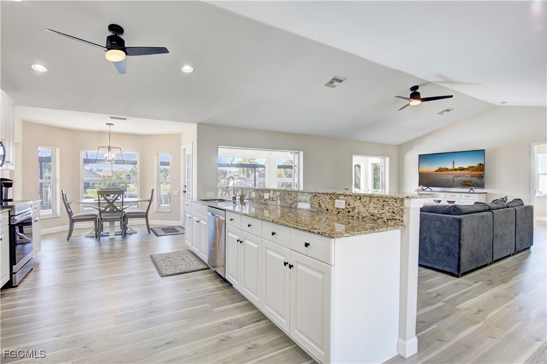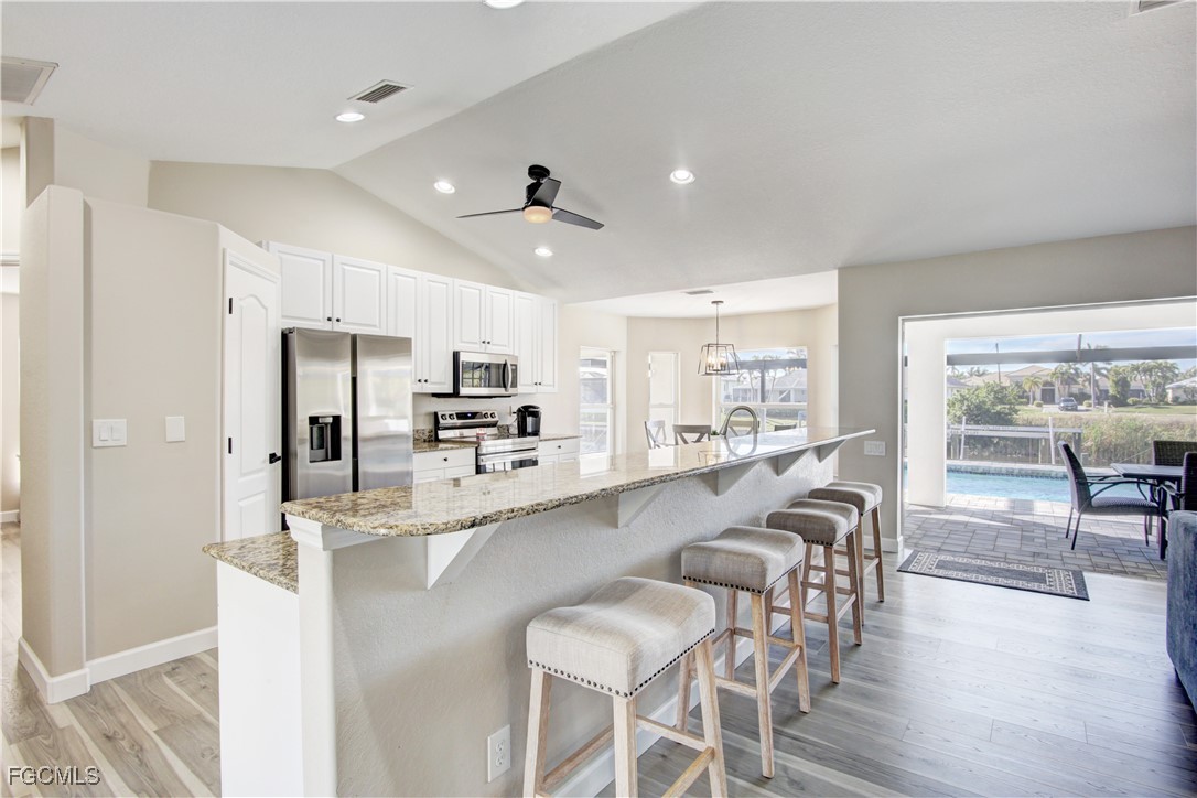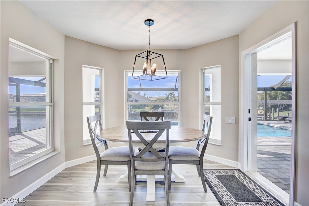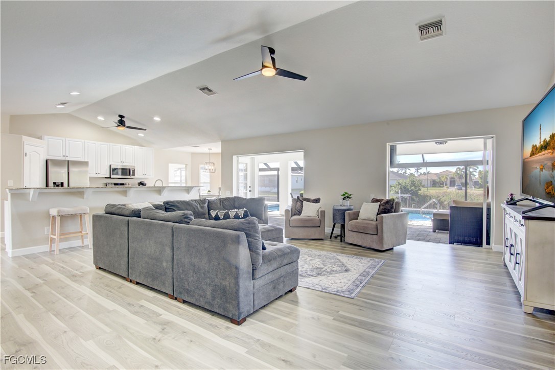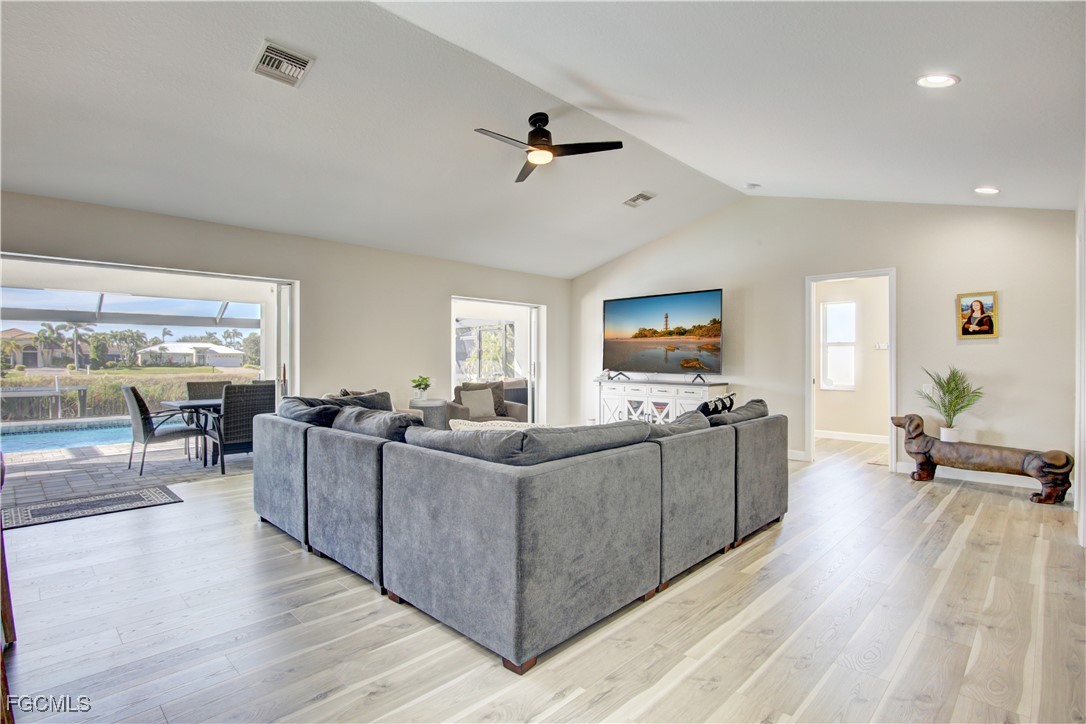This gorgeously remodeled, turnkey furnished, SW Cape gulf-access pool home checks all the boxes. Important note: The beautiful interior remodel was done @ the owner's choosing, NOT as a result of hurricane damage, and all changes have been made within the past few years. Some top features include: Coveted Southern Exposure - Large Pool, Recently Resurfaced & Heater Added - All New Pavers on Lanai (Lanai Runs Width of Home, Tons of Paver Space Around Pool) - New Panoramic Lanai Cage - New Roof 2024 - 85 Ft of Water Frontage Adjacent to Triple Lot = Tons of Space Around Home - All New LVP Flooring Throughout Home - Remastered Kitchen w/ White Cabinetry & New Stainless Appliances - New Vanities in Both Bathrooms - All New Shower in Master - 7 Roll Down Hurricane Screens Added to Enclose Both Outdoor Living Areas (Very Large, Under Truss Outdoor Living Spaces) - New Interior and Exterior Paint - New Interior / Exterior Fans & Fixtures Throughout - 3 Sets of Pocket Sliders Seamlessly Blend Indoor/Outdoor Living - AC Replaced 2021 - Guest Bath Doubles as Pool Bath - Perfect Floorplan "Lives" Much Larger than Sq. Footage Suggests - Wide Open Great Room Design w/ 3 Beds, 2 Baths & 1,731 SF - Best of All, Bargain Priced at only $659K!