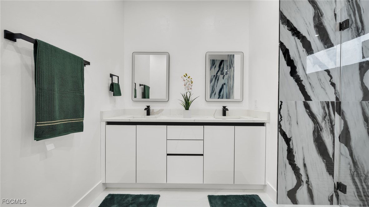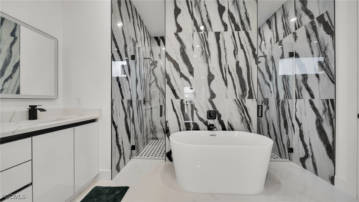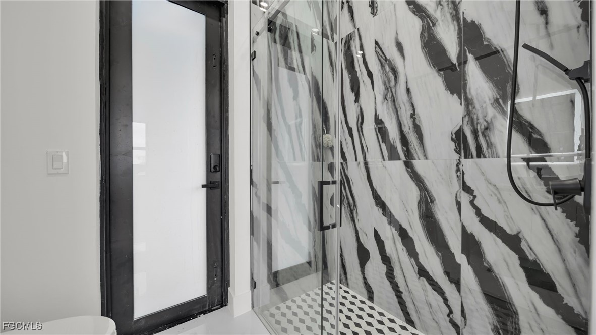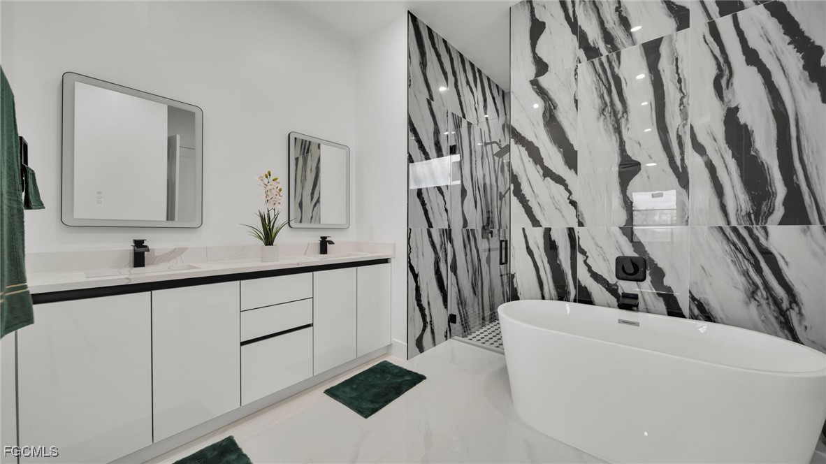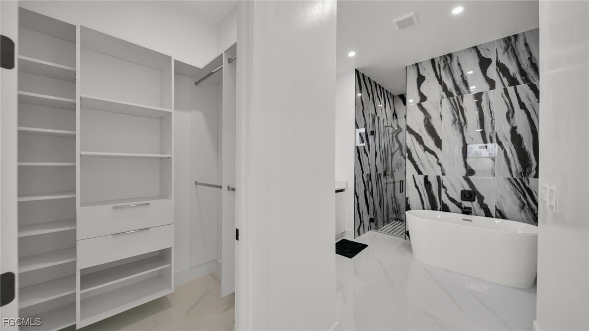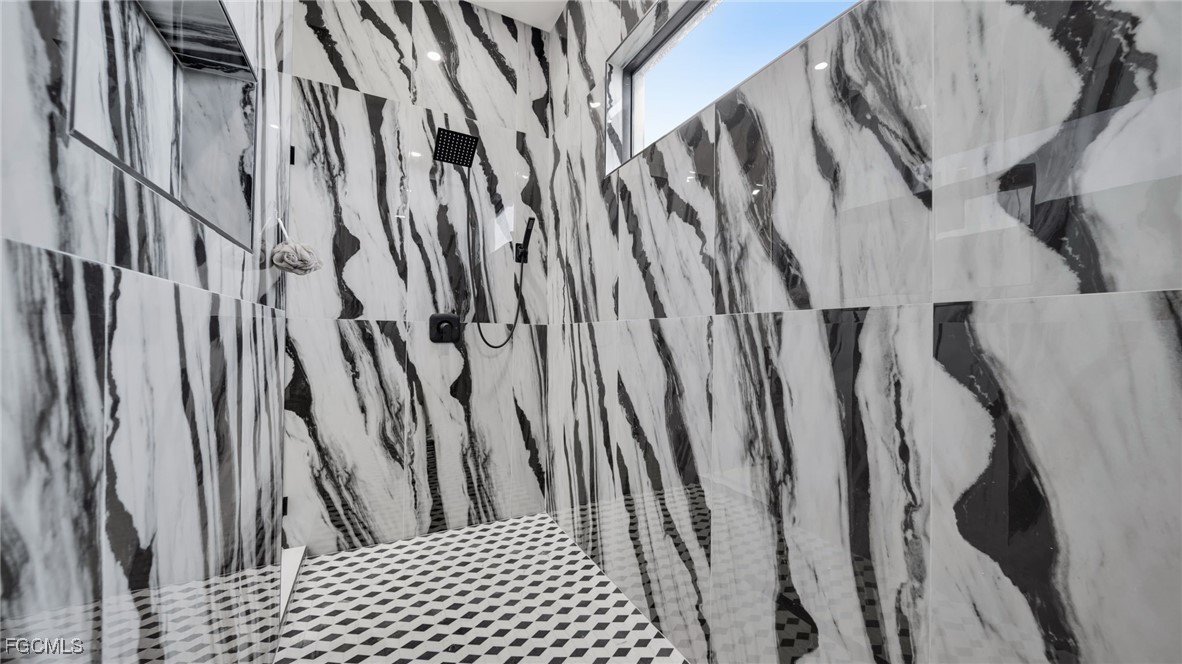 The master suite feels like a private spa retreat, featuring a striking zebra-inspired tile design in the oversized walk-in shower, a soaking tub, dual vanities, and a spacious walk-in closet. Every detail is crafted for relaxation and luxury.