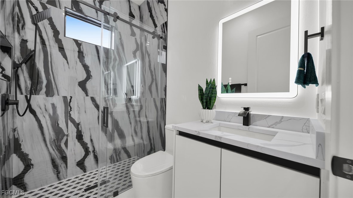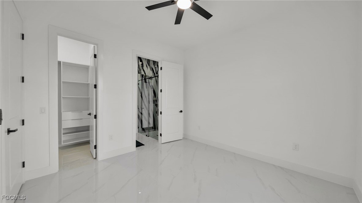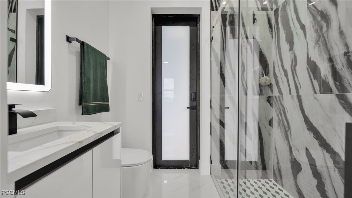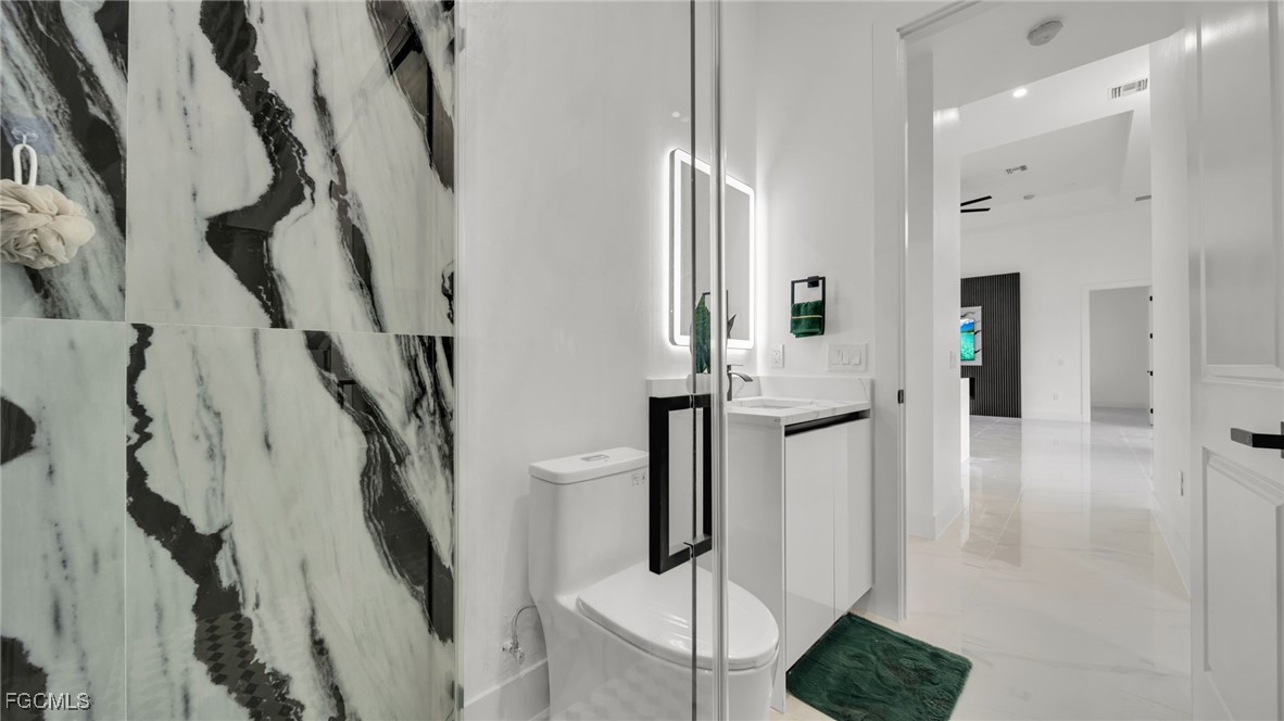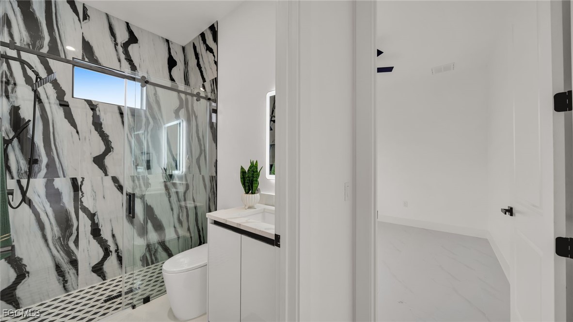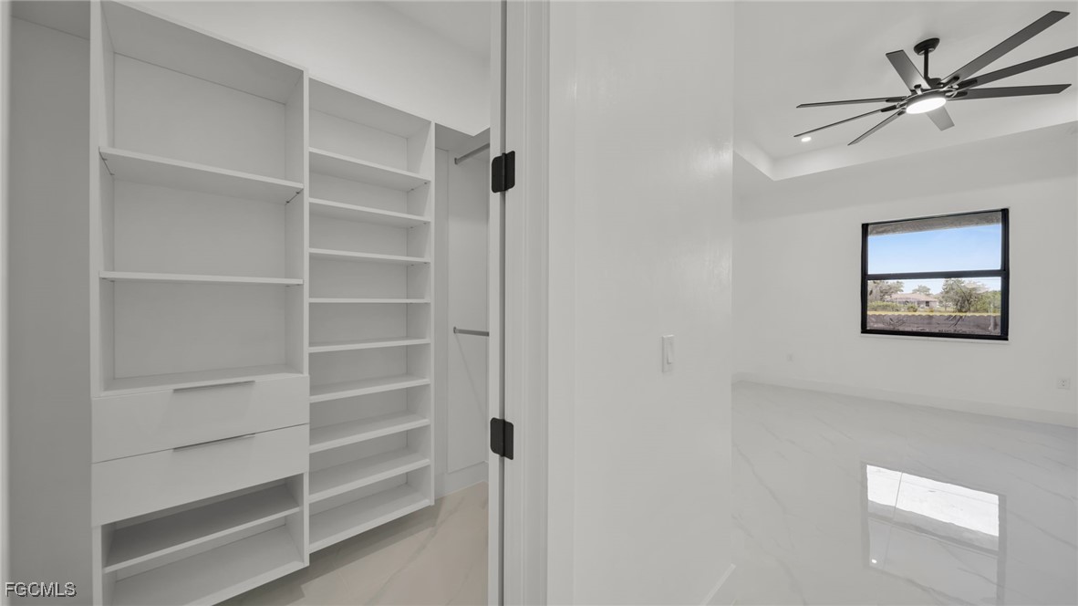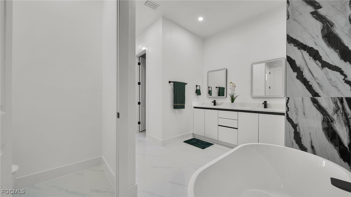 The master suite feels like a private spa retreat, featuring a striking zebra-inspired tile design in the oversized walk-in shower, a soaking tub, dual vanities, and a spacious walk-in closet. Every detail is crafted for relaxation and luxury.