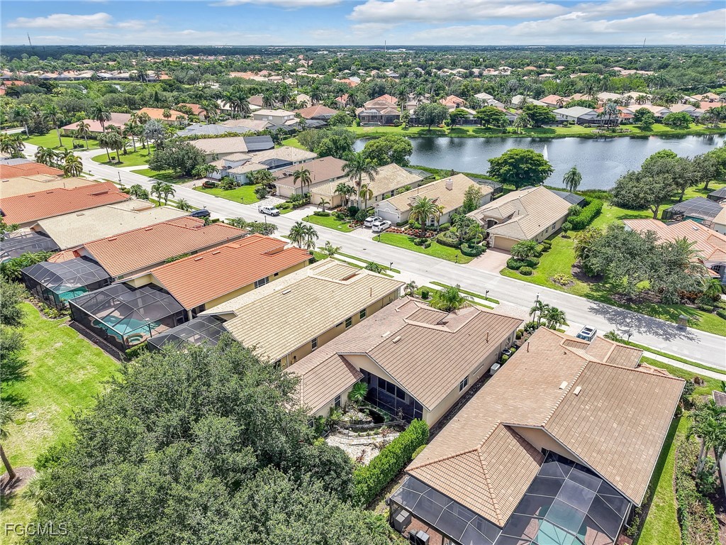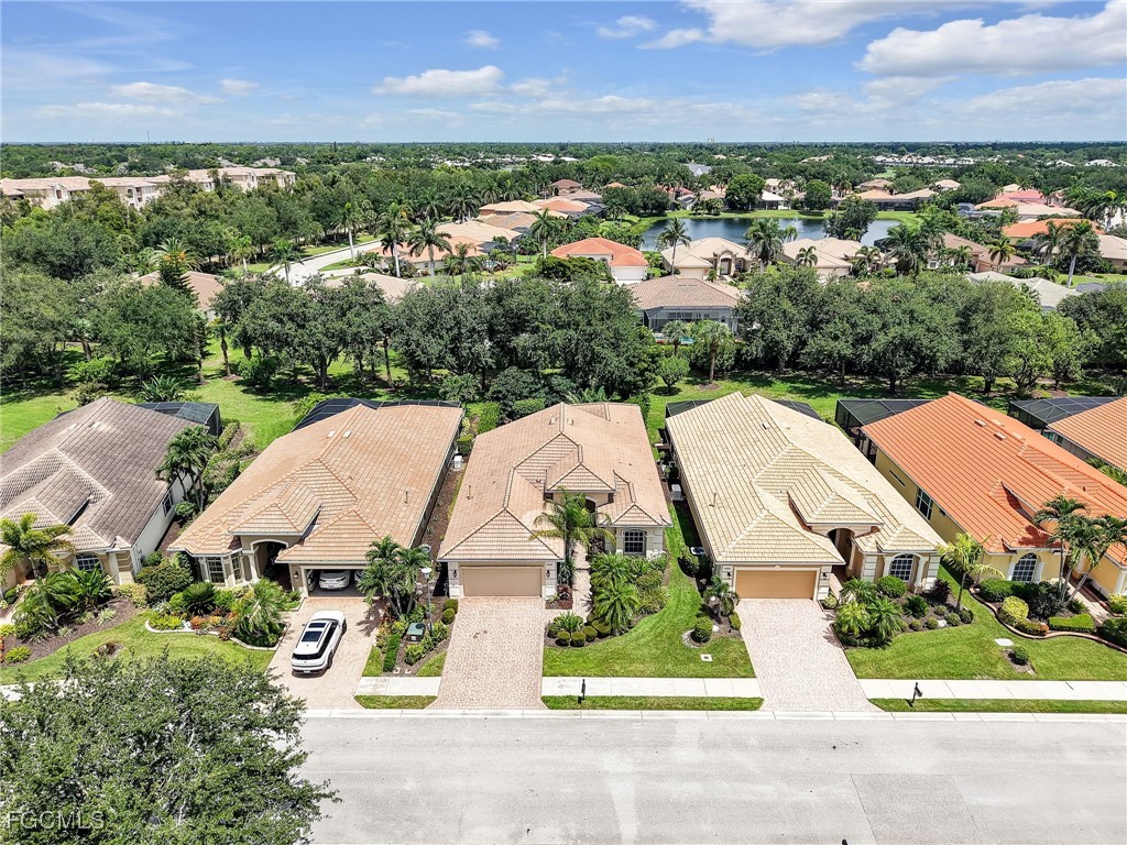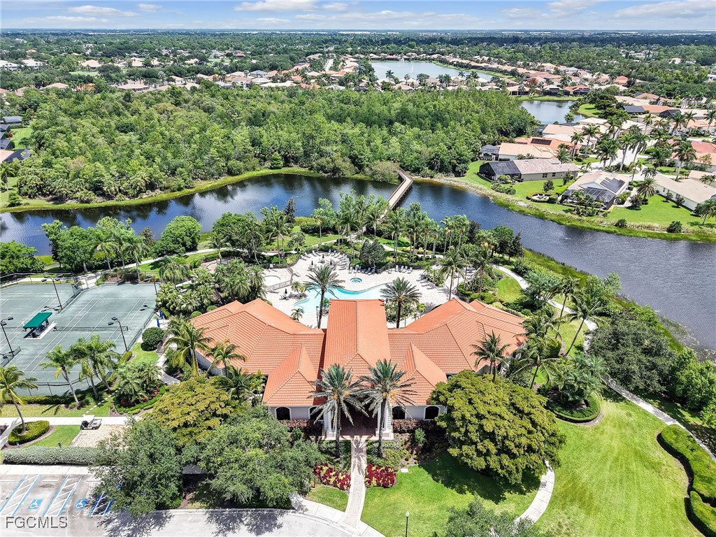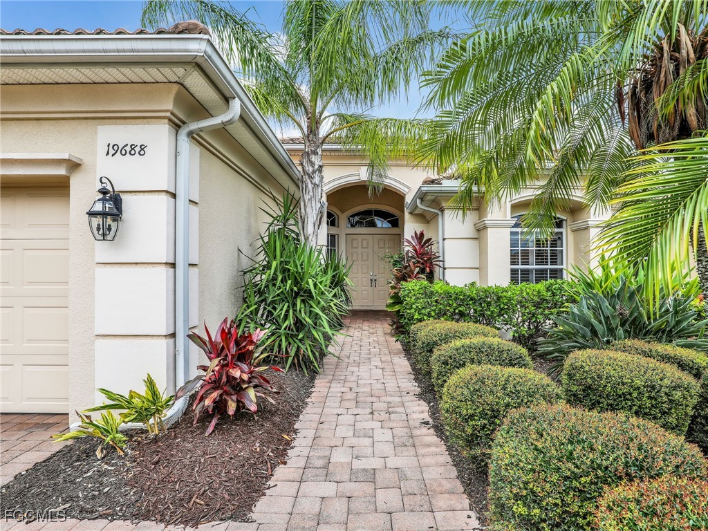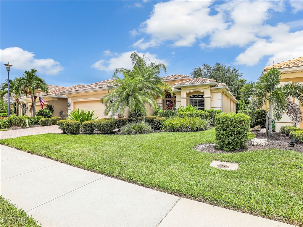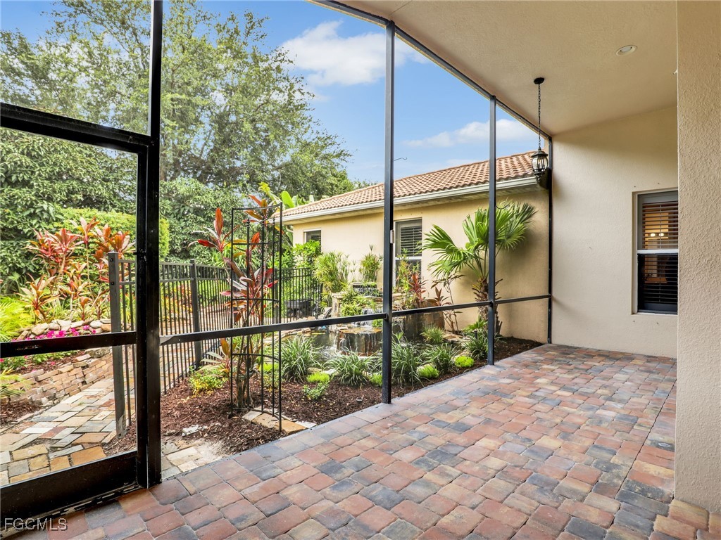 Distinctive Toll Brothers residence in Belle Lago with a custom-designed backyard unlike any other. One-story home with two bedrooms plus optional third/office, two baths, and a two-car garage. Tray ceilings, crown moulding, 8-ft doors, plantation shutters, and large beige tile throughout. A panoramic multi-tier waterfall flows beside the main rooms and screened lanai into a pond, viewable from multiple interior angles. Natural-gas kitchen with granite counters, stainless appliances, and wraparound breakfast bar. Open great room with 3-panel sliders framing wide pond and waterfall views. Whole-house Generac gas generator (2024) auto-transfer backup for storms. HVAC replaced 2023. Laundry with utility sink, gas dryer, and matching washer. Private guest wing functions like a mother-in-law suite. Owner’s suite has dual step-in closets, a refined bathroom, and views of the pond and rear landscaping. Backyard offers exceptional privacy with dense tropical hedging along sides and rear. Community pool a short stroll away. Belle Lago offers resort amenities in a gated setting near US-41, I-75, Hertz Arena, Gulf Coast Town Center, Miromar Outlets, Coconut Point; beaches ~20 min away.
