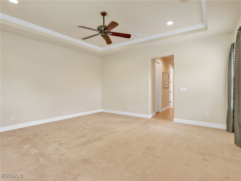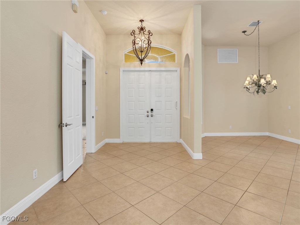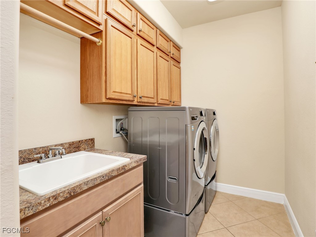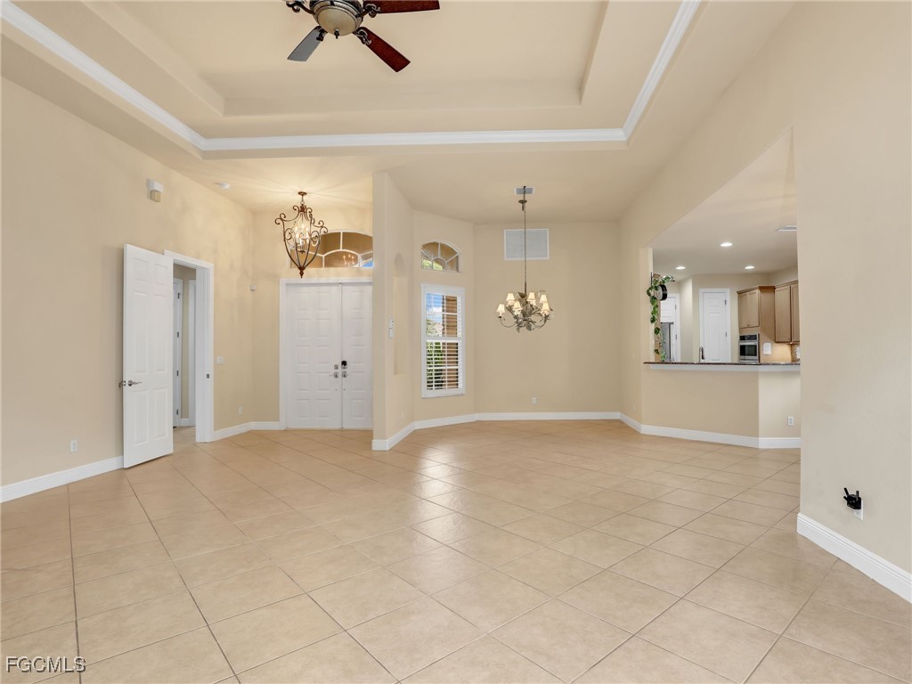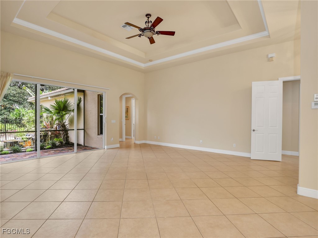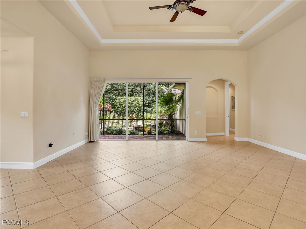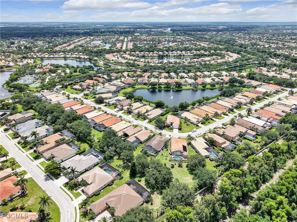 Distinctive Toll Brothers residence in Belle Lago with a custom-designed backyard unlike any other. One-story home with two bedrooms plus optional third/office, two baths, and a two-car garage. Tray ceilings, crown moulding, 8-ft doors, plantation shutters, and large beige tile throughout. A panoramic multi-tier waterfall flows beside the main rooms and screened lanai into a pond, viewable from multiple interior angles. Natural-gas kitchen with granite counters, stainless appliances, and wraparound breakfast bar. Open great room with 3-panel sliders framing wide pond and waterfall views. Whole-house Generac gas generator (2024) auto-transfer backup for storms. HVAC replaced 2023. Laundry with utility sink, gas dryer, and matching washer. Private guest wing functions like a mother-in-law suite. Owner’s suite has dual step-in closets, a refined bathroom, and views of the pond and rear landscaping. Backyard offers exceptional privacy with dense tropical hedging along sides and rear. Community pool a short stroll away. Belle Lago offers resort amenities in a gated setting near US-41, I-75, Hertz Arena, Gulf Coast Town Center, Miromar Outlets, Coconut Point; beaches ~20 min away.