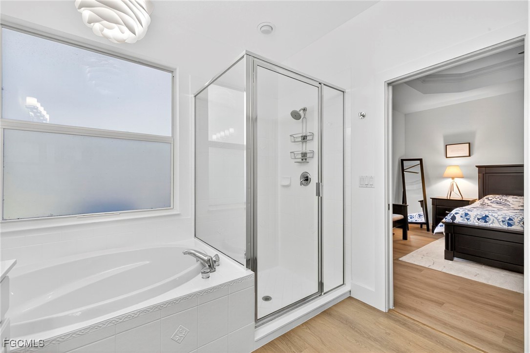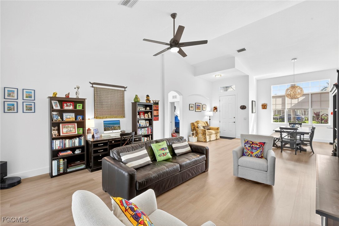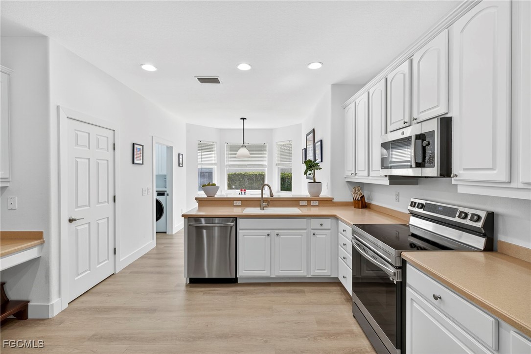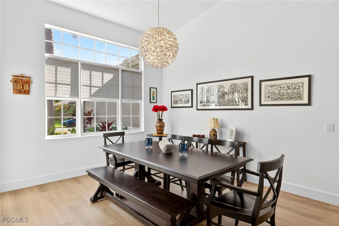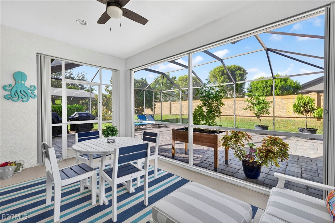 Priced to sell! This beautifully maintained home welcomes you with an open great room and a formal dining area filled with natural light. The kitchen and breakfast nook features wood cabinetry, Corian countertops, a spacious bar, and elegant finishes. Freshly painted with new flooring throughout! All windows and the sliding door have been replaced with impact-rated upgrades for added safety and efficiency. A whole-home water filtration system provides clean, great-tasting water throughout the house—an exceptional comfort and health feature. The luxurious owner’s suite includes a garden tub, dual vanities, and an oversized walk-in closet. Two guest bedrooms are privately located on the opposite side of the home for added comfort. Enjoy an extended covered lanai perfect for entertaining and a private backyard with space for a custom pool. Nestled in Chadwyck Square, a gated enclave of 55 homes offering an intimate and friendly neighborhood with low HOA fees and fantastic amenities. Enjoy the clubhouse, fitness center, sparkling community pool, play area, and pickleball courts. This home offers an ideal location about 5 miles from the beach and sits safely in a X flood zone. Schedule your private showing today and discover the serene charm of Southwest Florida living.