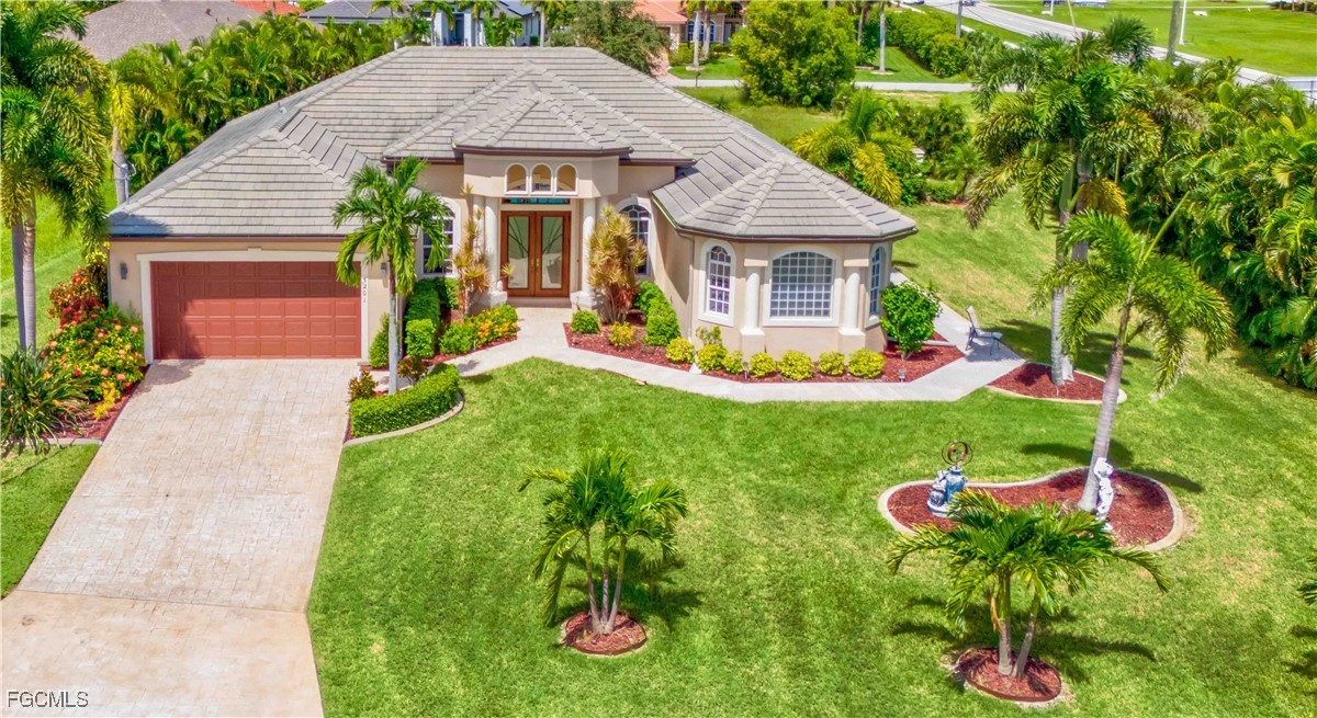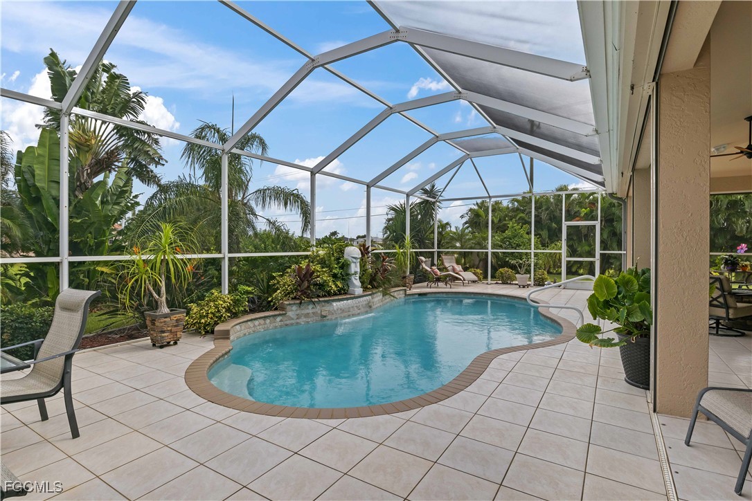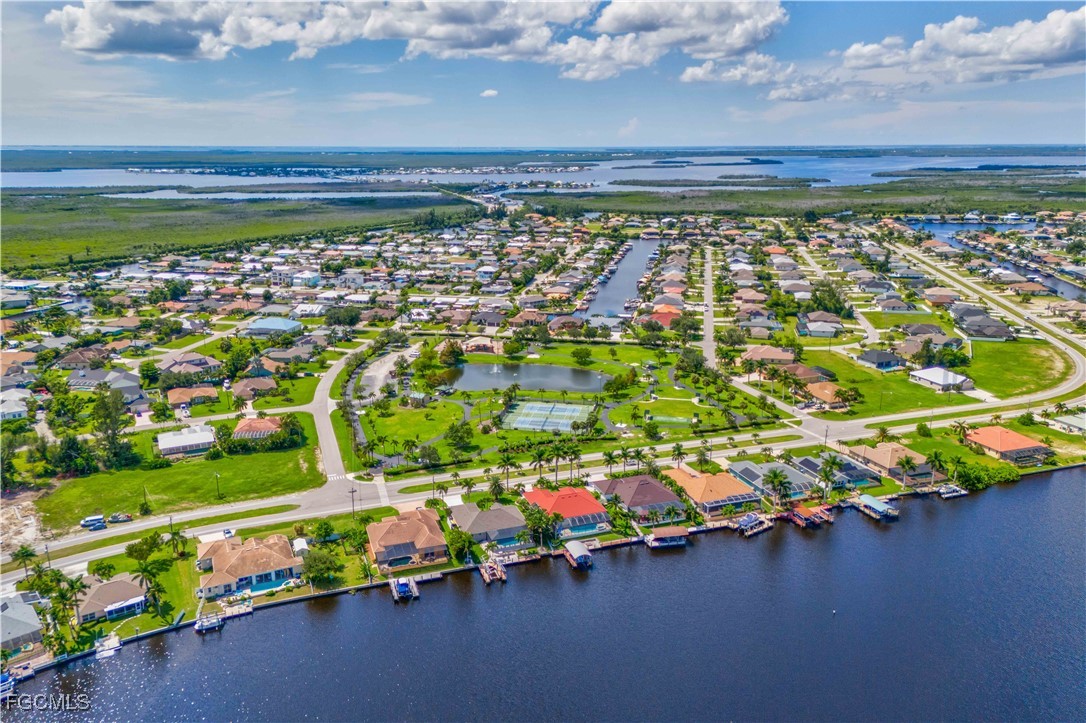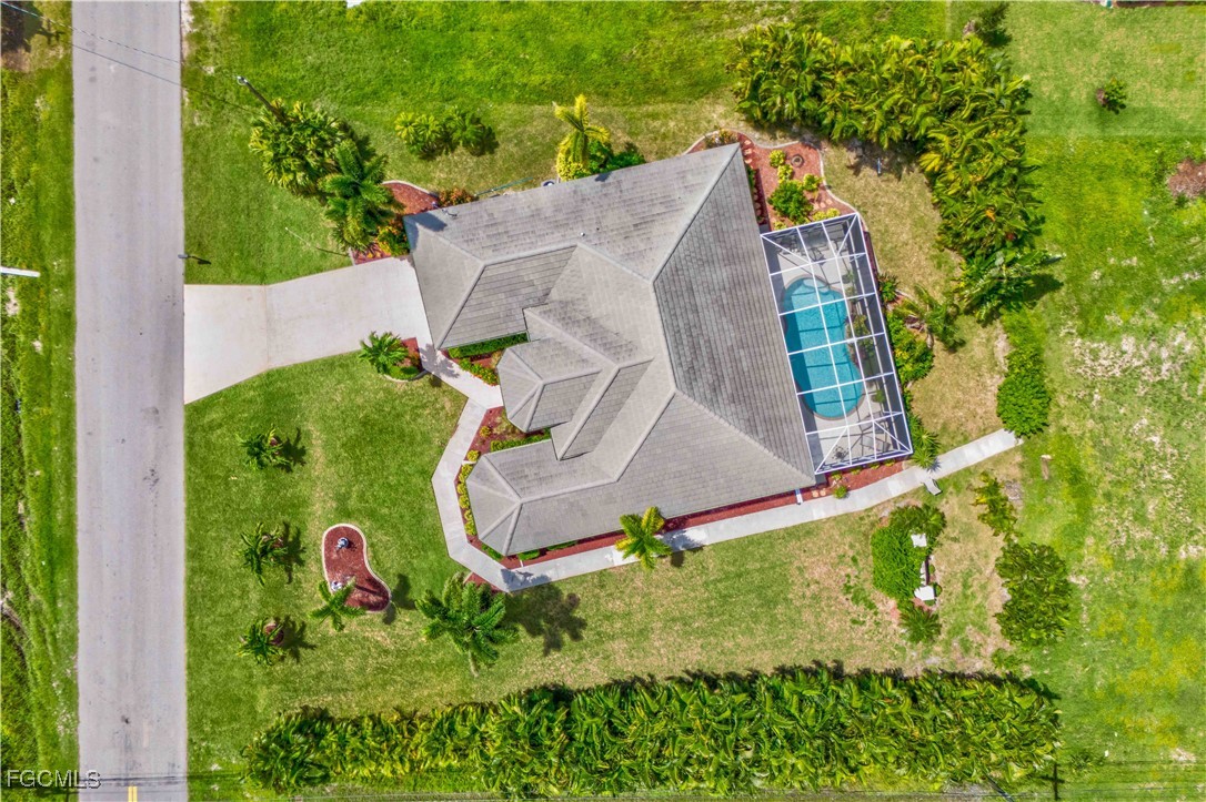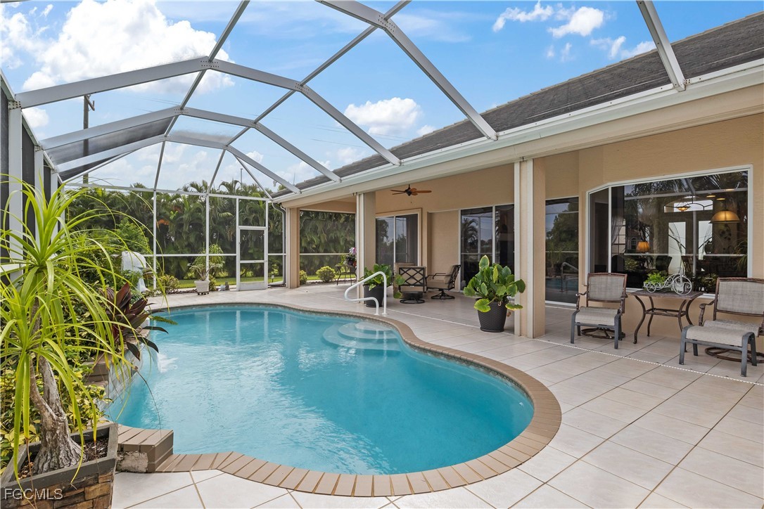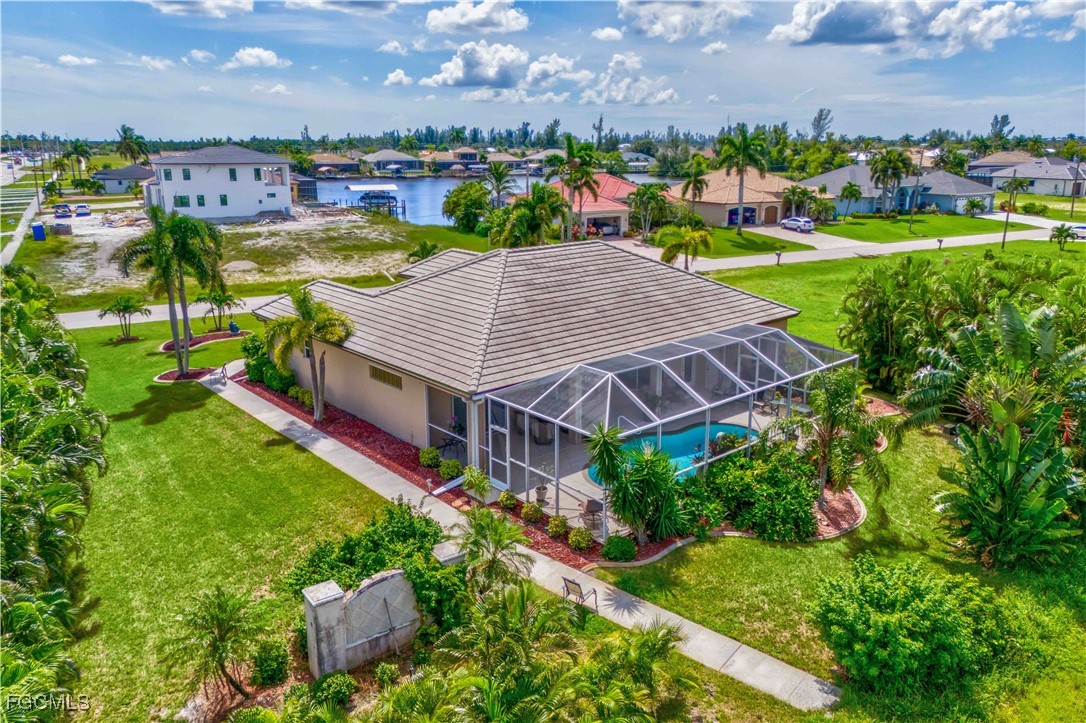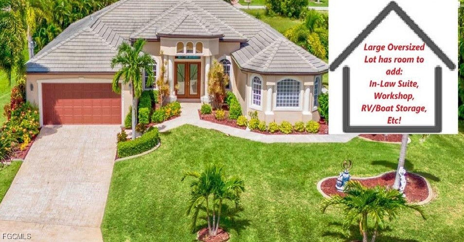 This large home has FLEXIBILITY! Add a "2nd home known as an Accessory Dwelling Unit, or workshop, or garage/workshop! HUGE LOT! Former Model Built on 2 lots of a 3-lot site allowing more uses of the property. The current AIR CONDITIONED GARAGE will hold more than 2 vehicles because it's 27' LONG, repeat 27 FEET LONG, making it able to hold up to 3 vehicles. Or hold your boat trailer. Or be a combo garage/workshop. Or hobby area. Or AC'd storage, etc. Plus the side yard has room to add an RV/boat garage, workshop, in-law suite, pickleball court, play area, or whatever. AC 2024; New tile roof 2021. Tiled lanai. Large Master suite with wrap around shower plus a 6' soaking tub. Office/Den has 2nd door to master suite/bath. Kitchen has breakfast/dining area adjoining the living area for an open floorplan. The spacious lanai overlooks the custom salt water pool with waterfall recently resurfaced looking brand new. The gorgeous backyard landscaping provides serene views. Electric rolldown shutters on large lanai and front entry. Remaining shutters are easy to install lightweight clear material. Located in the highly desired Ceitus Pkwy area near parks, Publix, restaurants and Matlacha attractions including Blue Dog, Micelis, and Yucatan. Parks have pickleball, tennis, playgrounds, exercise equip, kayak launch, fishing, walking/jogging paths, and more. Oasis Charter school just a few blocks away too. On City Utilities with PAID ASSESSMENTS. Easy access to anywhere via Burnt Store/Veterans or Pine Island Rd. This area is quickly becoming the preferred area of the Cape with many new and exciting projects and developments, both residential and commercial, that will make this area even more desirable. Flood insurance is transferrable.