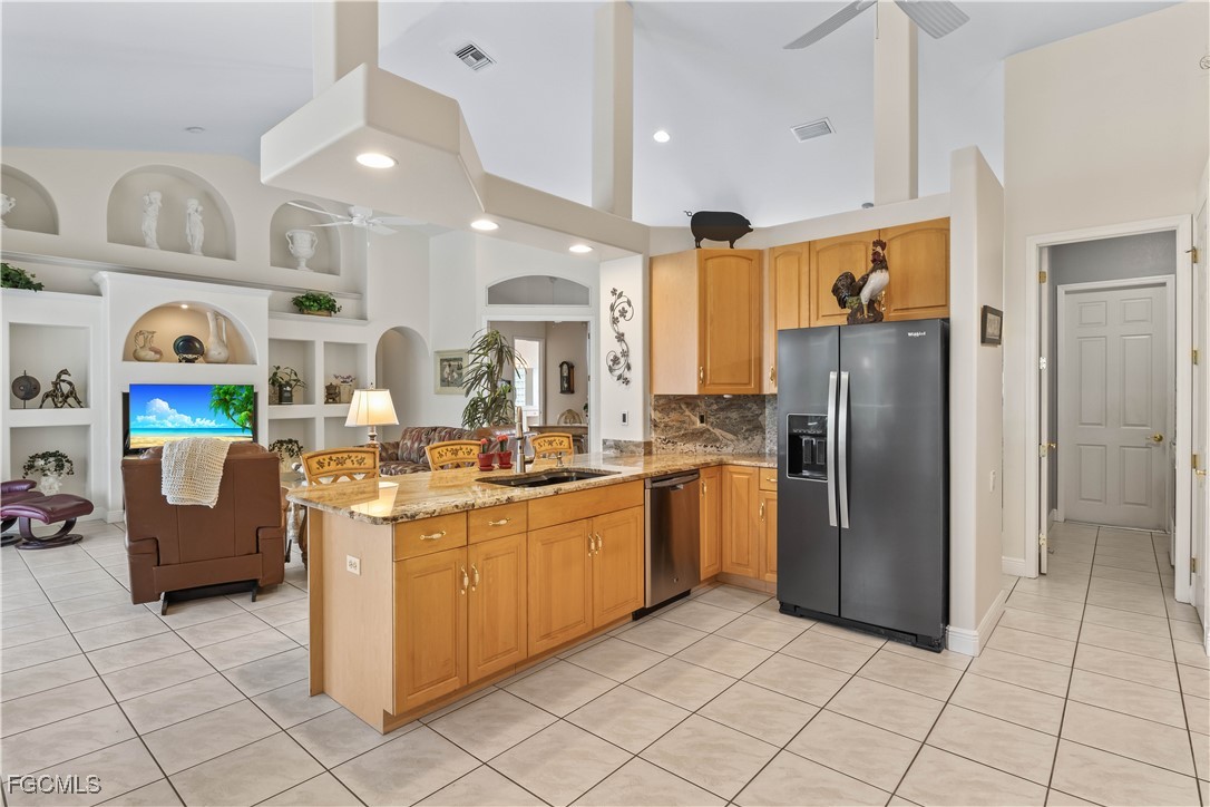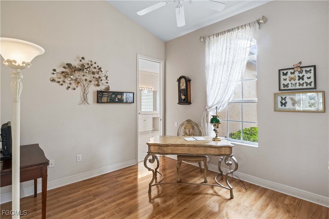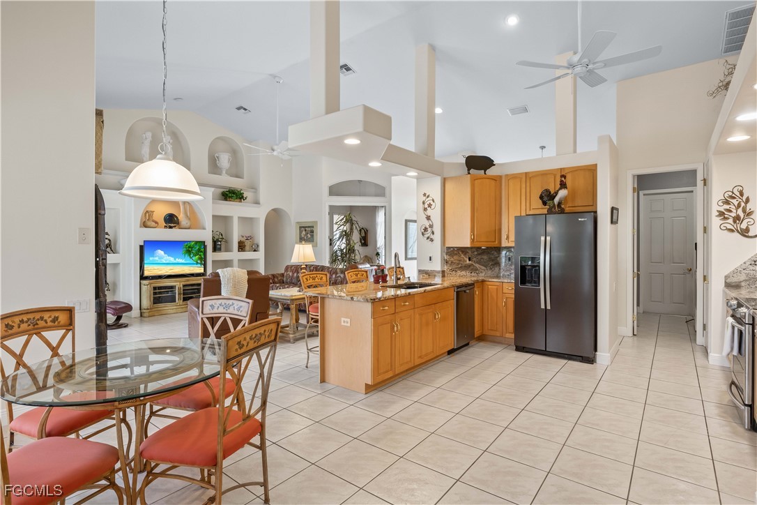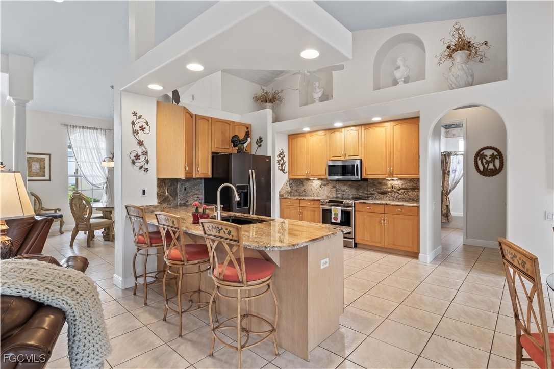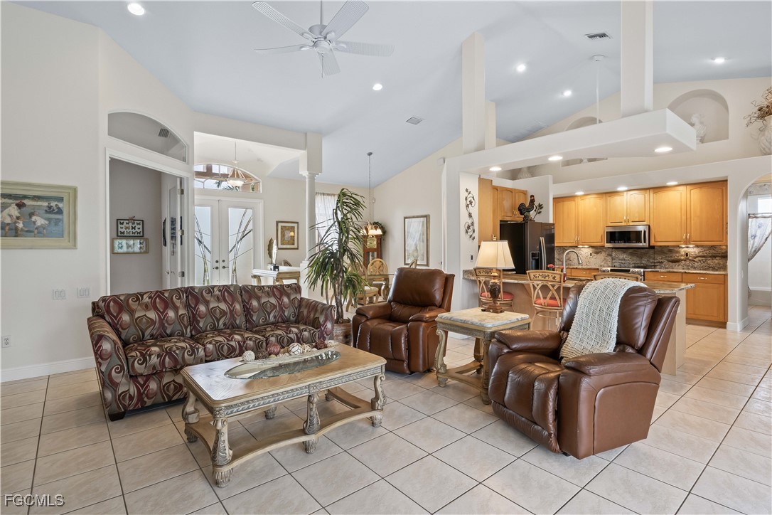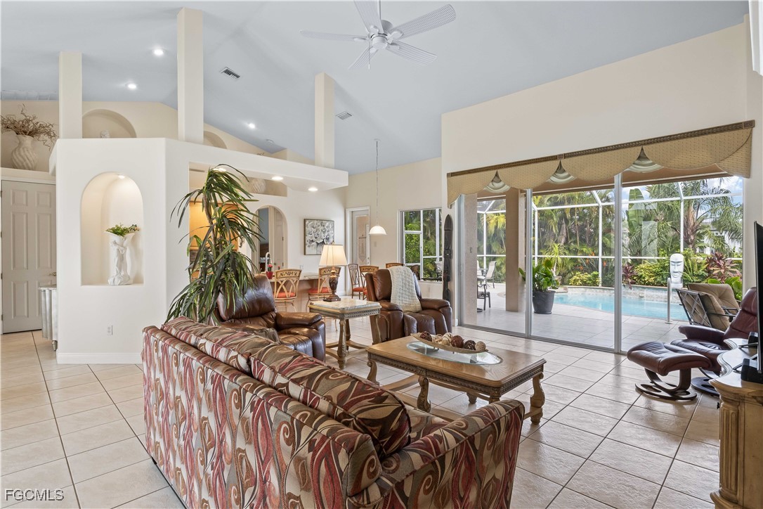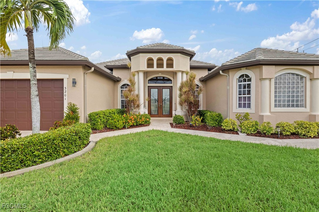 This large home has FLEXIBILITY! Add a "2nd home known as an Accessory Dwelling Unit, or workshop, or garage/workshop! HUGE LOT! Former Model Built on 2 lots of a 3-lot site allowing more uses of the property. The current AIR CONDITIONED GARAGE will hold more than 2 vehicles because it's 27' LONG, repeat 27 FEET LONG, making it able to hold up to 3 vehicles. Or hold your boat trailer. Or be a combo garage/workshop. Or hobby area. Or AC'd storage, etc. Plus the side yard has room to add an RV/boat garage, workshop, in-law suite, pickleball court, play area, or whatever. AC 2024; New tile roof 2021. Tiled lanai. Large Master suite with wrap around shower plus a 6' soaking tub. Office/Den has 2nd door to master suite/bath. Kitchen has breakfast/dining area adjoining the living area for an open floorplan. The spacious lanai overlooks the custom salt water pool with waterfall recently resurfaced looking brand new. The gorgeous backyard landscaping provides serene views. Electric rolldown shutters on large lanai and front entry. Remaining shutters are easy to install lightweight clear material. Located in the highly desired Ceitus Pkwy area near parks, Publix, restaurants and Matlacha attractions including Blue Dog, Micelis, and Yucatan. Parks have pickleball, tennis, playgrounds, exercise equip, kayak launch, fishing, walking/jogging paths, and more. Oasis Charter school just a few blocks away too. On City Utilities with PAID ASSESSMENTS. Easy access to anywhere via Burnt Store/Veterans or Pine Island Rd. This area is quickly becoming the preferred area of the Cape with many new and exciting projects and developments, both residential and commercial, that will make this area even more desirable. Flood insurance is transferrable.