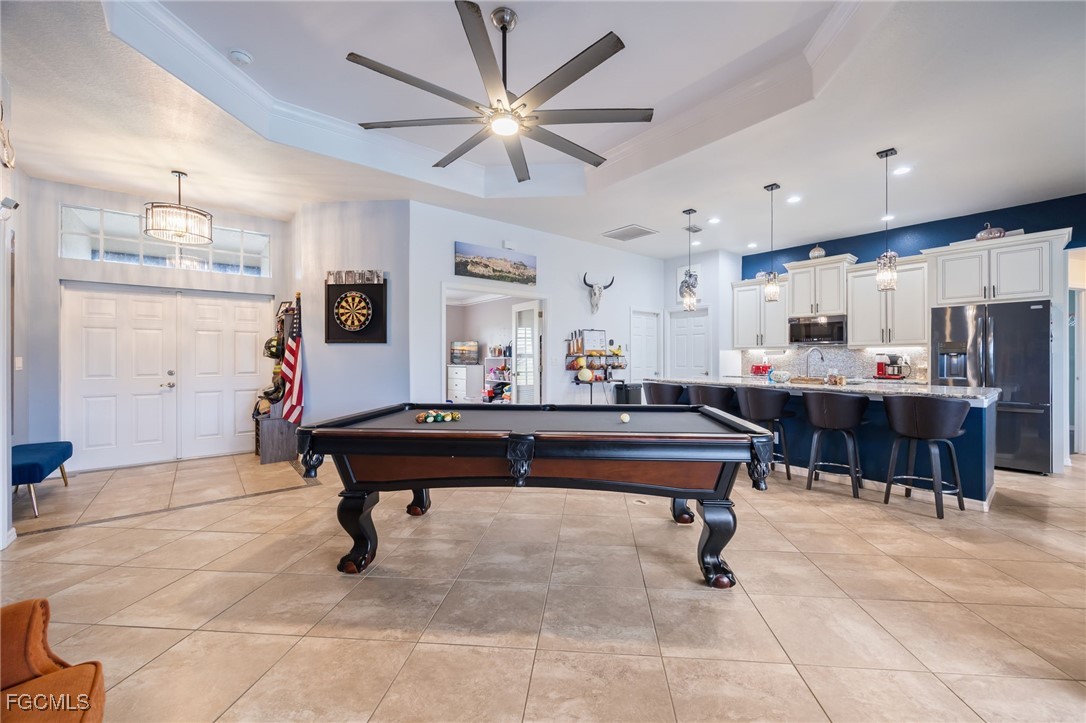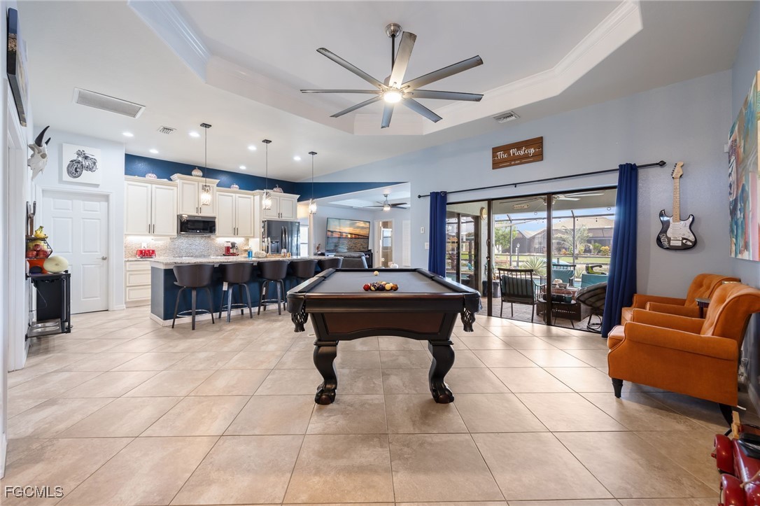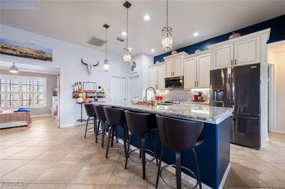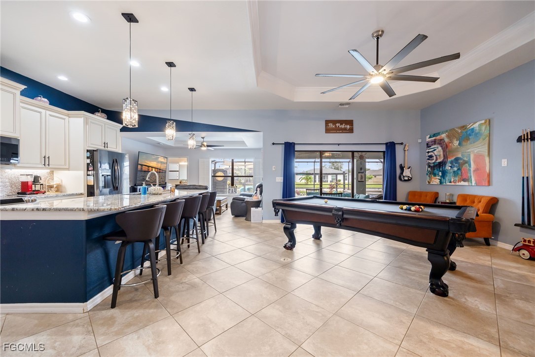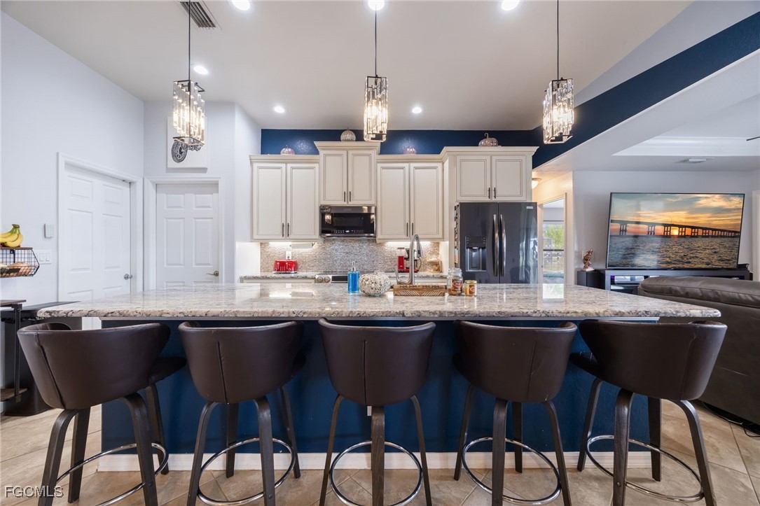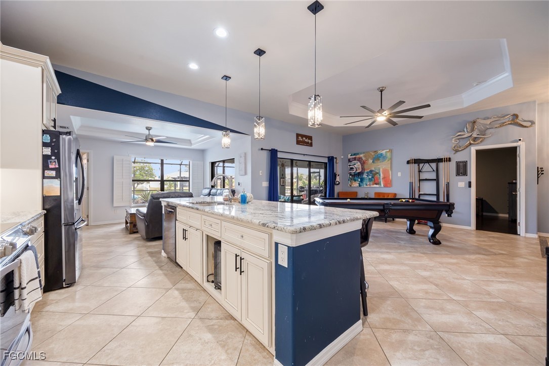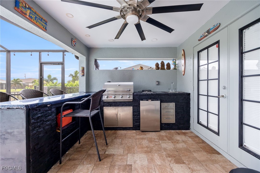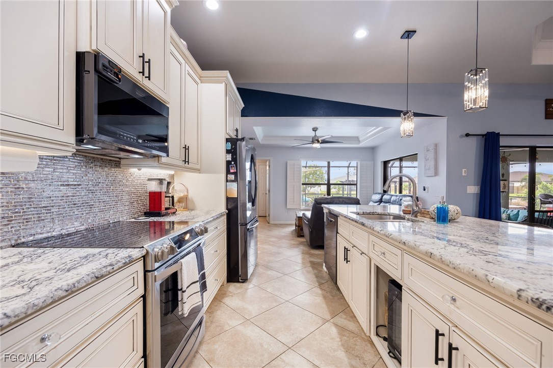 Experience the Best of Florida Living. This waterfront home is nestled on a triple-lot site, offering plenty of space for outdoor enjoyment. Perfect for your furry companions to roam freely! As you step inside, you'll find 3 bedrooms plus a den, ideal for a home office or additional guest space. High coffered ceilings and an open-concept kitchen create a bright, airy ambiance. Soft-close light cabinetry, a spacious granite island with seating for guests, and modern pendant and recessed lighting. Stainless steel appliances include an induction cooktop, providing both efficiency and style. Easy to maintain tile and wood laminate flooring run throughout the home. Step outside to your private oasis. A spacious pool and spa, both of which can be heated to enjoy year-round. A convenient outdoor shower is available for rinsing off after a swim, and the fully equipped outdoor kitchen makes entertaining perfect. Located just minutes from schools, shopping, dining, and only a short drive to Florida’s world-renowned beaches and resorts. Make this your Florida dream home today!