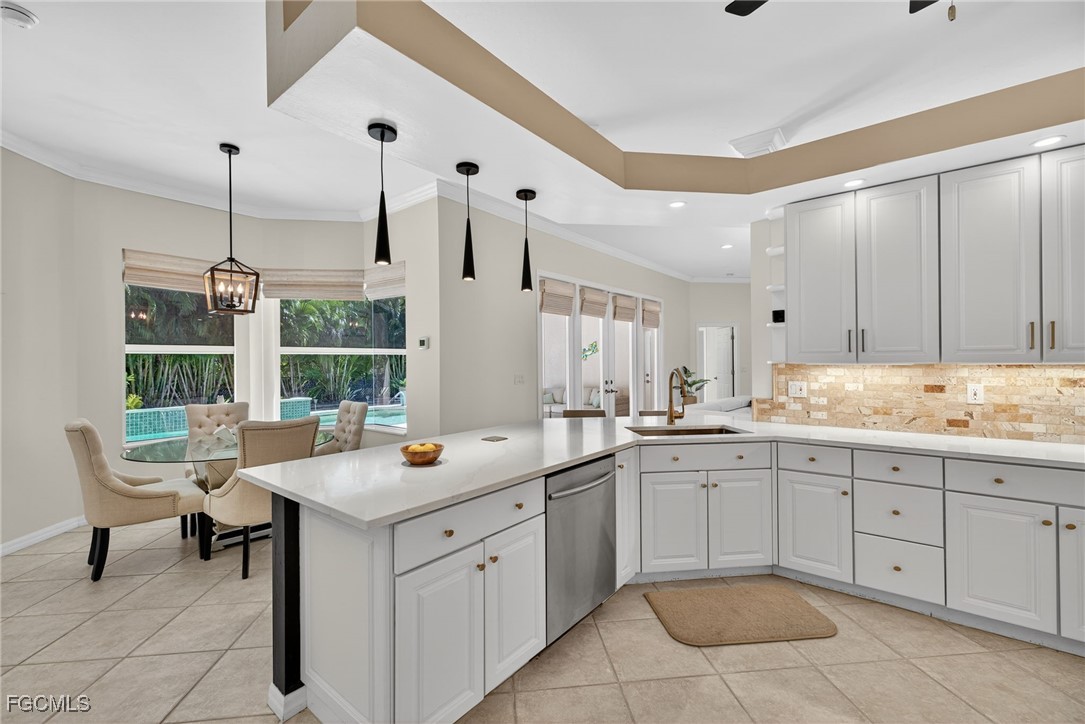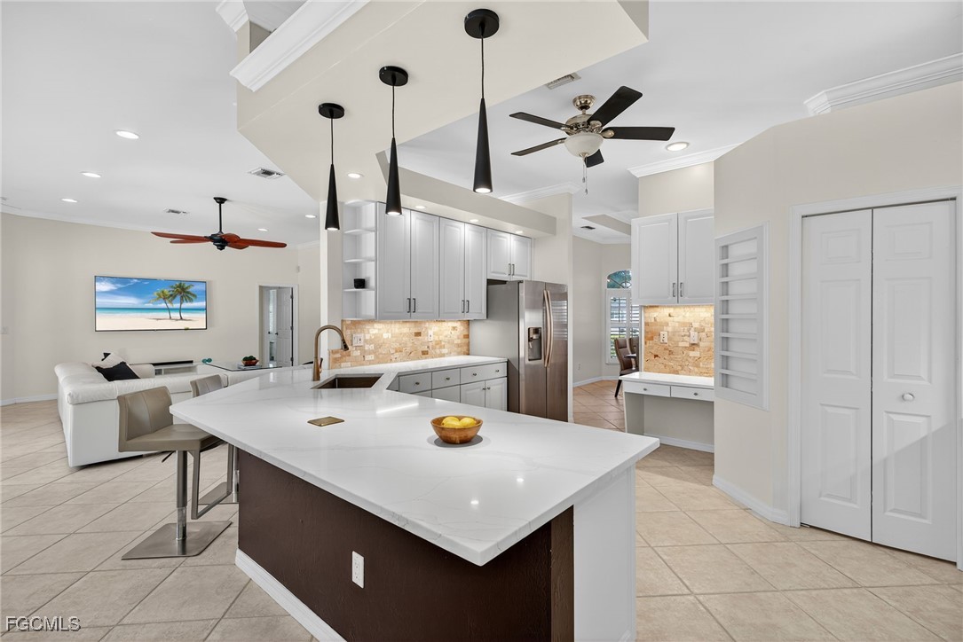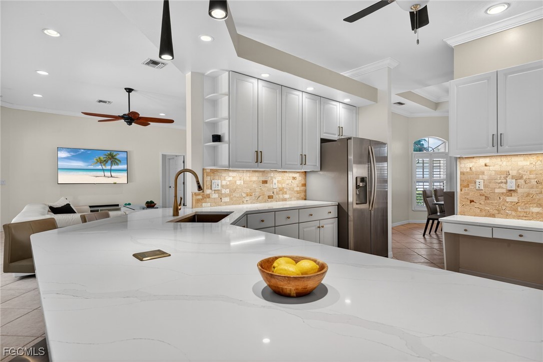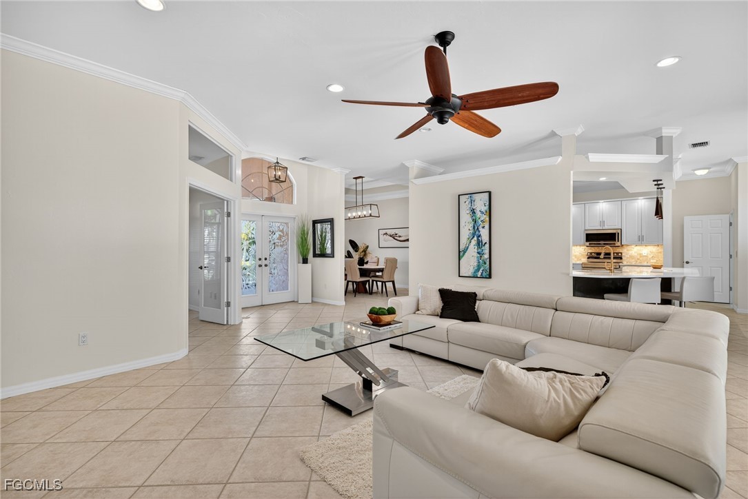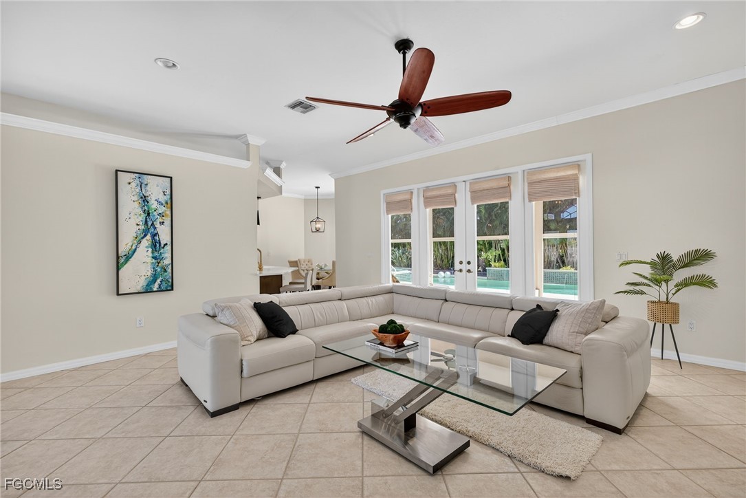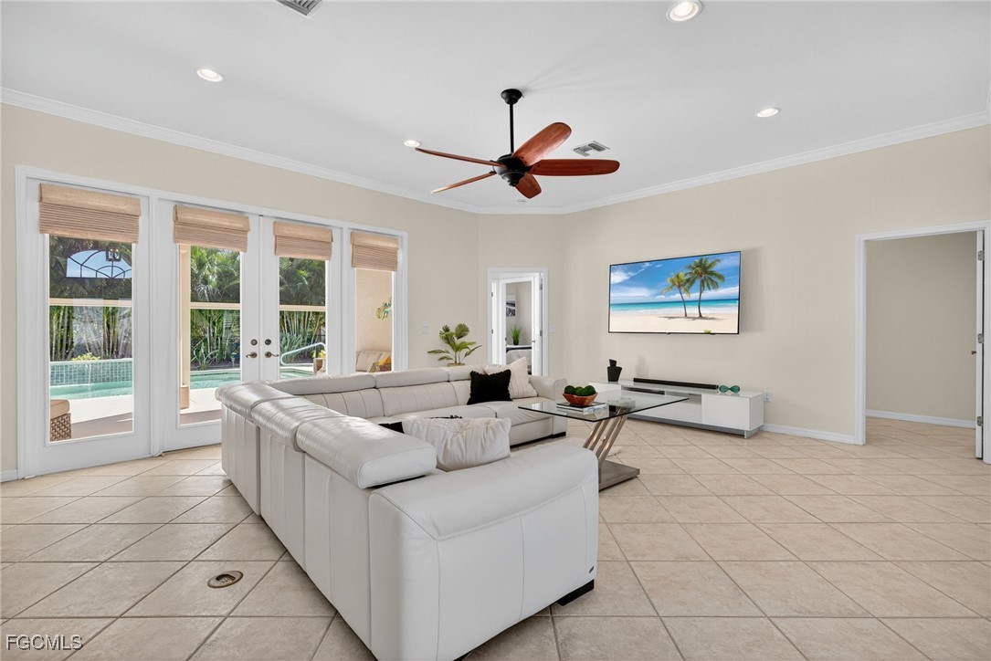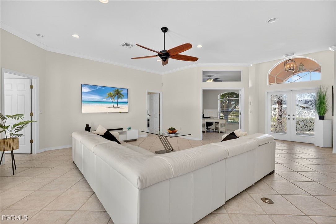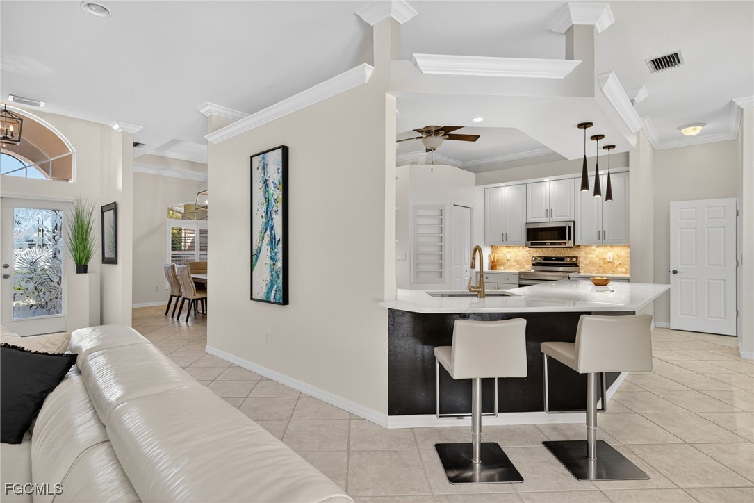 Attention VETERANS! Very LOW assumable mortgage rate. Stunning and spacious, this home features a grand double door entry that sets the tone for the elegance within. Situated on a spacious 3-lot site with desirable southern exposure in the Four Mile Cove Preserve neighborhood, this home is ideal for a large family or perfect as a seasonal rental. You’ll find attention to detail throughout. Tons of natural light fill the open interior, featuring three private bedroom suites, each with its own full bath. Enjoy tray ceilings, crown molding, plantation shutters, natural woven shades, large diagonal tile throughout, and two separate versatile offices ideal for working from home or creative space. The updated kitchen and baths showcase quartz countertops, work station sink, stainless steel appliances, a walk-in pantry, tons of cabinets, an extended island, and a breakfast nook overlooking the pool. Step outside to your oversized pool and spa with waterfall and lanai complete with automatic roll-down SPF bug sunscreens—your own private oasis surrounded by lush landscaping, shade trees, tropical birds of paradise, and a new sprinkler system to keep it all vibrant. Additional highlights include a new privacy fence, no HOA fees, and all assessments in and paid. Peace of mind comes with a new A/C and ductwork (2023), plus storm-ready construction that withstood 150 mph winds and remained flood-free. All in a quiet neighborhood within walking distance to major stores, yet far enough away to enjoy total tranquility—just minutes to Veterans Bridge.