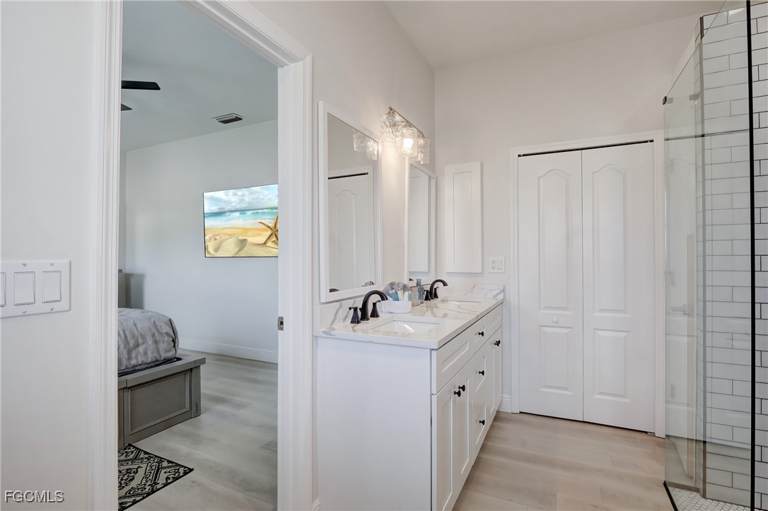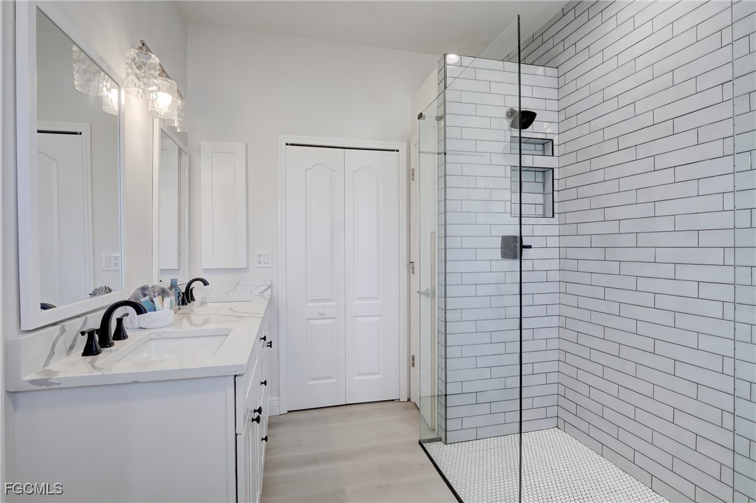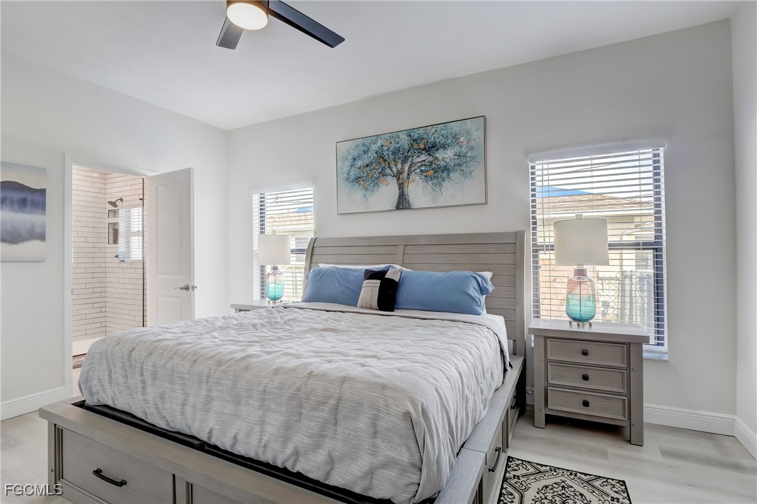 The primary suite and guest bedrooms are thoughtfully designed with neutral tones and laminate flooring throughout for easy maintenance and a clean, modern look. Both bathrooms are tastefully updated with white quartz countertops and classic subway tile showers, giving the home a timeless and cohesive style.