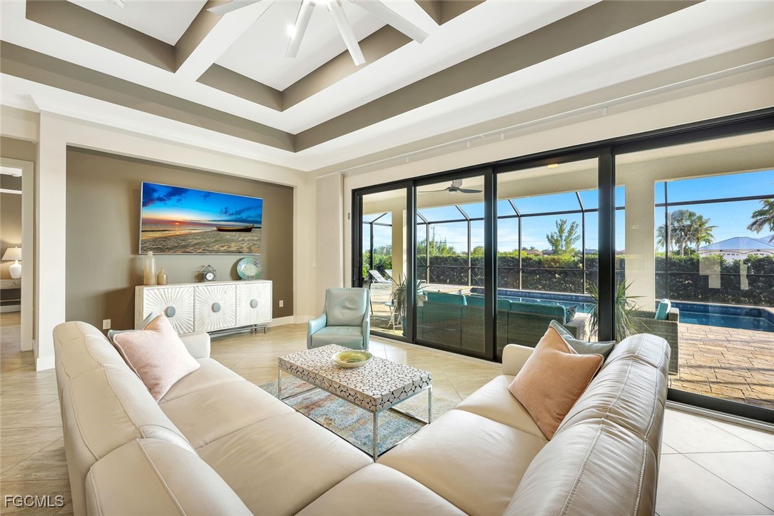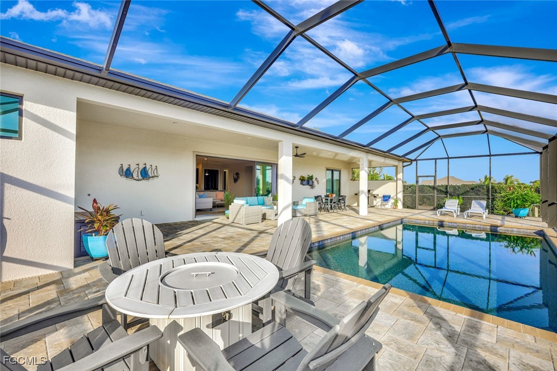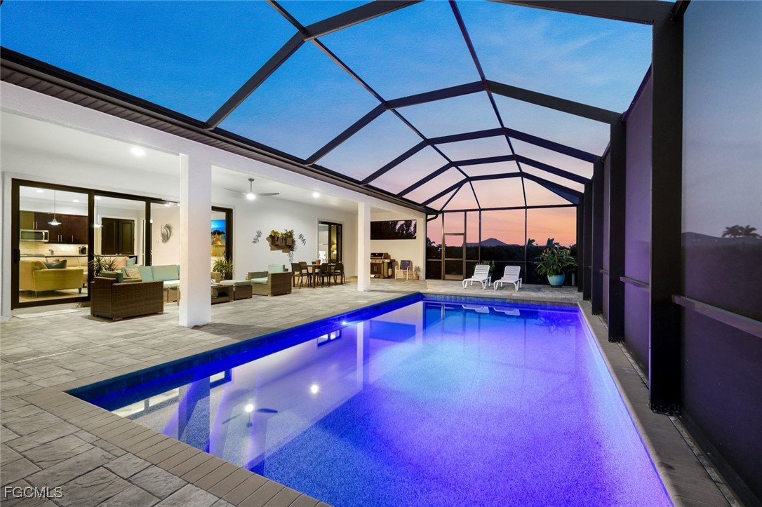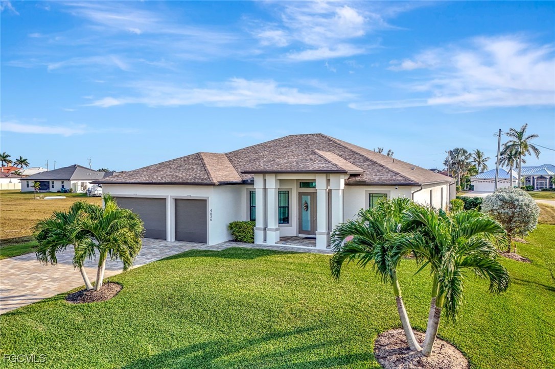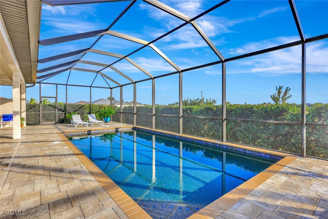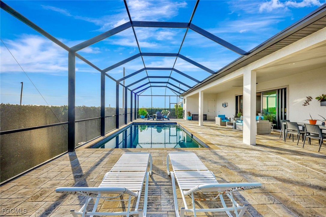 Welcome to this stunning better than new 2020 custom-built residence situated on a desirable corner lot in one of NW Cape Coral’s most peaceful and private neighborhoods. This immaculate 4-bedroom, 3-bath home offers an exceptional blend of modern luxury and everyday comfort, featuring coffered ceilings, 24" x 24" tile throughout, elegant crown molding, designer lighting, and expansive sliding glass doors that open to a resort-style outdoor oasis. The chef’s kitchen is equipped with upgraded Whirlpool stainless-steel appliances, premium cabinetry, pantry and an oversized stone waterfall island perfect for entertaining. The spacious owner’s suite provides direct lanai access, a relaxing retreat with a spa-inspired bathroom, dual vanities, a walk-through shower, and generous walk in closet space. Generously appointed guest bedrooms, while bedroom #4 includes its own ensuite pool bath for added guest convenience. The outdoor living area showcases a beautiful lap-style PebbleTec finish with auto pool filler, a large under-truss lanai, panoramic screened enclosure, and serene sunset views, all enhanced by mature privacy hedges surrounding the property. Additional upgrades include a new roof (2023), 2024 exterior paint, reverse osmosis system, hard-wired security, whole-home surge protection, and a generator hookup at the electric meter. A spacious three-car garage, pavered driveway, and lush landscaping further elevate this already remarkable home. Ideally located near the future Seven Islands development, Burnt Store Boat Ramp, marinas, New Crystal Lake Park and waterfront dining, this residence stands out as one of the finest off-water properties in NW Cape Coral—offering luxury, privacy, and modern convenience at every turn. Schedule your private showing today.