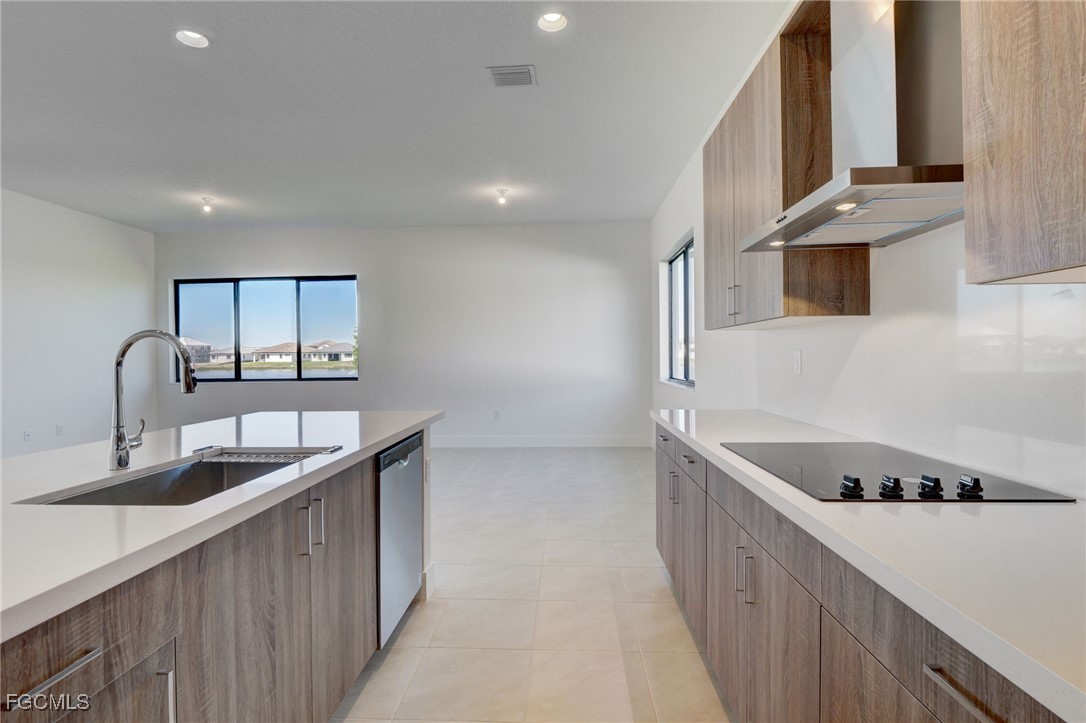microwave/oven combo, refrigerator, and dishwasher. The open-concept design seamlessly connects the kitchen, dining, and living areas,