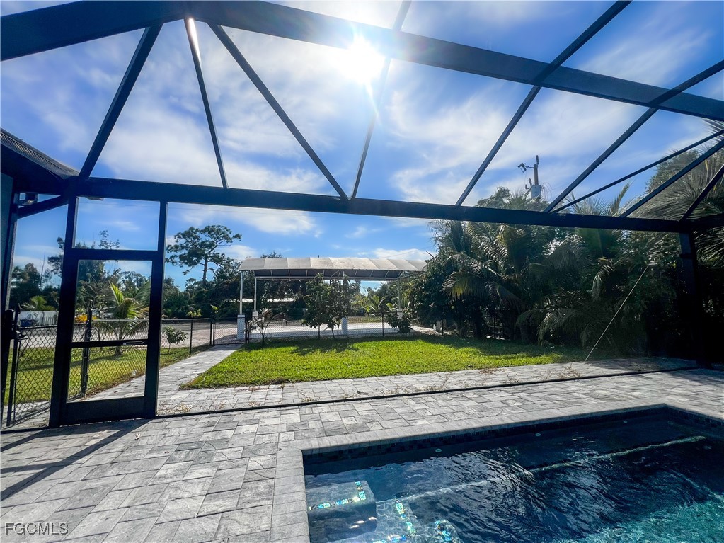 Welcome to this stunning HOME nestled on 0.64 acres, offering the perfect blend of style, comfort, and functionality. NO FLOOD ZONE. Inside, you’ll find elegant tile flooring throughout and a modern sophisticated color palette. The custom-designed kitchen features cabinetry, a coffee bar, and a dedicated entertaining bar area. His and hers walk in closets, modern blinds. Step outside to experience true Florida living. The expansive outdoor space includes a fully equipped outdoor kitchen, panoramic screened enclosure, and a beautiful 15x40 saltwater pool complete with an outdoor rinsing shower. Tiled garage with AC split offers multiple options, designated work space like office, gym, game room, kids playground etc, full bathroom for easy access. For added convenience, the property includes a tiled outdoor storage shed, plus an additional oversized shed ideal for boats, RVs, or extra storage. Enjoy the lush setting with fruit trees and abundant space to relax and savor the Florida lifestyle, fully fenced for optimum privacy.