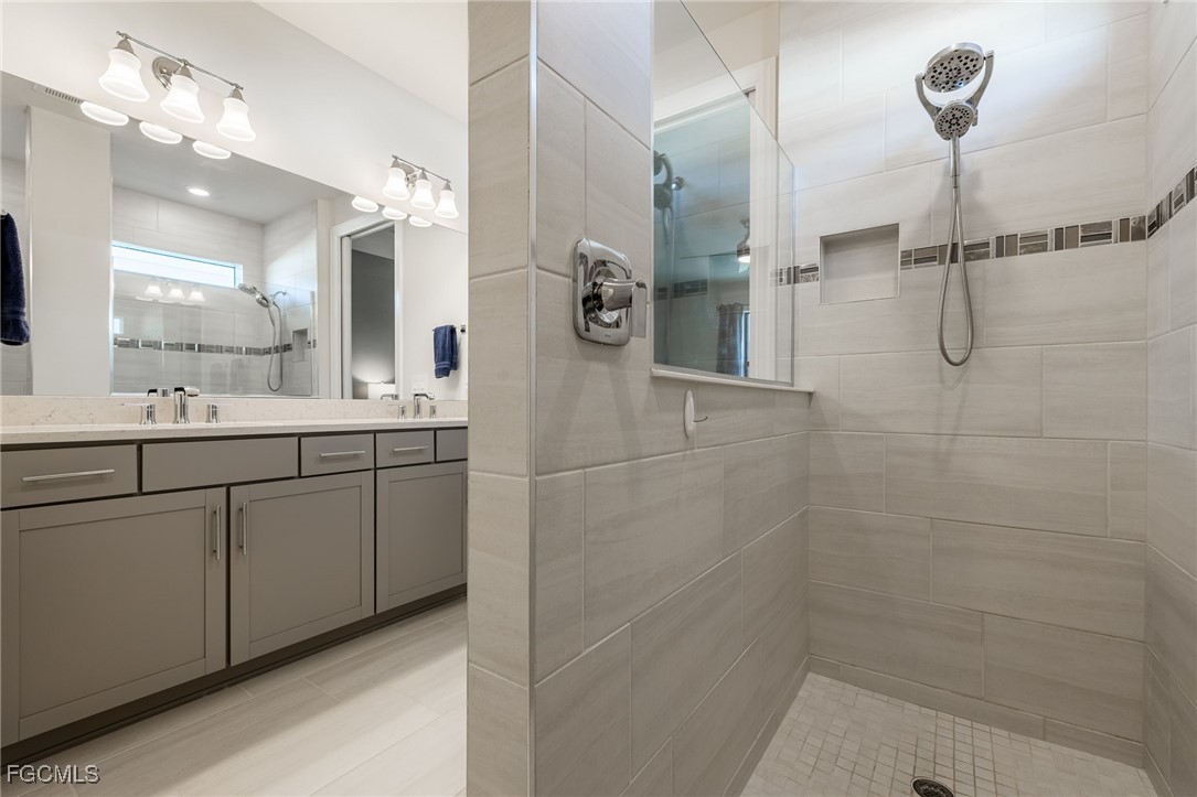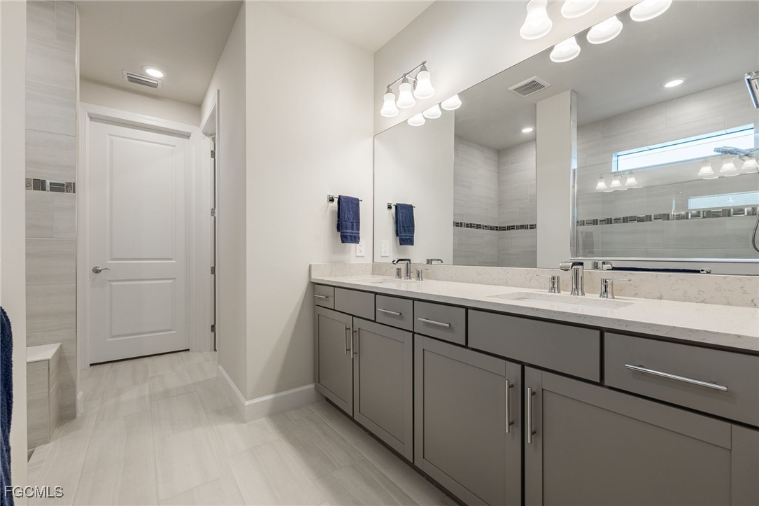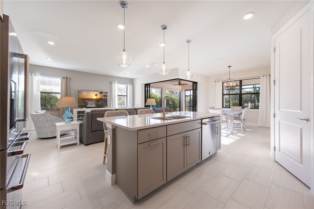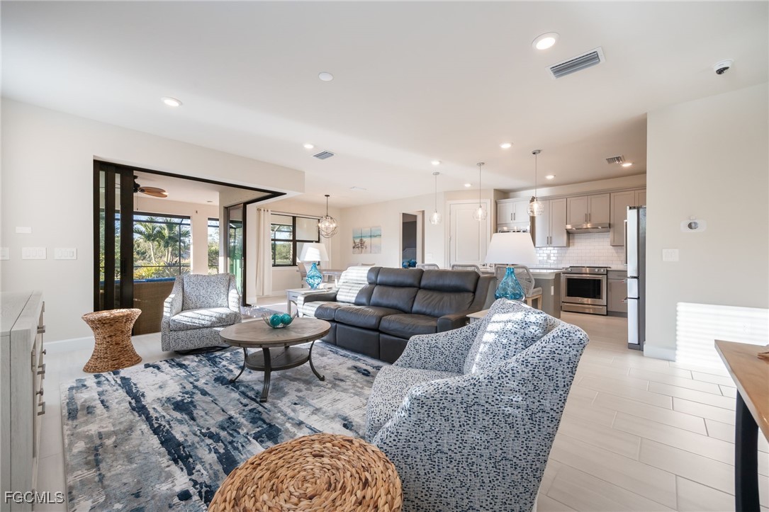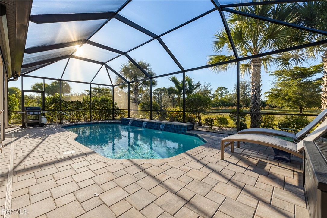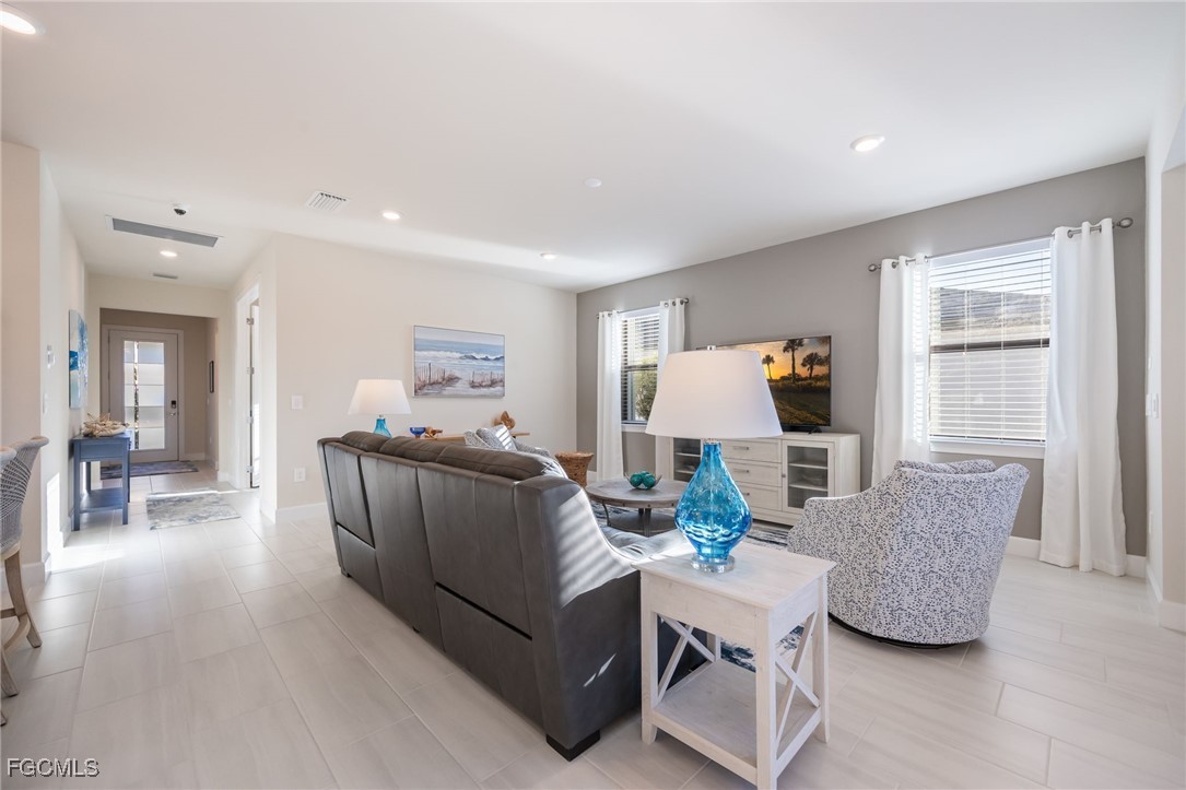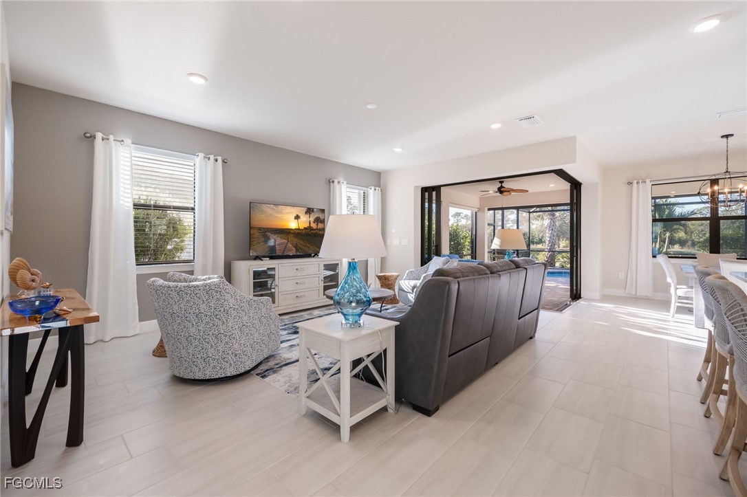 Stunning pool home with peaceful lanai retreat nestled in the highly sought-after Hampton Lakes at River Hall. Very desirable Pulte Mystique open floor plan with 3 bedrooms, 2 bathrooms, den/office/flex, spacious gathering room and café dining. Gourmet kitchen with large center island, 42” soft close cabinets with rollout trays, subway tile backsplash, upgraded stainless appliance package, pantry and ample storage. Great room with large zero corner sliding glass doors leading to private extended covered and screened lanai boasting a beautiful saltwater pool with soothing waterfalls, perfect for entertaining and relaxing with family and friends. Quartz countertops throughout including a large finished laundry room with cabinets and washtub. Spacious primary suite with spa-like ensuite bathroom featuring dual sinks, extended walk-in super shower and expansive walk-in closet. Upgraded tile flooring through-out with carpet in bedrooms. Home is equipped with a Smart Home System for modern living. Exterior also features new Storm Smart Hurricane Protection, Whole house gutters and additional professional landscaping package. With over 100k in upgrades, Seller has provided an extensive list for all visitors. Furniture is available for purchase under a separate contract. This home has been meticulously kept and is truly a pleasure to show.