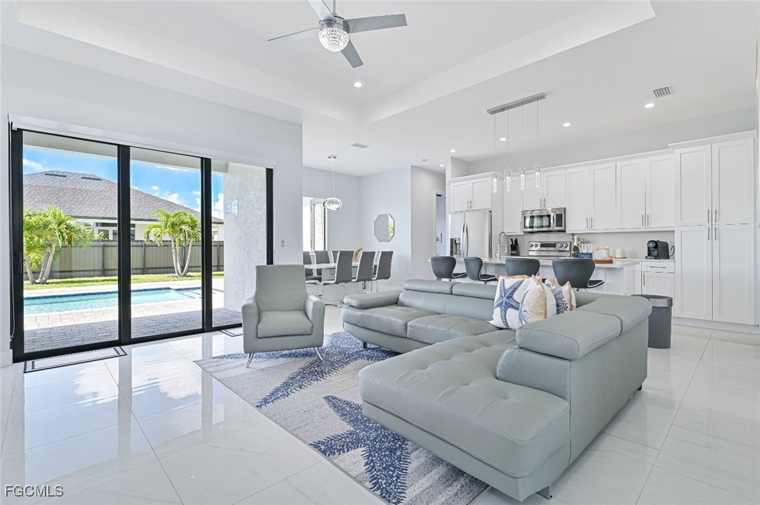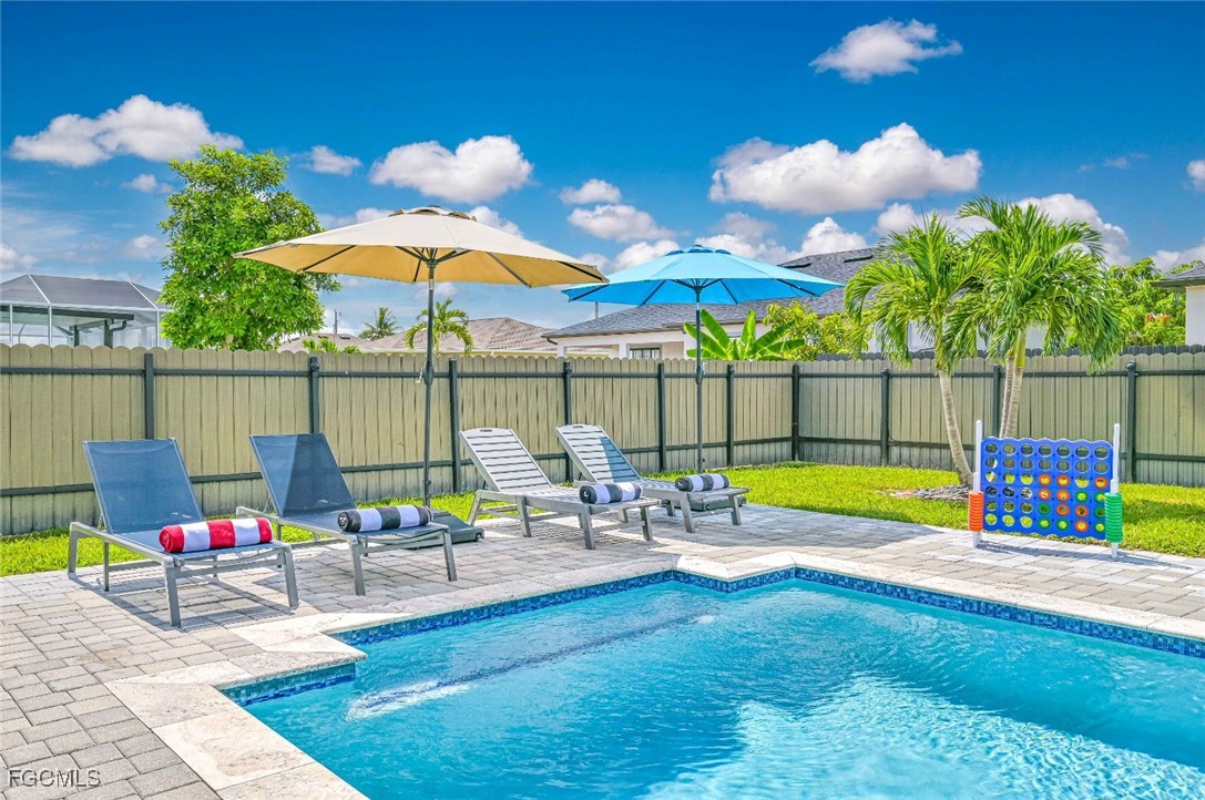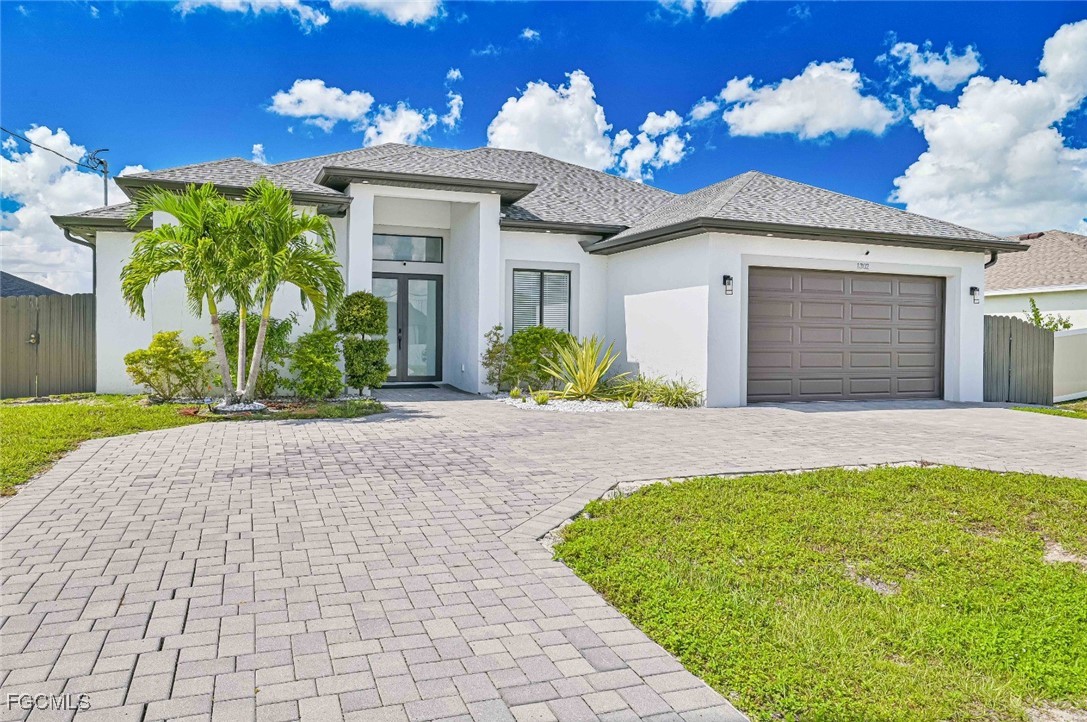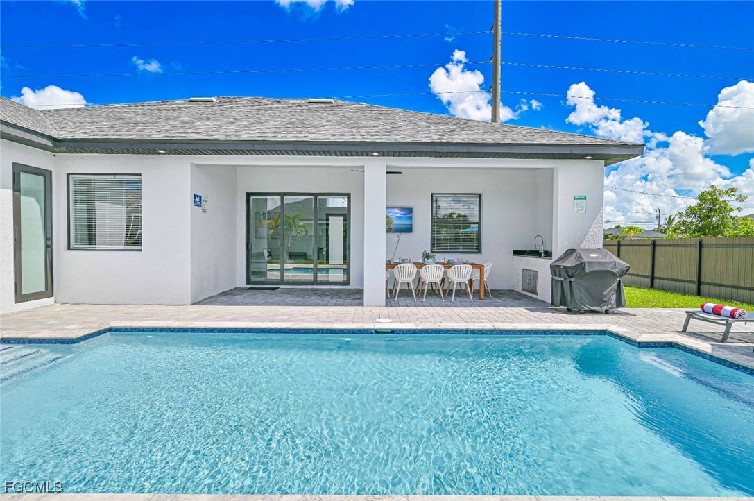 Welcome to this beautiful luxury property in the heart of Cape Coral. This 4-bedroom, 2.5-bathroom home boasts an unbeatable location, close to shopping, restaurants, parks, and top-rated schools, making it convenient for all types of families. IMPORTANT! this house IS NOT in flood Zone! It has city water and sewer. Making its value even more attractive to new buyers. The home features a modern style and hurricane-resistant windows and doors. The open design and high ceilings provide perfect natural light, highlighting every corner of the property. The kitchen features quartz countertops, stainless steel appliances, ample cabinetry, and an island with bar stools perfect for enjoying family breakfasts. The generously sized master suite includes two walk-in closets and a luxurious bathroom with double sinks, a spacious shower, and a separate toilet. Outside, the terrace boasts a family dining area, a barbecue, and a counter with a sink, ideal for food preparation at parties and family gatherings. Beyond, the amazing heated pool will be your favorite spot to relax on warm Florida afternoons. For added convenience, the easily accessible half-bath from the pool allows you to feel even more comfortable while relaxing on the terrace. Don't wait any longer and schedule a visit; this incredibly welcoming home could be your new Florida home!