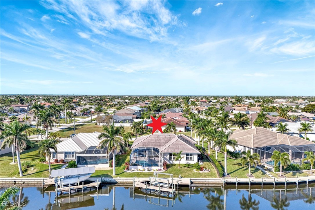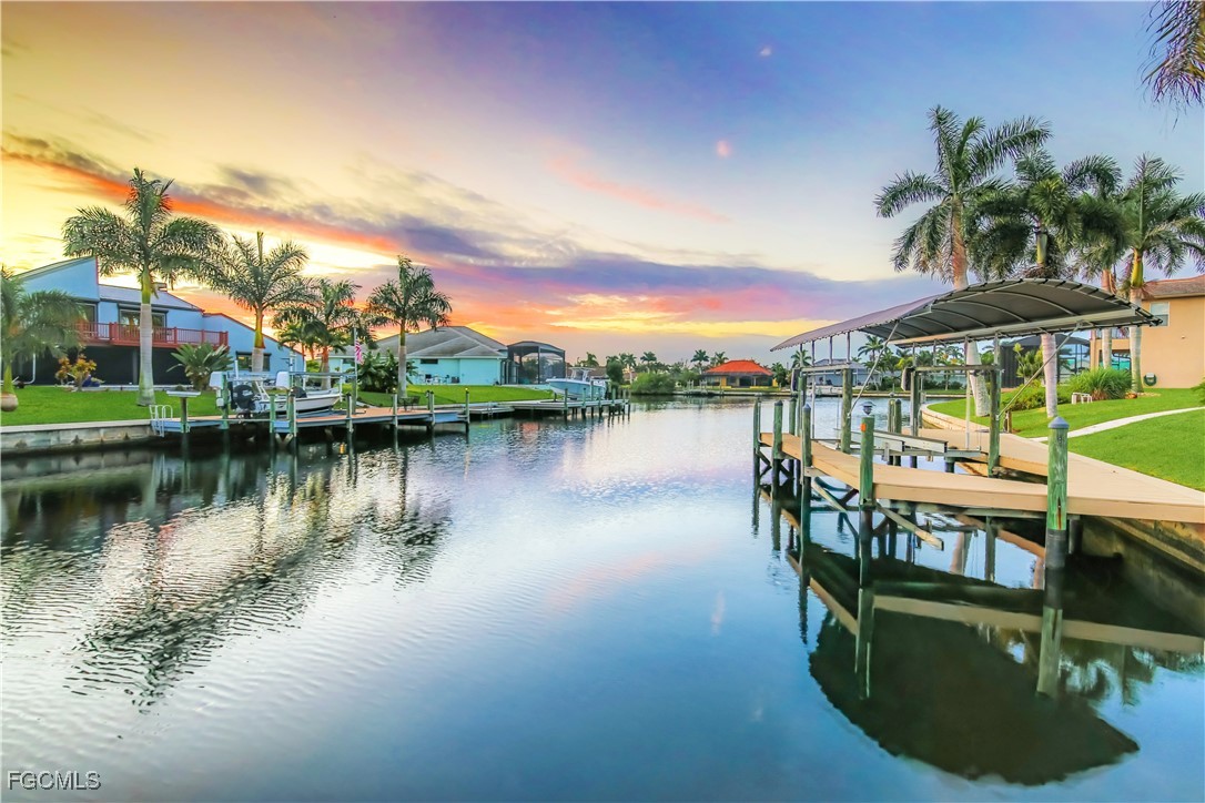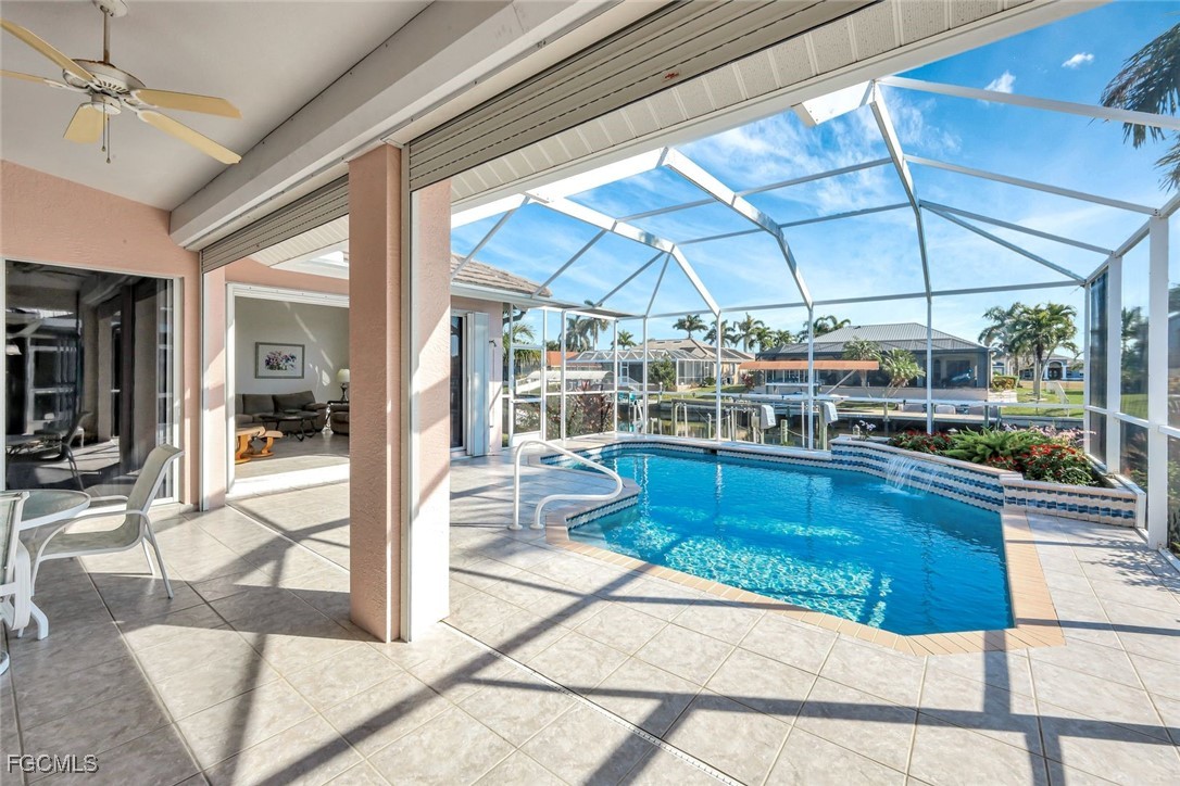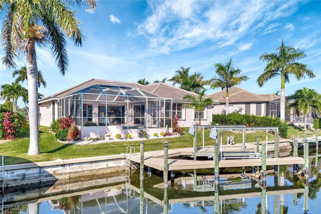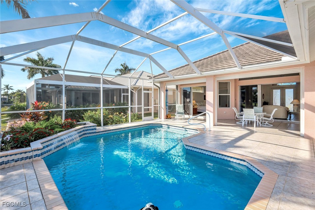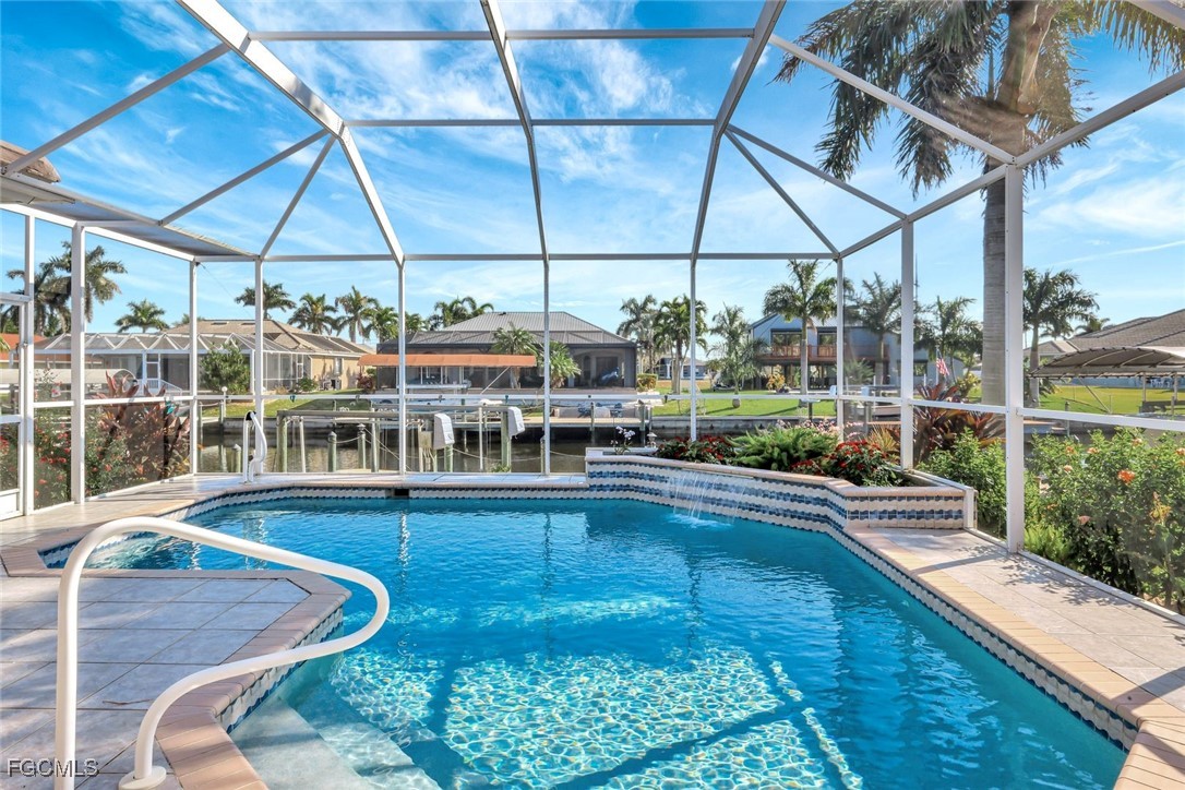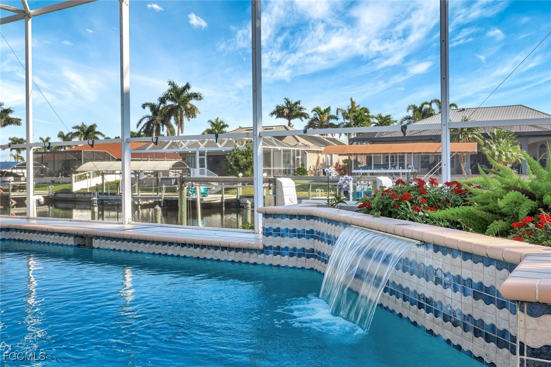 Experience the best of Cape Coral waterfront living in this meticulously maintained 3-bedroom, 3-bath, 2.5-car garage pool home with Gulf access and a private boat dock with lift. This residence offers an inviting open-concept layout with high 12 ceilings, multiple living spaces, and large sliders that extend the home seamlessly onto the screened lanai. An L-shaped pool with a waterfall feature and lush tropical landscaping creates a serene outdoor oasis perfect for entertaining or relaxing. Inside, the home features tile flooring throughout the main living areas and newly installed vinyl plank flooring in all bedrooms and closets. The kitchen is equipped with quality maple cabinetry with roll-out shelves, Whirlpool appliances, an under-sink filtration system, and a new sink faucet and disposal. The master suite includes two walk-in closets, custom window treatments, a Jacuzzi tub, a walk-in shower with grab bars, and a sliding door that opens to the lanai. Additional bedrooms offer large closets and bright natural light, while the guest bath includes a cast-iron tub. This home is equipped with roll-down and accordion shutters—five of which are motorized—for added peace of mind. A variable-speed Trane AC system with additional ductwork enhances comfort, and the alarm system includes child safety features on sliders to the pool area. The laundry room offers LG appliances, a utility sink, and abundant storage. The oversized 2.5-car garage includes reinforced doors, attic storage with a pull-down ladder, and a 50-gallon water heater. Outdoors, the exterior has been freshly painted, the dock has been treated with Acrylin, and the Black & Decker variable-speed pool pump enhances efficiency. Tropical landscaping flourishes with Royal palms, Foxtail, dwarf magnolia, and a variety of flowering plants, complemented by upgraded paver walkways and driveway, river rock accents, and concrete curbing. The property has never flooded, and flood insurance is paid through Junel 2026, offering additional reassurance. This well-cared-for home blends comfort, quality, and an exceptional waterfront lifestyle—ideal for boating, entertaining, or year-round Southwest Florida living.