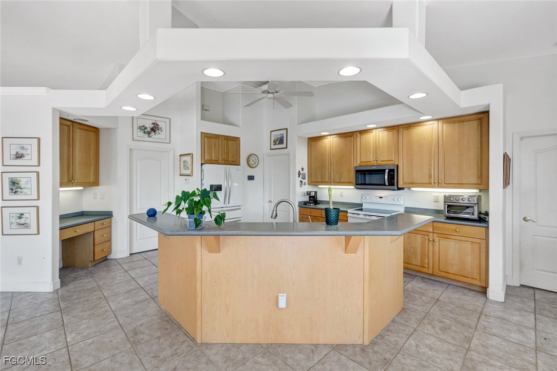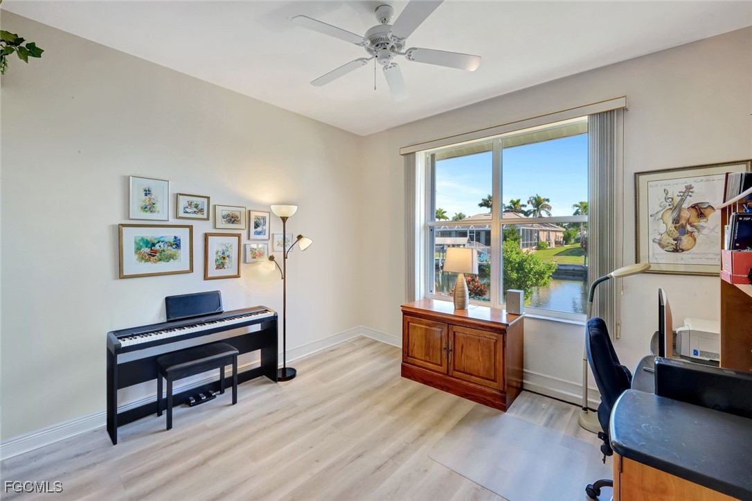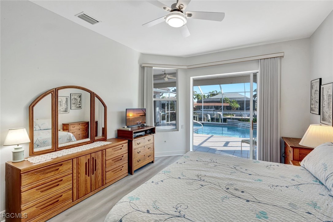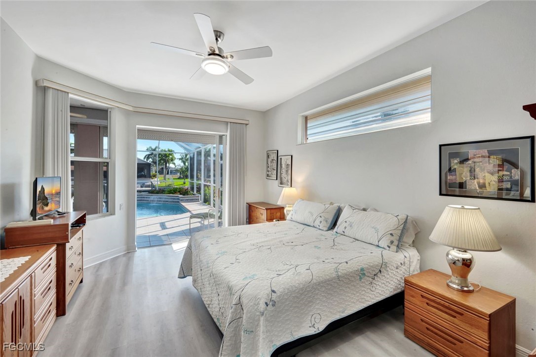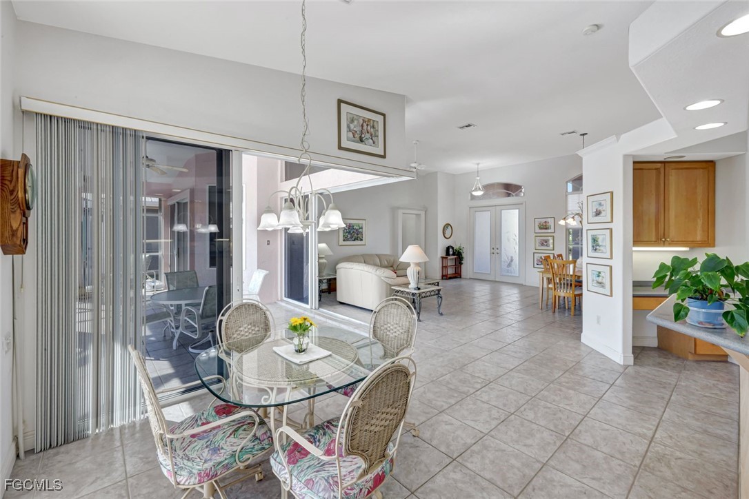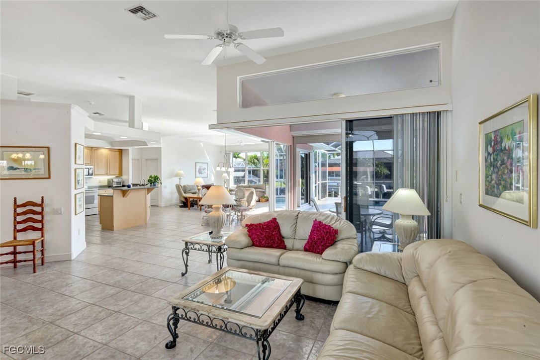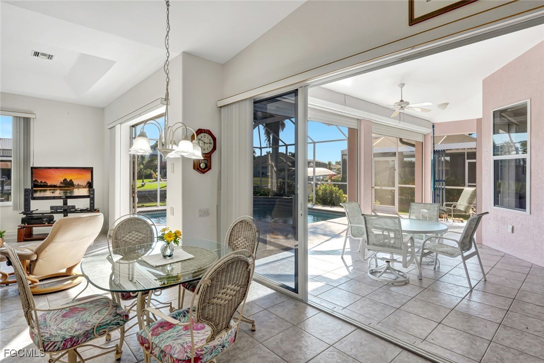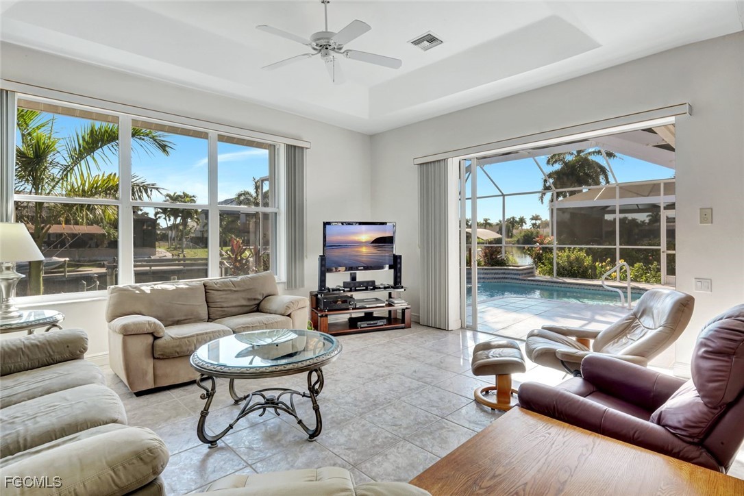 Experience the best of Cape Coral waterfront living in this meticulously maintained 3-bedroom, 3-bath, 2.5-car garage pool home with Gulf access and a private boat dock with lift. This residence offers an inviting open-concept layout with high 12 ceilings, multiple living spaces, and large sliders that extend the home seamlessly onto the screened lanai. An L-shaped pool with a waterfall feature and lush tropical landscaping creates a serene outdoor oasis perfect for entertaining or relaxing. Inside, the home features tile flooring throughout the main living areas and newly installed vinyl plank flooring in all bedrooms and closets. The kitchen is equipped with quality maple cabinetry with roll-out shelves, Whirlpool appliances, an under-sink filtration system, and a new sink faucet and disposal. The master suite includes two walk-in closets, custom window treatments, a Jacuzzi tub, a walk-in shower with grab bars, and a sliding door that opens to the lanai. Additional bedrooms offer large closets and bright natural light, while the guest bath includes a cast-iron tub. This home is equipped with roll-down and accordion shutters—five of which are motorized—for added peace of mind. A variable-speed Trane AC system with additional ductwork enhances comfort, and the alarm system includes child safety features on sliders to the pool area. The laundry room offers LG appliances, a utility sink, and abundant storage. The oversized 2.5-car garage includes reinforced doors, attic storage with a pull-down ladder, and a 50-gallon water heater. Outdoors, the exterior has been freshly painted, the dock has been treated with Acrylin, and the Black & Decker variable-speed pool pump enhances efficiency. Tropical landscaping flourishes with Royal palms, Foxtail, dwarf magnolia, and a variety of flowering plants, complemented by upgraded paver walkways and driveway, river rock accents, and concrete curbing. The property has never flooded, and flood insurance is paid through Junel 2026, offering additional reassurance. This well-cared-for home blends comfort, quality, and an exceptional waterfront lifestyle—ideal for boating, entertaining, or year-round Southwest Florida living.