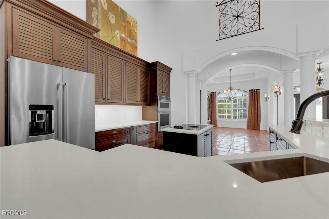 Nestled in the highly desirable Stonebridge subdivision, this 4-bedroom, 3-bath home offers the perfect combination of privacy, luxury, and convenience. With soaring ceilings, an open floor plan, and two spacious primary suites, this home is designed for comfort and entertaining. The kitchen, featuring quartz countertops, flows seamlessly into the formal dining room and great room. French doors open to a spacious patio with outdoor ceiling fans, overlooking a heated, screened-in pool with serene lake and fountain views.