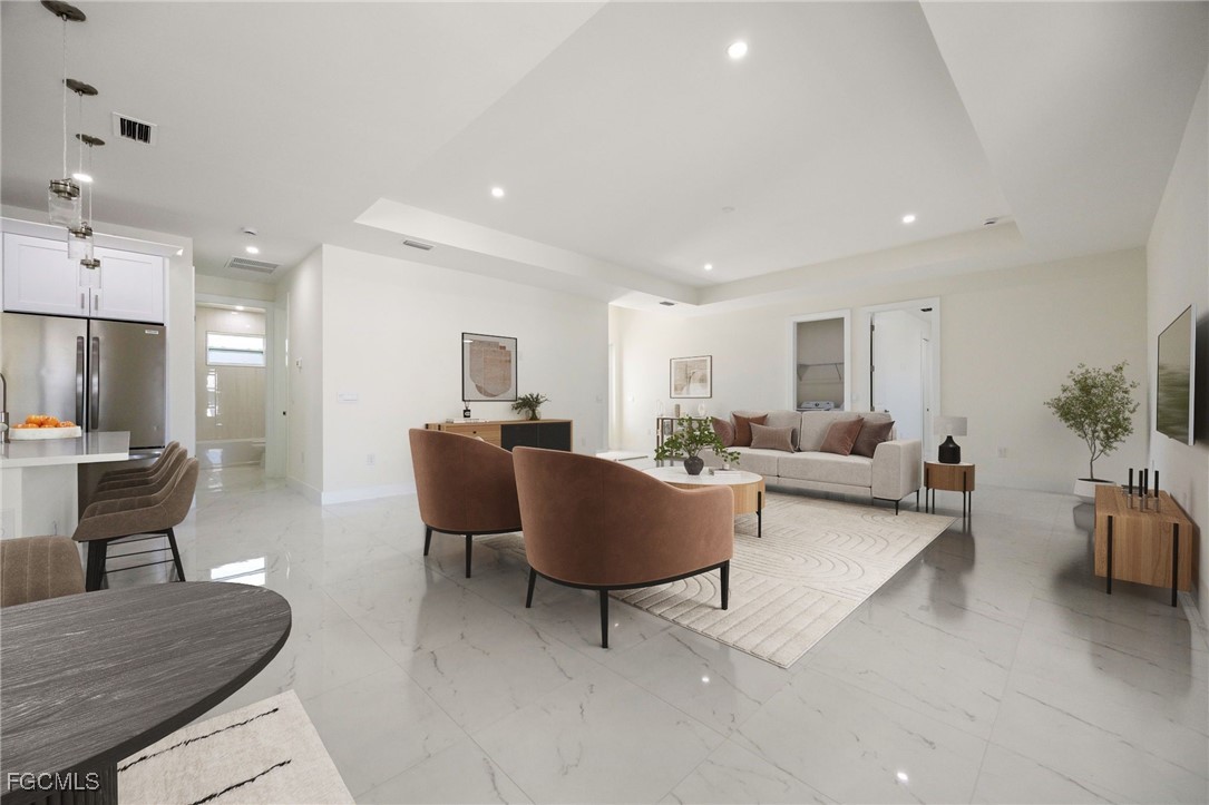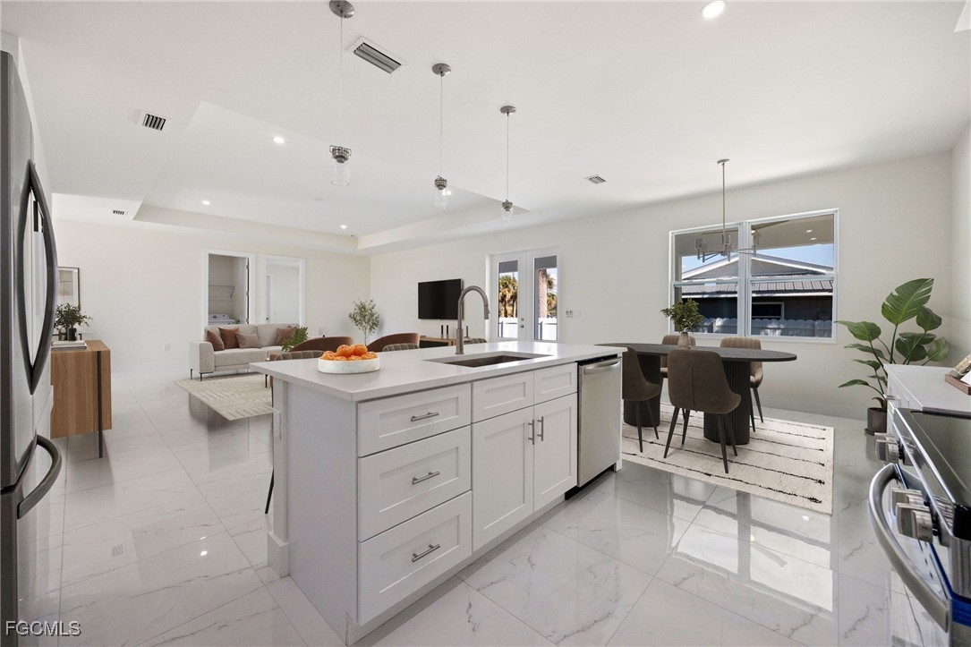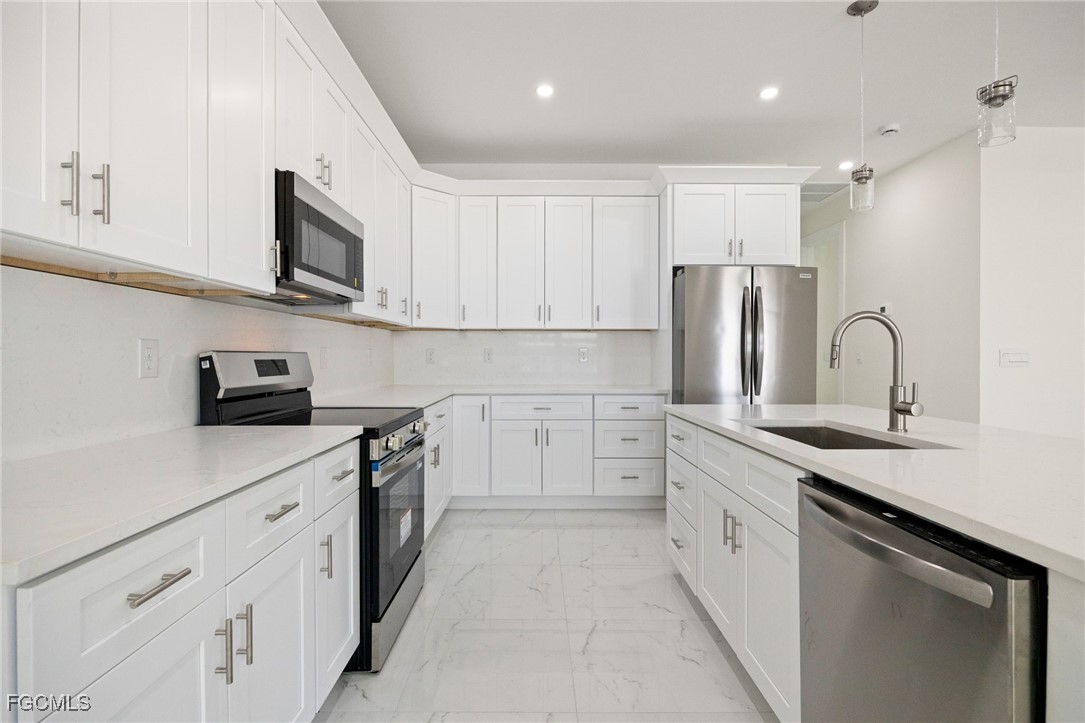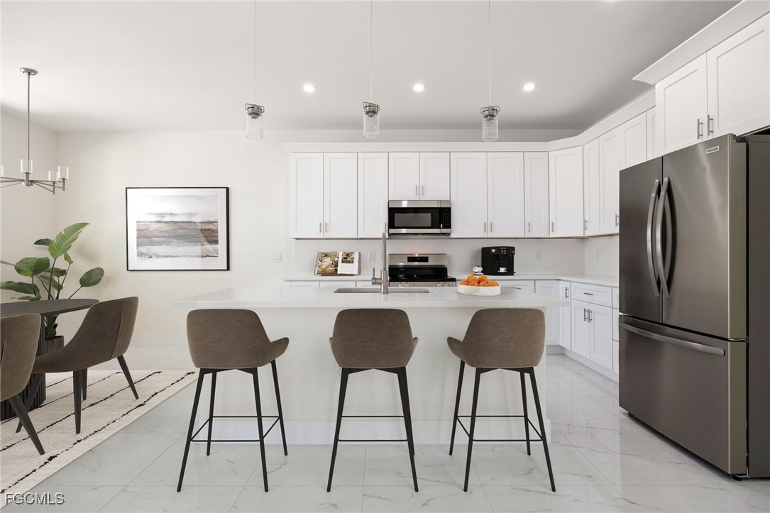 A set of elegant double entry doors opens to a spacious foyer and a thoughtfully designed open-concept floorplan. The kitchen serves as the heart of the home, featuring quartz countertops, white cabinetry with chrome hardware, and a full Frigidaire stainless steel appliance package. Natural light fills the adjoining living and dining areas, offering an ideal layout for both everyday comfort and entertaining.