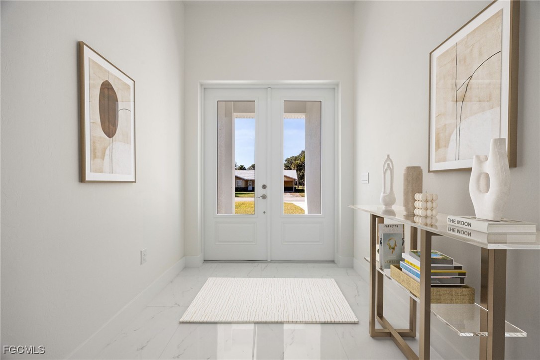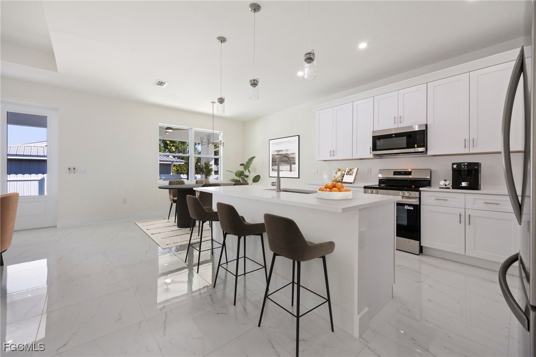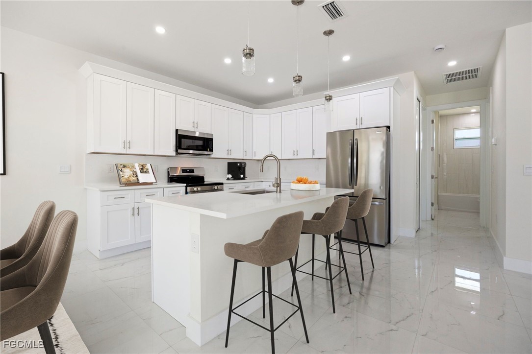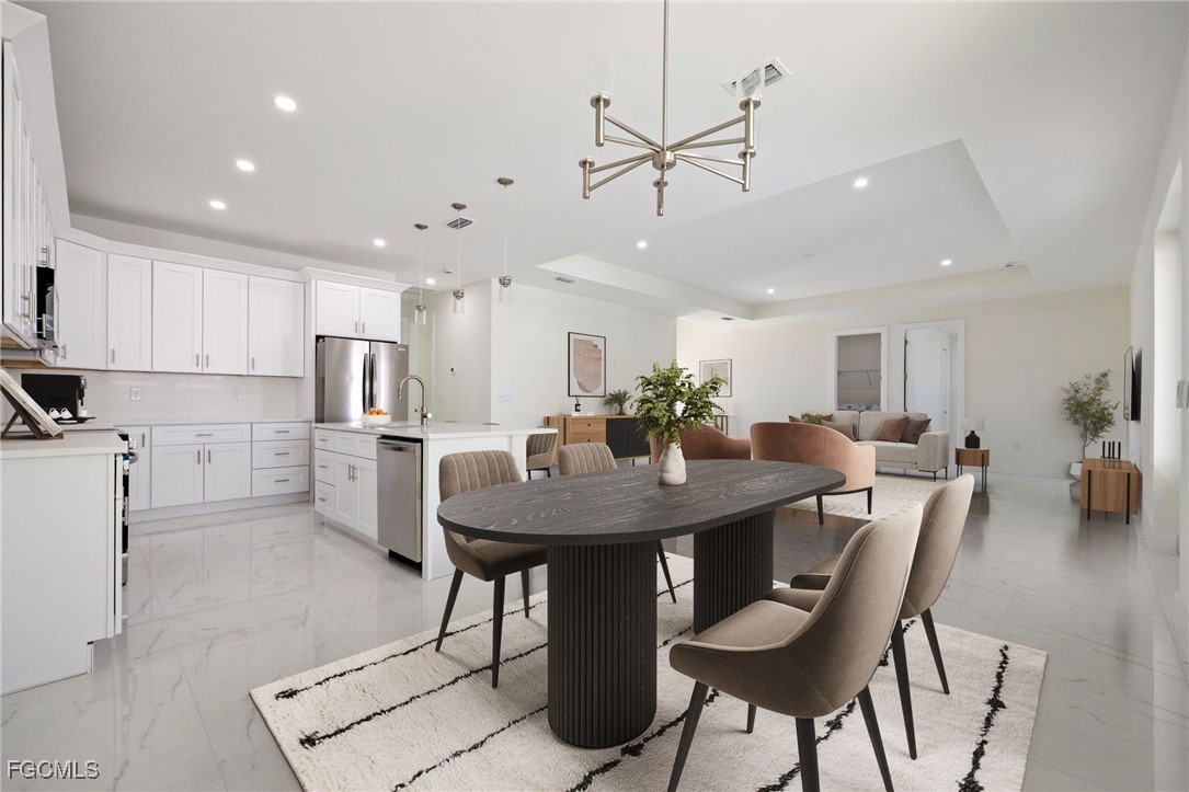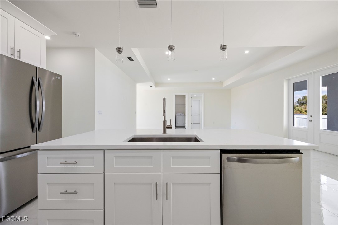 A set of elegant double entry doors opens to a spacious foyer and a thoughtfully designed open-concept floorplan. The kitchen serves as the heart of the home, featuring quartz countertops, white cabinetry with chrome hardware, and a full Frigidaire stainless steel appliance package. Natural light fills the adjoining living and dining areas, offering an ideal layout for both everyday comfort and entertaining.