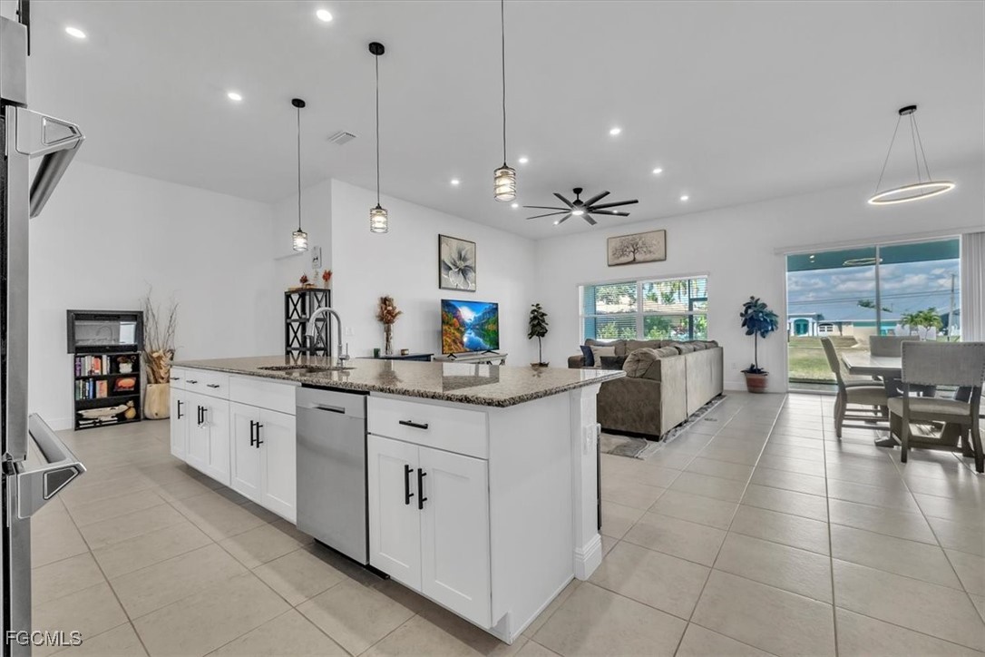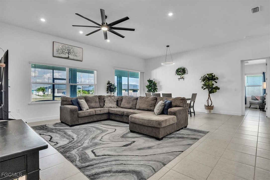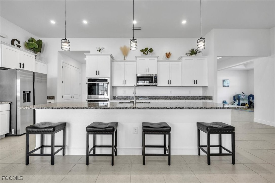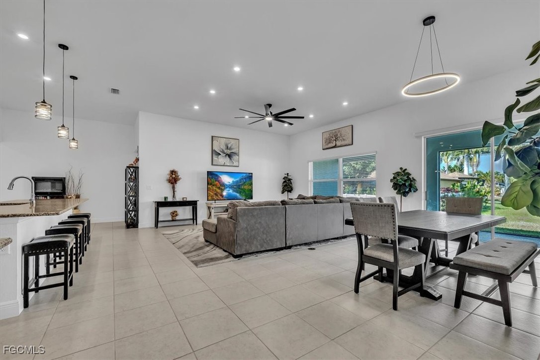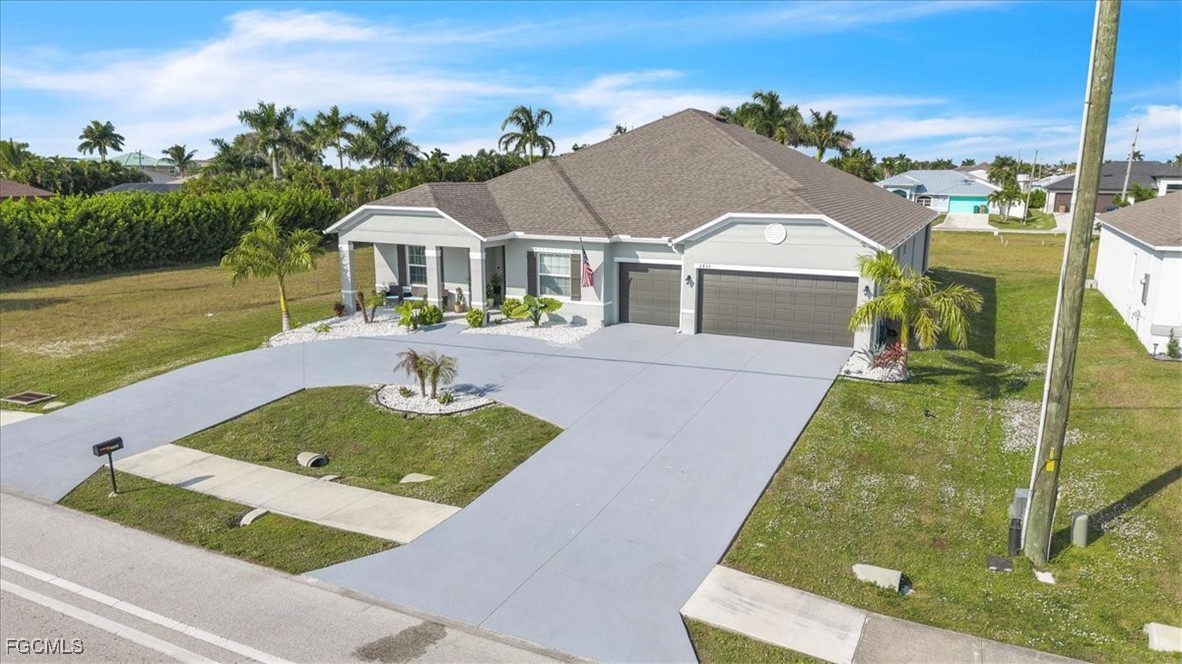 offering 3,000+ sq ft for under $550K—a rare find in today’s market! Step into this stunning, like-new 2023 modern masterpiece, perfectly situated in one of Cape Coral’s most desirable areas. With over 3,000 square feet of flexible, usable living space, this home is bursting with potential—ideal for large families, multigenerational living, in-laws, home offices, or anyone craving room to grow. Featuring 4 bedrooms, den, flex room, and 3 full baths, this thoughtfully designed layout delivers unmatched versatility. Enjoy multiple living zones, private bedroom wings, and abundant open space for gathering, relaxing, or creating the lifestyle you’ve been dreaming of. The expansive great room shines with soaring ceilings, tile throughout, and an open-concept design that feels bright, fresh, and modern. The upgraded chef’s kitchen is an entertainer’s dream—complete with a massive island, granite countertops, double oven, cooktop, breakfast bar seating, and extensive cabinetry. The luxurious primary suite offers a peaceful retreat with tray-vaulted ceiling, private lanai access, and a spa-style bath featuring a soaking tub, walk-in shower, and dual vanities. The guest wing is perfect for kids or extended family, with two bedrooms, walk-in closets, a bonus area, and a dual-vanity bath. The fourth bedroom sits near a third full bath with glass shower doors, while a den and flex space offers endless possibilities—extra bedrooms, offices, playrooms, formal dining or even an in-law suite. Outdoor living shines with an oversized screened lanai, inviting front porch, beautiful landscaping, and room for a pool. The 3-car garage includes epoxy flooring. A spacious laundry room with cabinets, sink, and folding counter adds everyday convenience. Whole-house surge protection. ASSUMABLE FLOOD POLICY included for added value. Surrounded by newer homes and just minutes from saltwater canals, parks, marinas, top-rated schools, restaurants, shopping, and beaches.