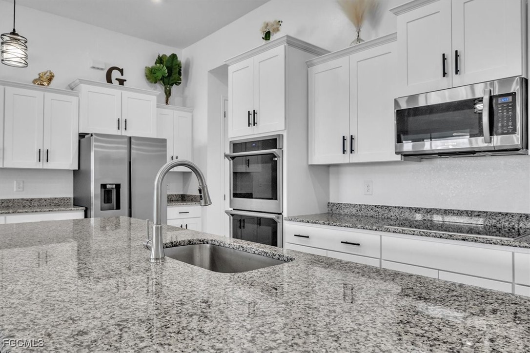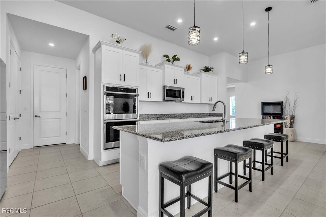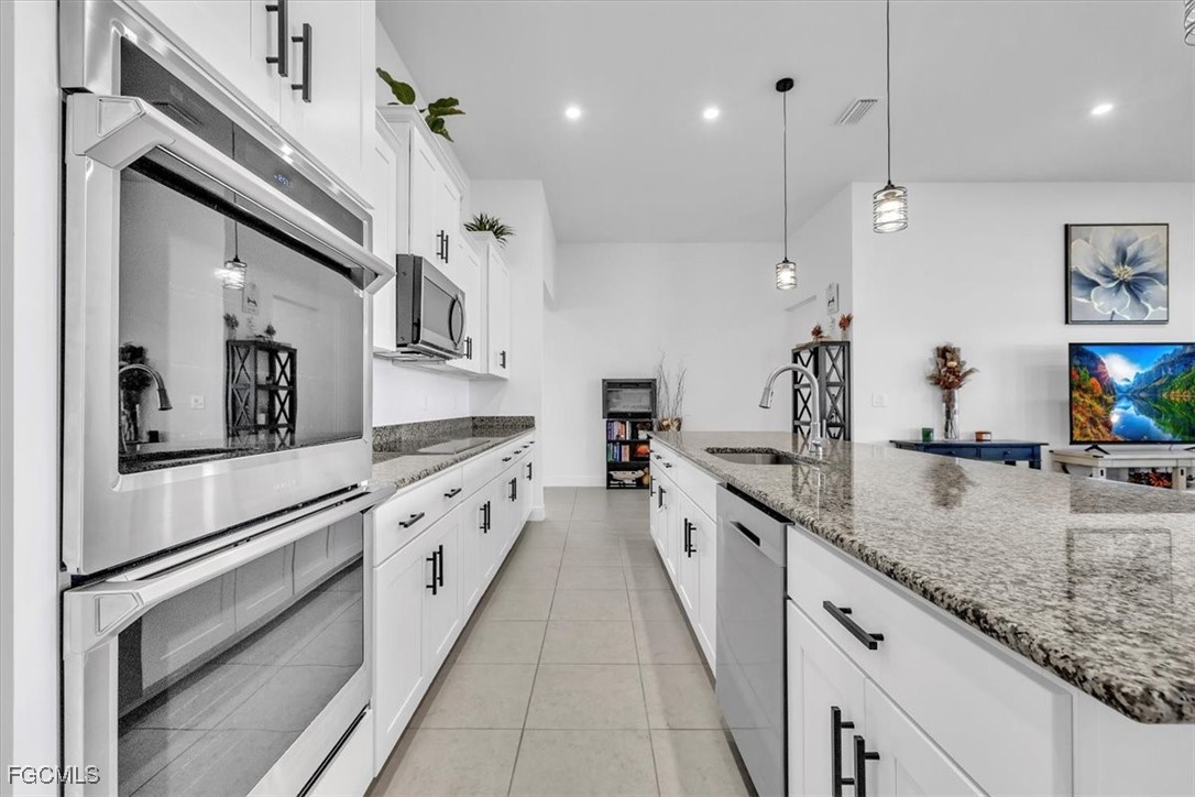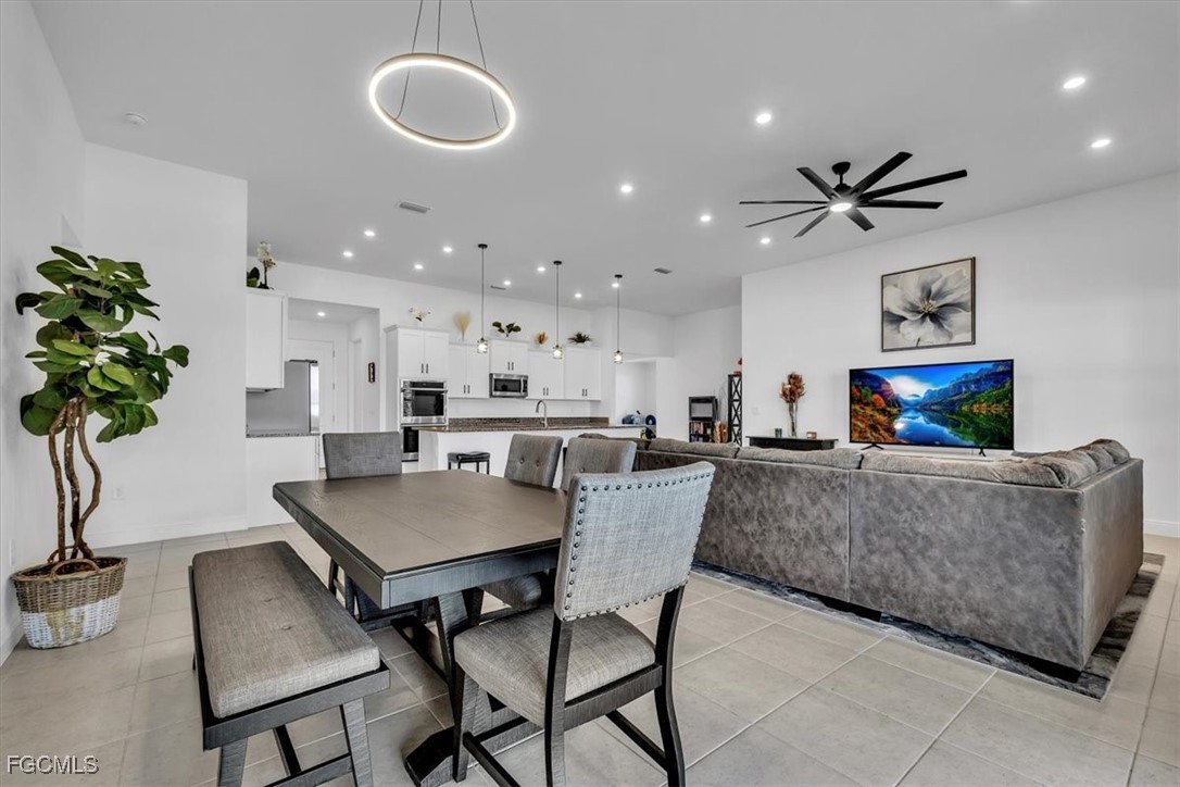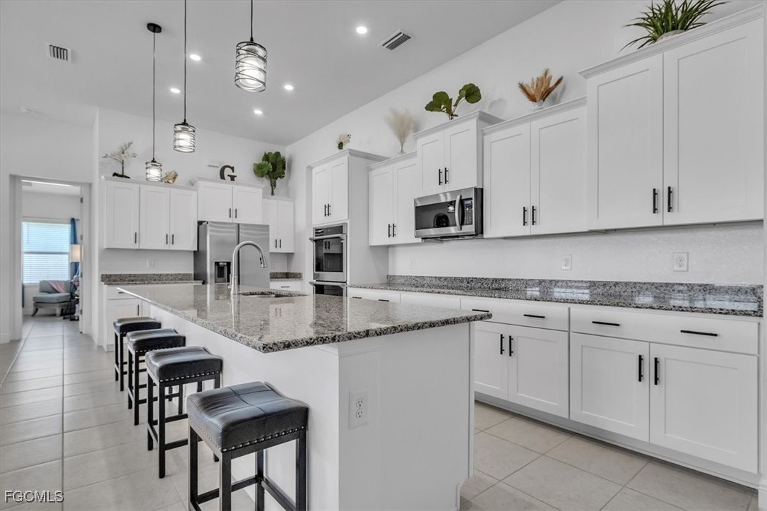 offering 3,000+ sq ft for under $550K—a rare find in today’s market! Step into this stunning, like-new 2023 modern masterpiece, perfectly situated in one of Cape Coral’s most desirable areas. With over 3,000 square feet of flexible, usable living space, this home is bursting with potential—ideal for large families, multigenerational living, in-laws, home offices, or anyone craving room to grow. Featuring 4 bedrooms, den, flex room, and 3 full baths, this thoughtfully designed layout delivers unmatched versatility. Enjoy multiple living zones, private bedroom wings, and abundant open space for gathering, relaxing, or creating the lifestyle you’ve been dreaming of. The expansive great room shines with soaring ceilings, tile throughout, and an open-concept design that feels bright, fresh, and modern. The upgraded chef’s kitchen is an entertainer’s dream—complete with a massive island, granite countertops, double oven, cooktop, breakfast bar seating, and extensive cabinetry. The luxurious primary suite offers a peaceful retreat with tray-vaulted ceiling, private lanai access, and a spa-style bath featuring a soaking tub, walk-in shower, and dual vanities. The guest wing is perfect for kids or extended family, with two bedrooms, walk-in closets, a bonus area, and a dual-vanity bath. The fourth bedroom sits near a third full bath with glass shower doors, while a den and flex space offers endless possibilities—extra bedrooms, offices, playrooms, formal dining or even an in-law suite. Outdoor living shines with an oversized screened lanai, inviting front porch, beautiful landscaping, and room for a pool. The 3-car garage includes epoxy flooring. A spacious laundry room with cabinets, sink, and folding counter adds everyday convenience. Whole-house surge protection. ASSUMABLE FLOOD POLICY included for added value. Surrounded by newer homes and just minutes from saltwater canals, parks, marinas, top-rated schools, restaurants, shopping, and beaches.