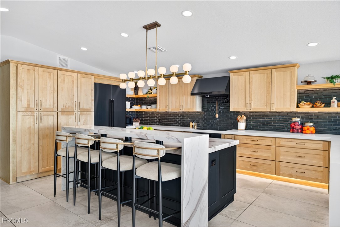 Inside, the heart of the home is a stunning chef’s kitchen, anchored by premium Dacor appliances, a waterfall-edge cascading island, warm natural cabinetry, sleek black finishes, and new granite surfaces throughout. A hidden walk-in butler’s pantry with an ice machine ensures the main kitchen stays pristine while entertaining. Under-cabinet lighting and a state-of-the-art SONOS sound system enhance the entire living experience. All major appliances were newly installed in 2024.