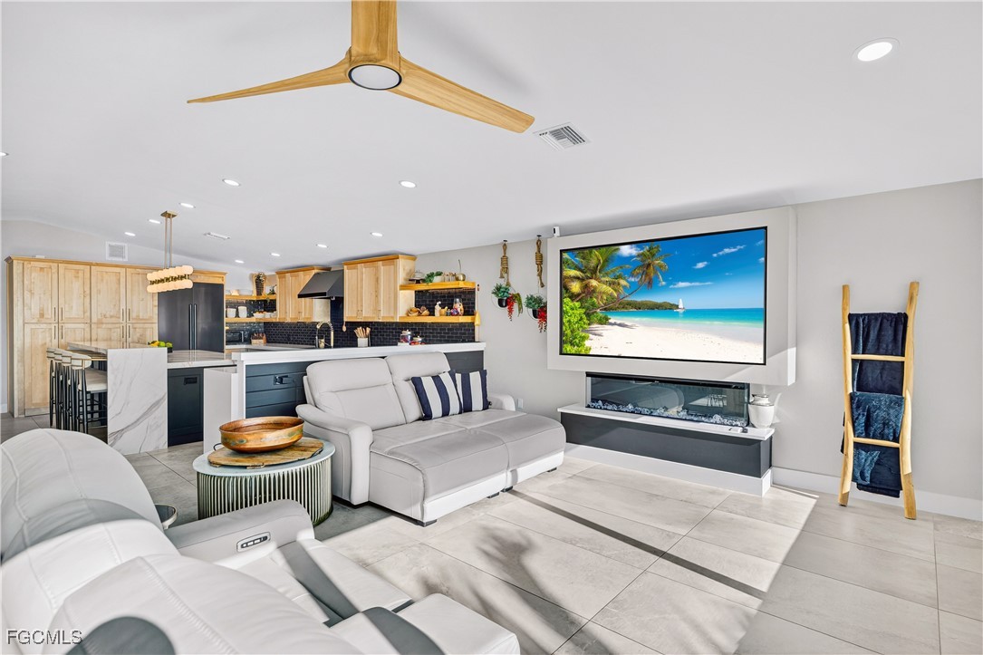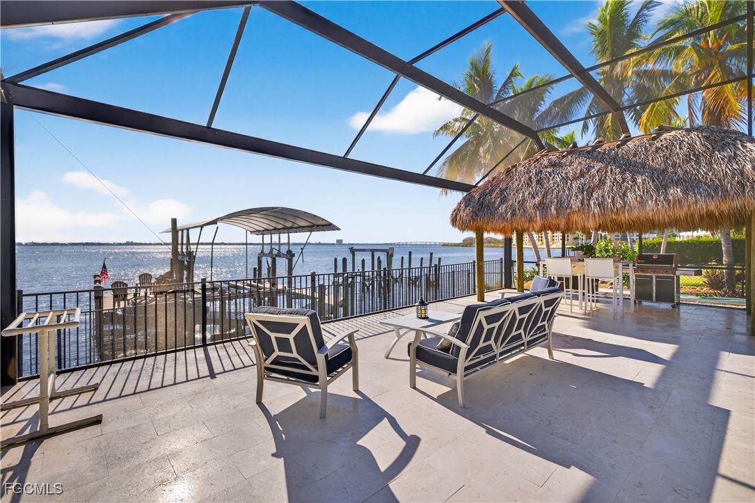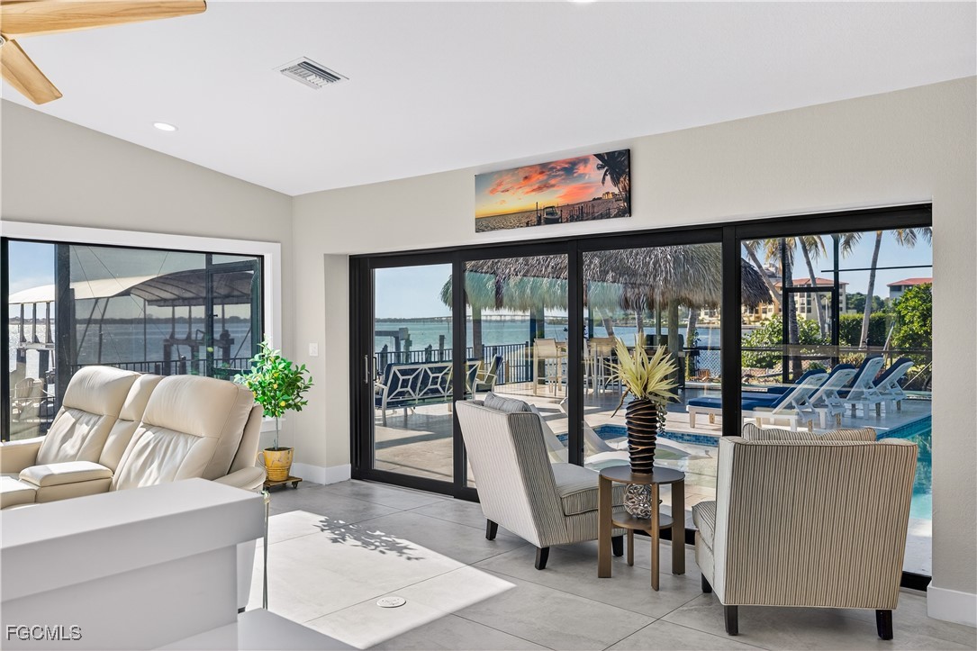 The expansive outdoor living area captures true resort-style ambiance with a heated gunite saltwater pool, sundeck, integrated spa, new panoramic-screened lanai, and dedicated tiki hut — all overlooking the wide Caloosahatchee River. The space is enhanced with travertine and concrete surfaces, an outdoor shower hookup, and newly added fencing along the back side for privacy. Pet-friendly turf ensures a low-maintenance, year-round green retreat. Panoramic sliding doors open seamlessly to the water, creating the perfect indoor-outdoor flow.