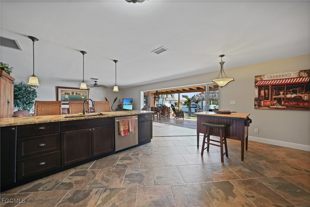 The home features 4 bedrooms, 2 bathrooms, a spacious family room, and an oversized kitchen with granite countertops and a glass fireplace. Perfect for entertaining, the outdoor area includes a Cabana Dock, outdoor kitchen, and a large covered lanai overlooking the canal.