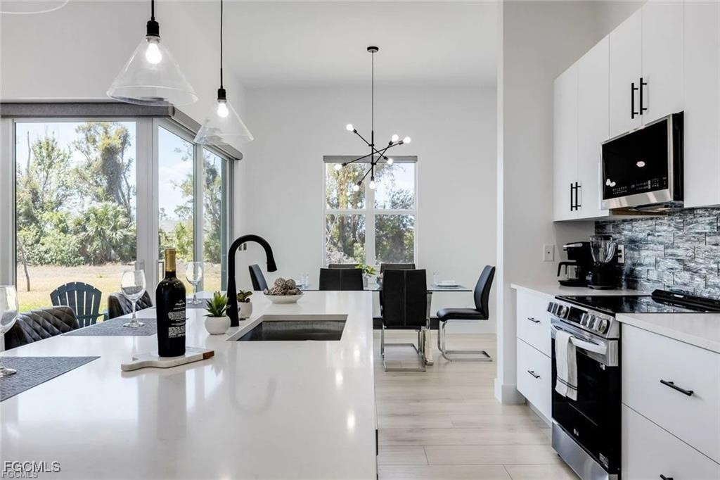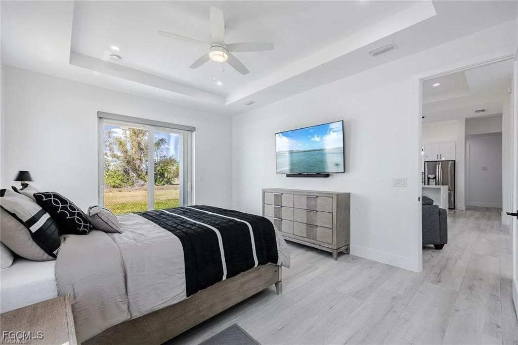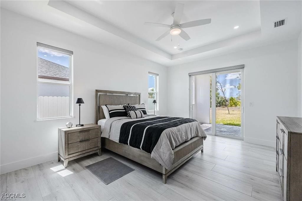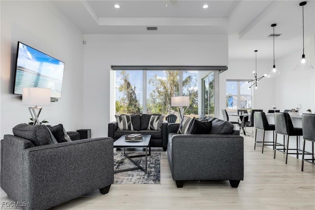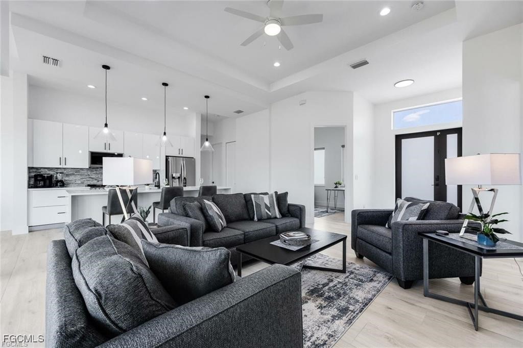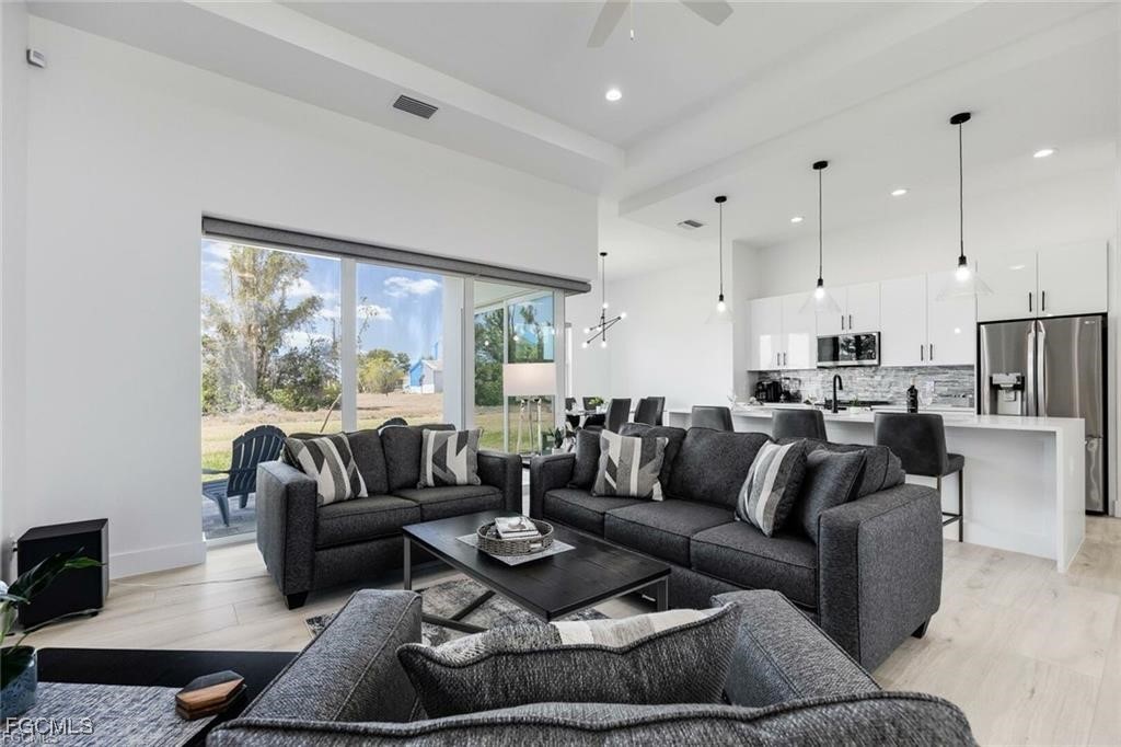 Experience modern elegance in this 2023 contemporary masterpiece located in the desirable Cape Coral. From the moment you enter, this home impresses with an open-concept design, extended coffered ceilings, and luxurious porcelain plank flooring that flows seamlessly throughout the space.